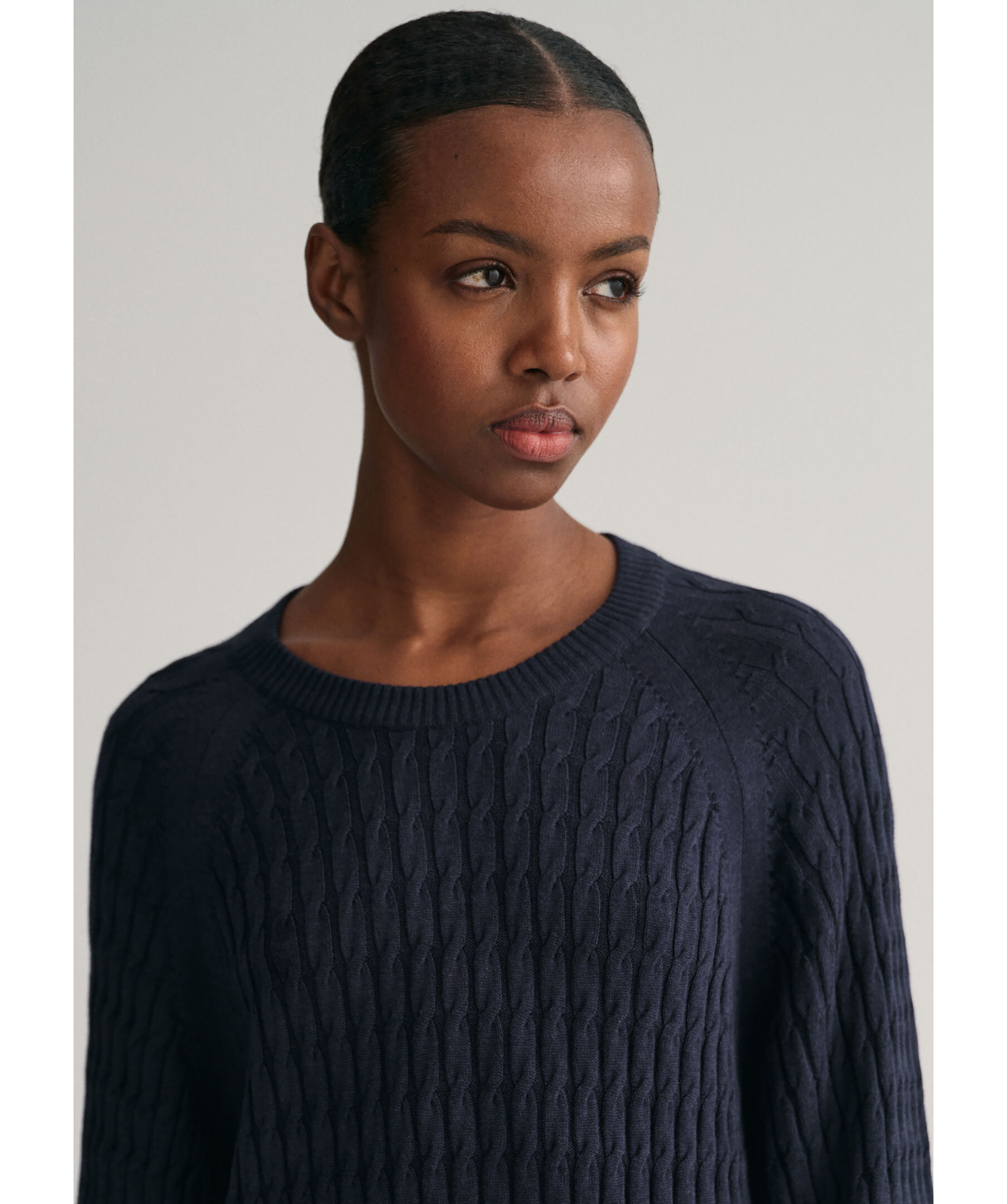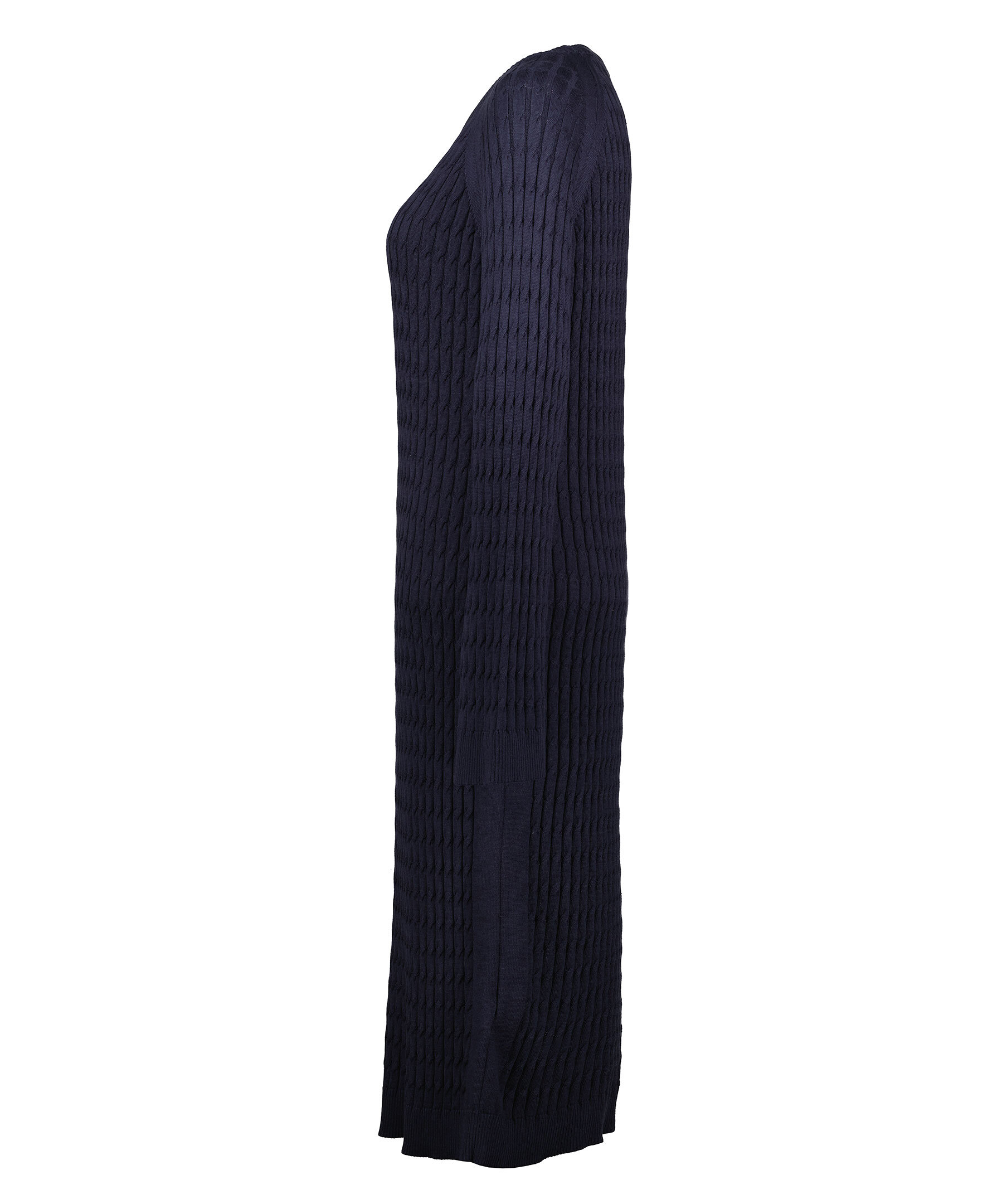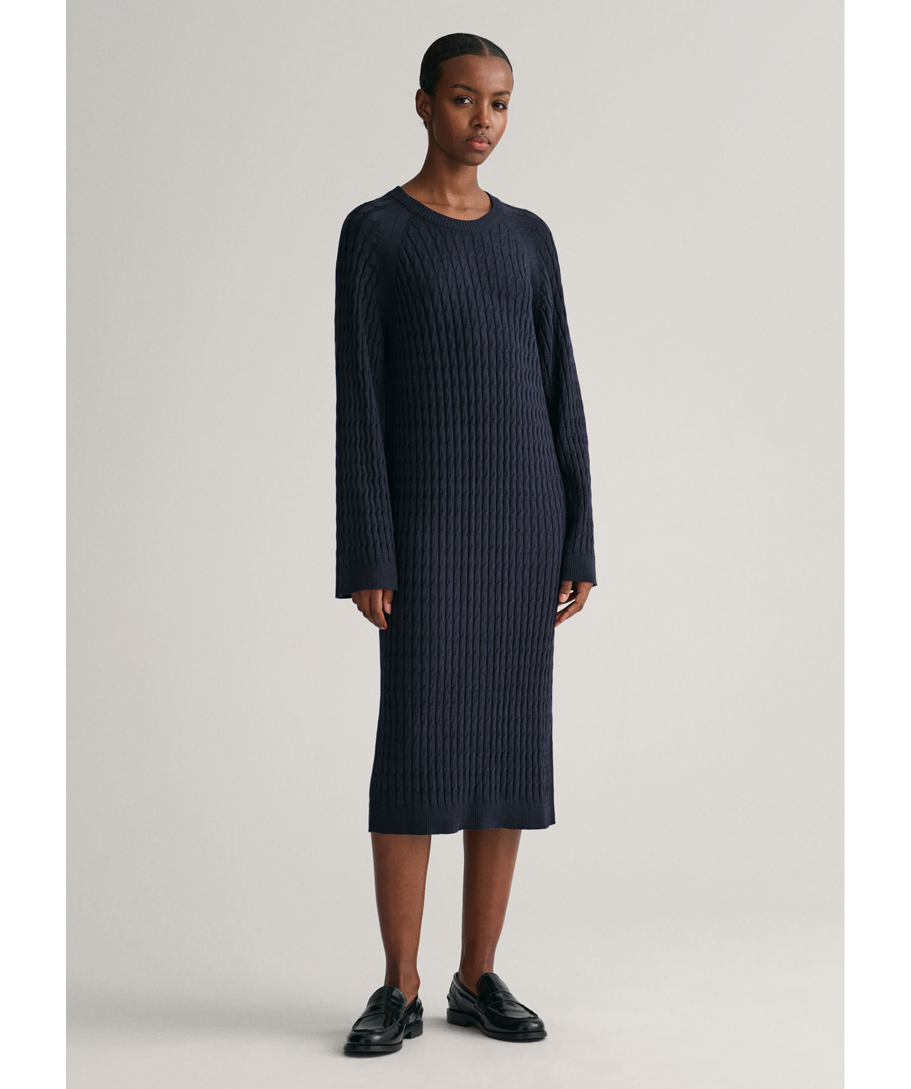 Marinblå chic klänning i glansig lyocell- och bomullsblandning med en smal kabelstickad struktur från Gant. Den har en normal passform som omfamnar kroppen på ett snyggt sätt, med mellanlång längd, klassisk rund halsringning och raka, mellanlånga ärmar. Ett snyggt plagg som kan dressas både upp och ner beroende på tillfälle.