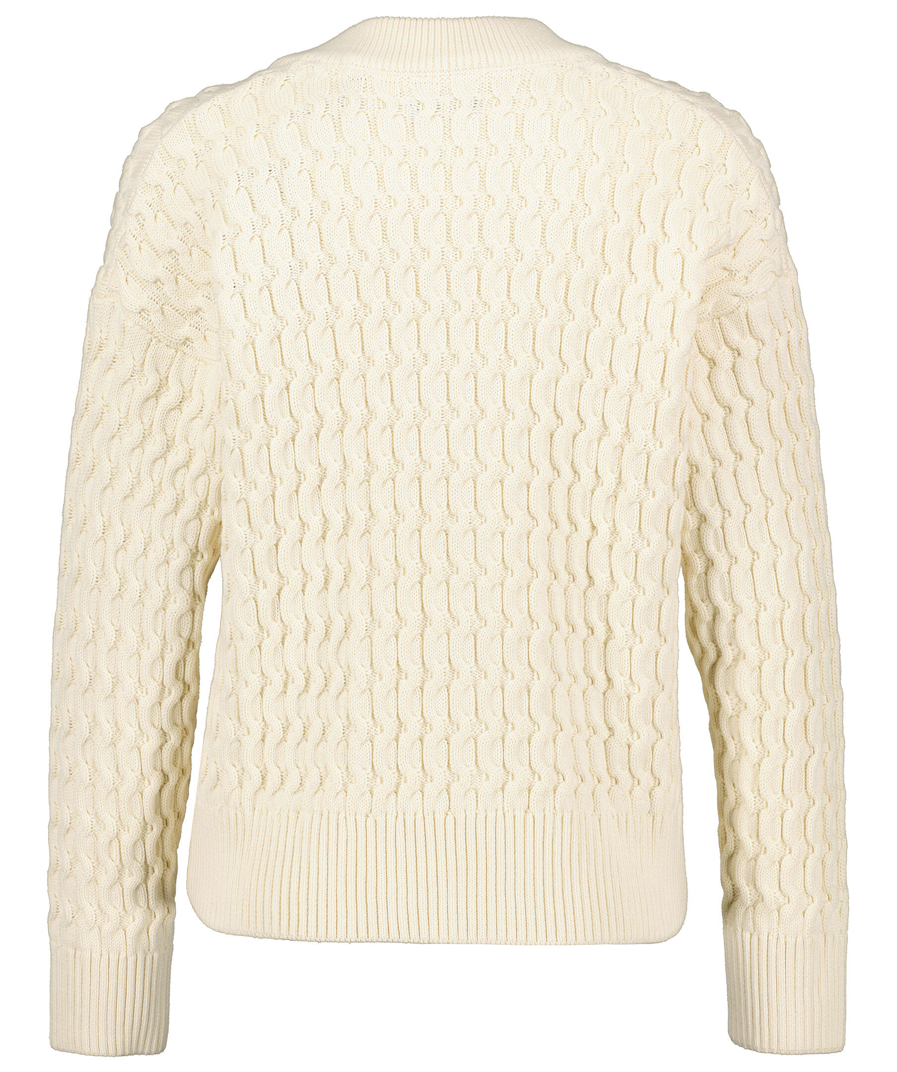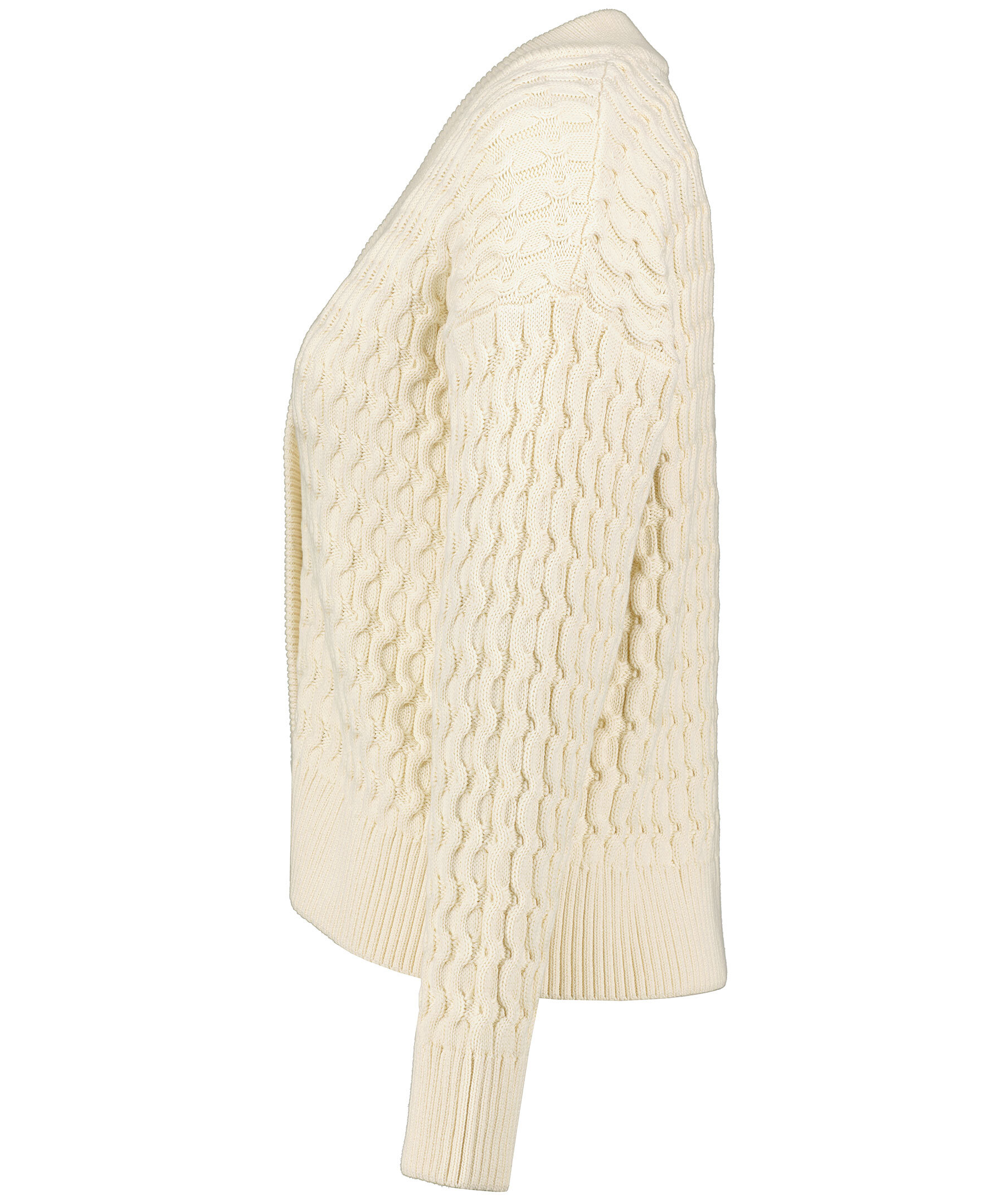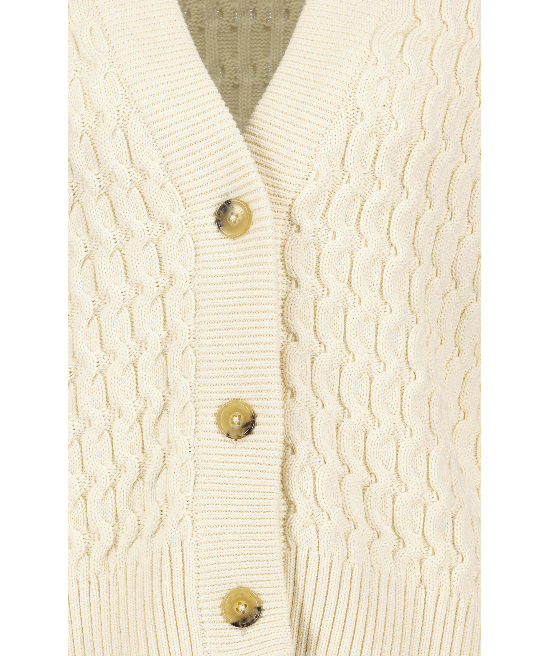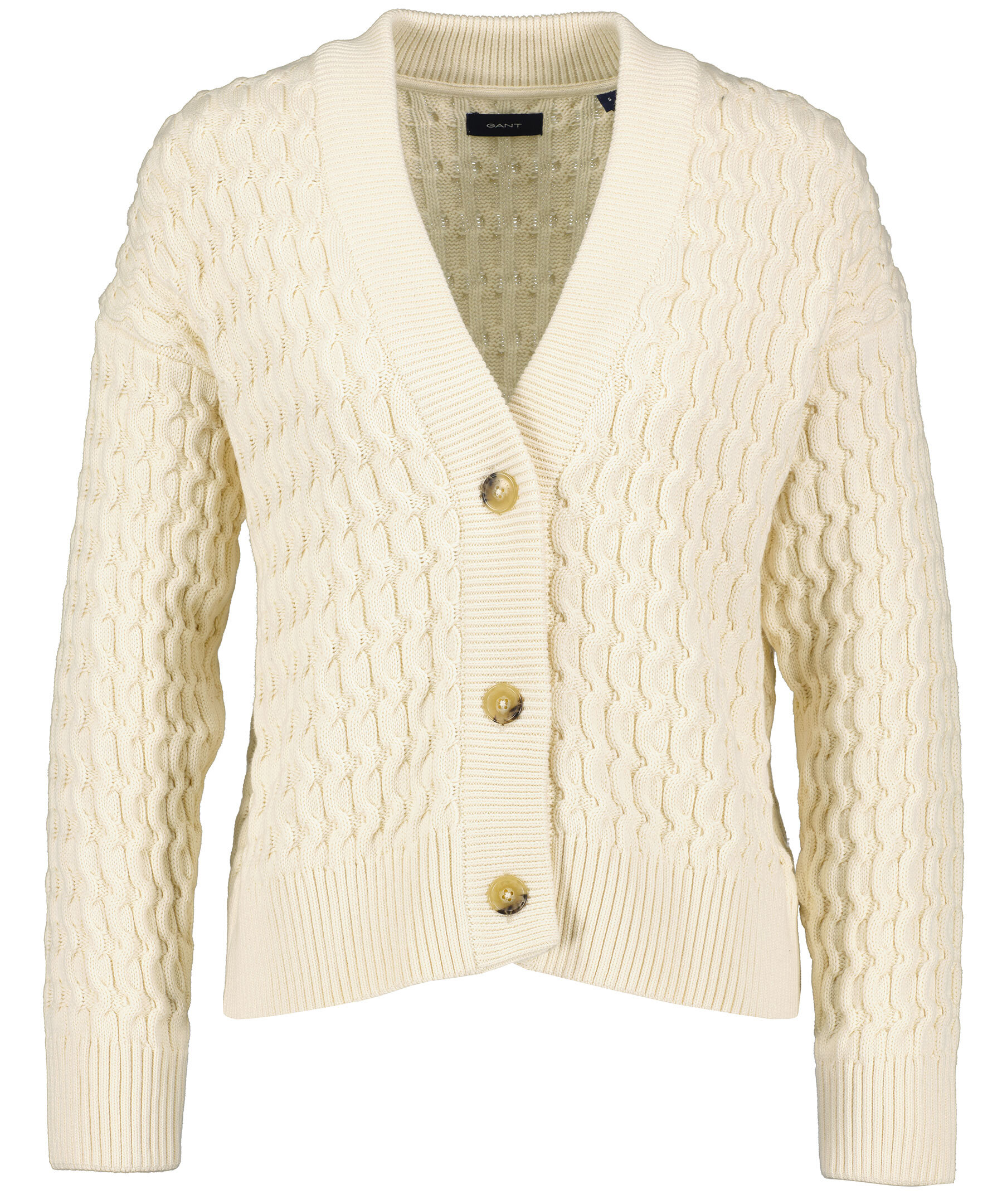 Krämvit kabelstickad cardigan från Gant. Ribbstickade muddar, V-ringning och stängs med knappar framtill. Gjord i 100% bomull.