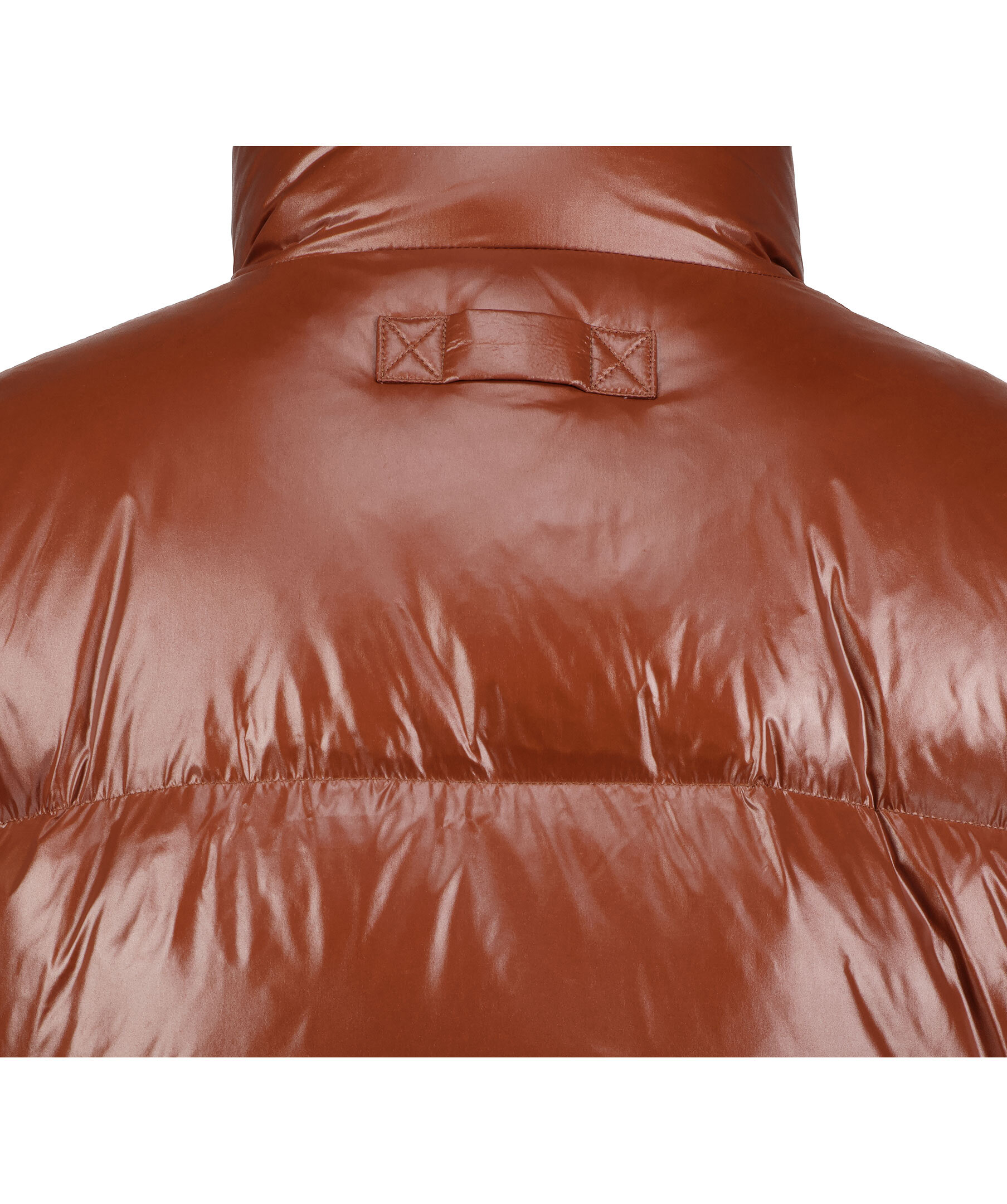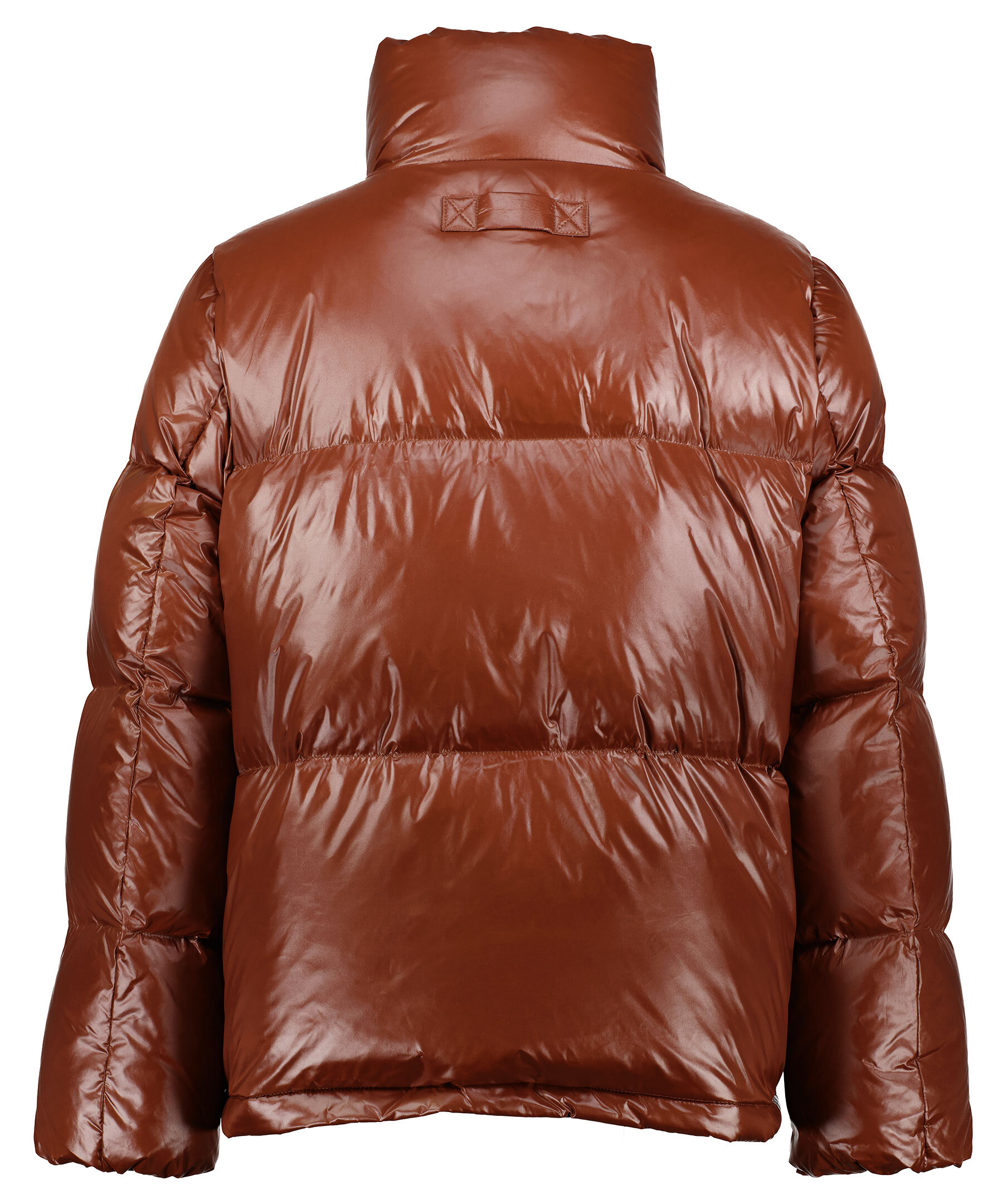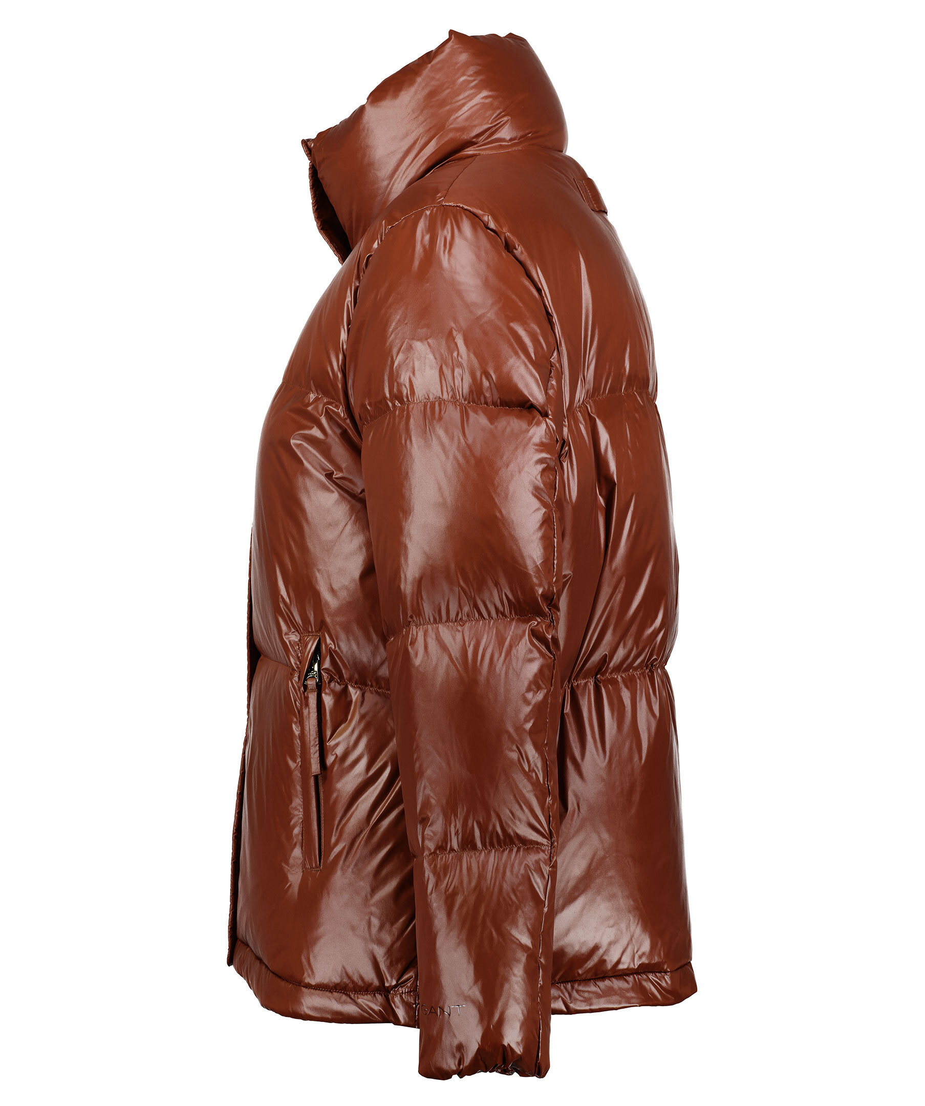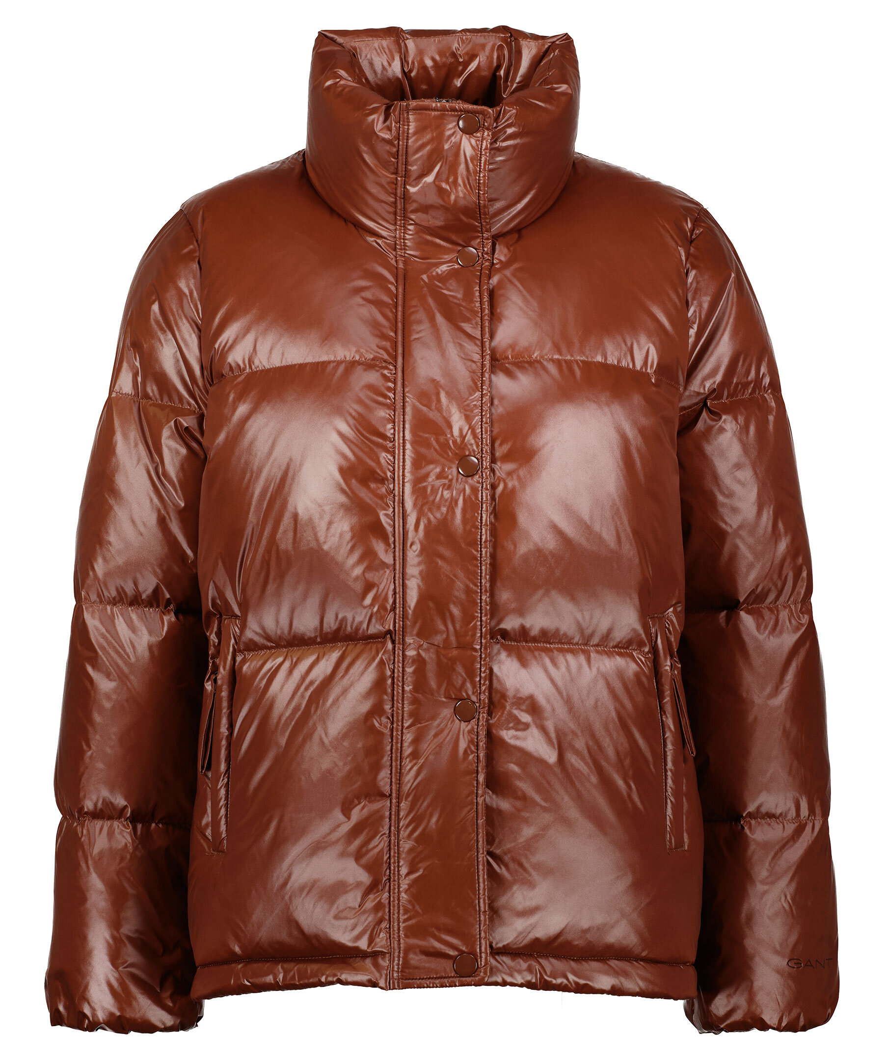 Brunröd croppad dunjacka från Gant. Jackan är gjord i ett glansigt nylontyg med en vattenavvisande yta. Avslappnad och kort passform. Panelsydd, ståkrage och stängs med dragkedja och tryckknappar. Muddar med resår, två framfickor och en innerficka.
