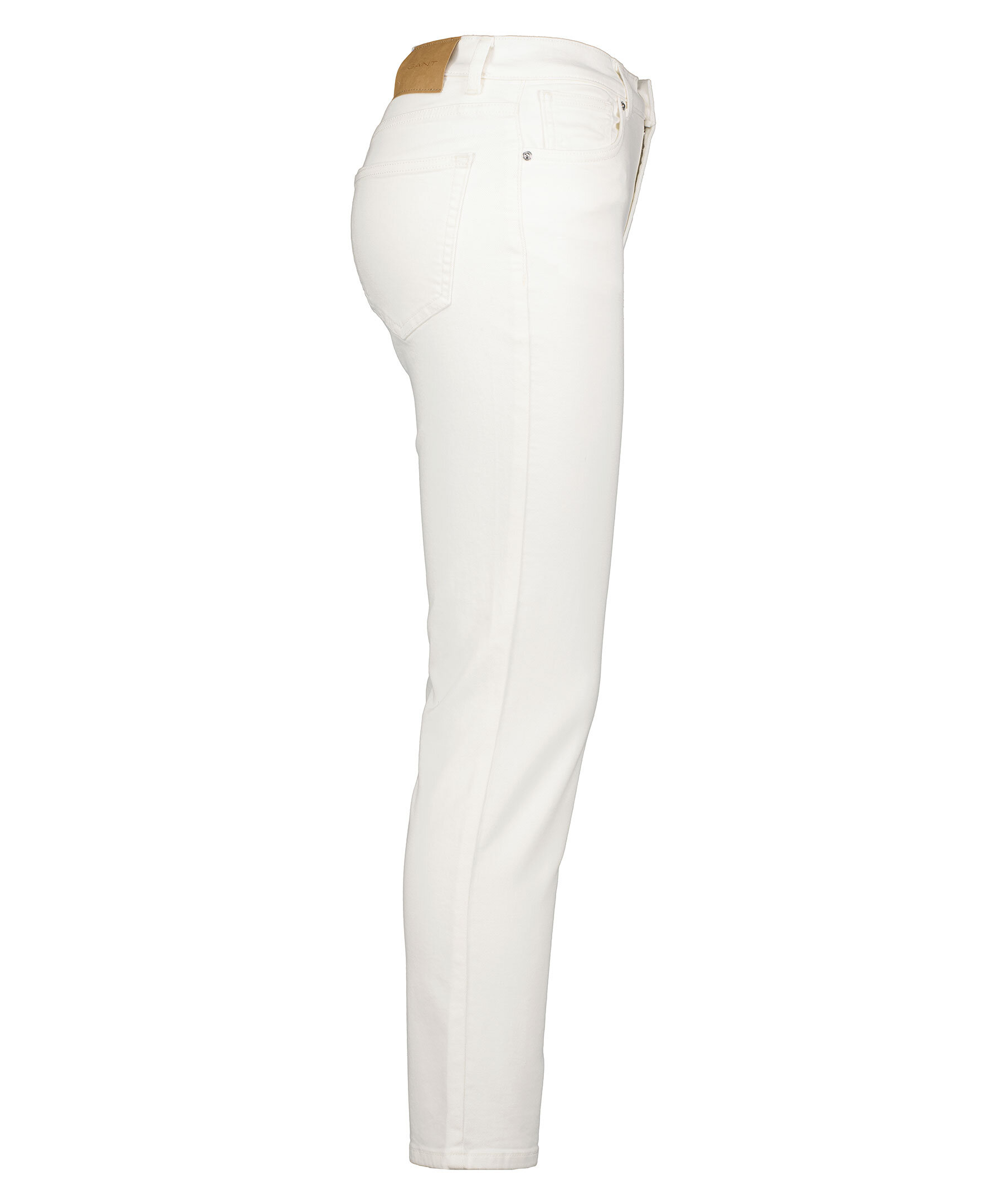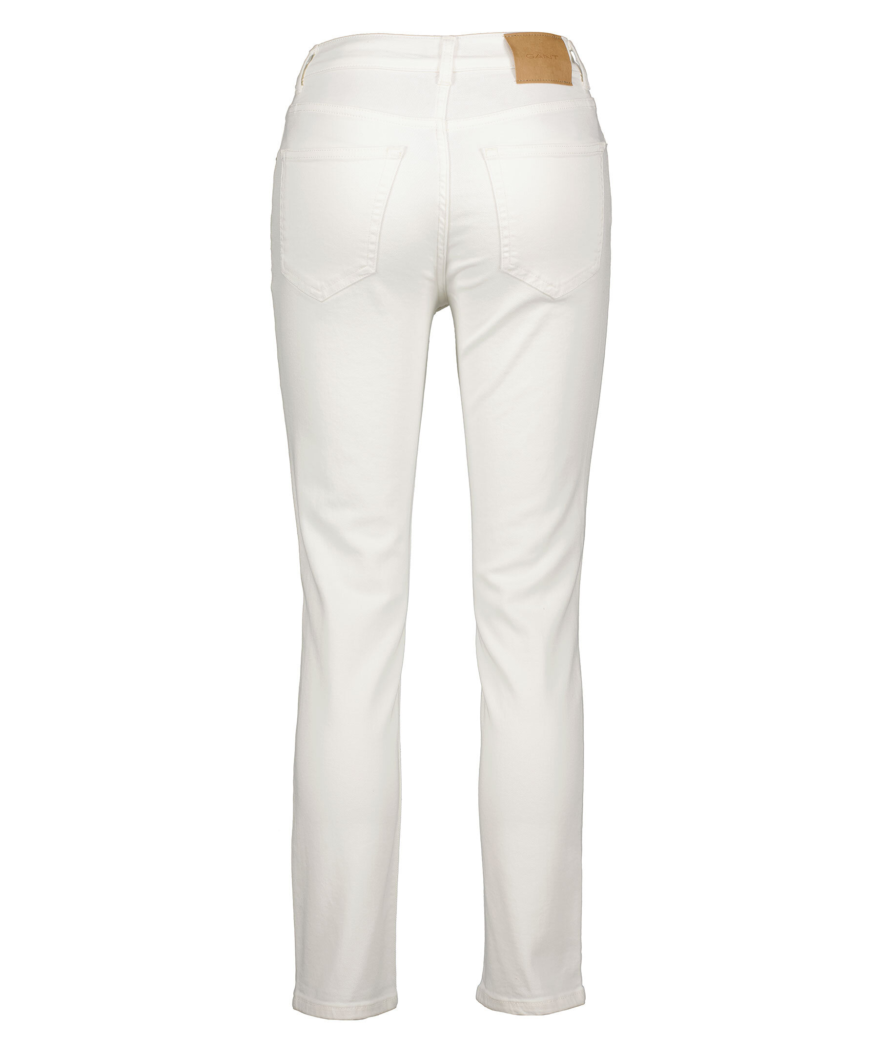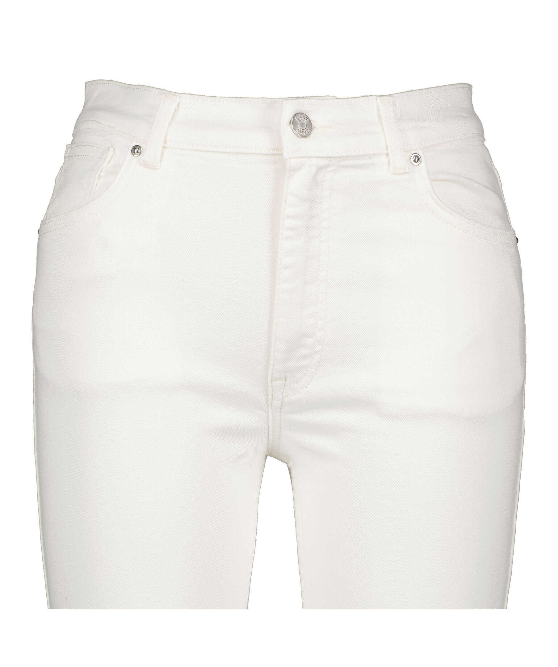 Vita slim fit jeans i croppad modell från Gant. Hög midja och kortare ben. Smal och stretchig passform. Fem fickor, hällor för bälte i midjan och stängs med dold gylf med dragkedja och knapp.