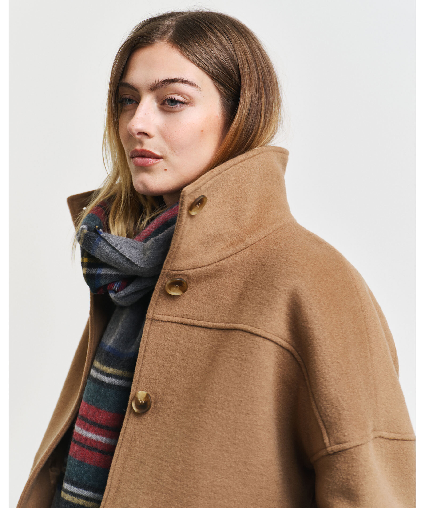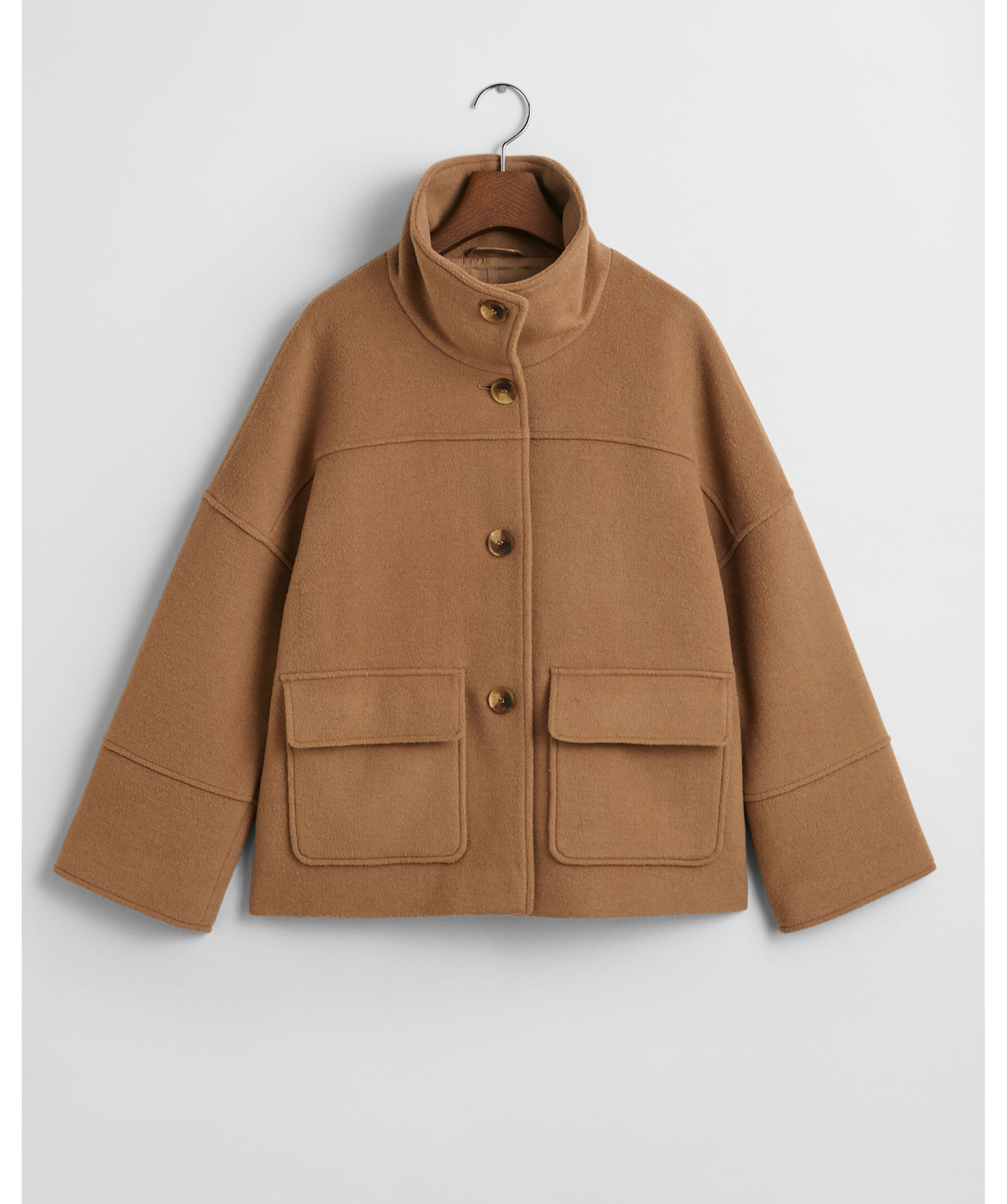 Beige brun jacka från Gant. Jackan har en bredare siluett, stängs framtill med knappar. Har två framfickor med lock och en högre krage. Tillverkad av en ullblandning.
