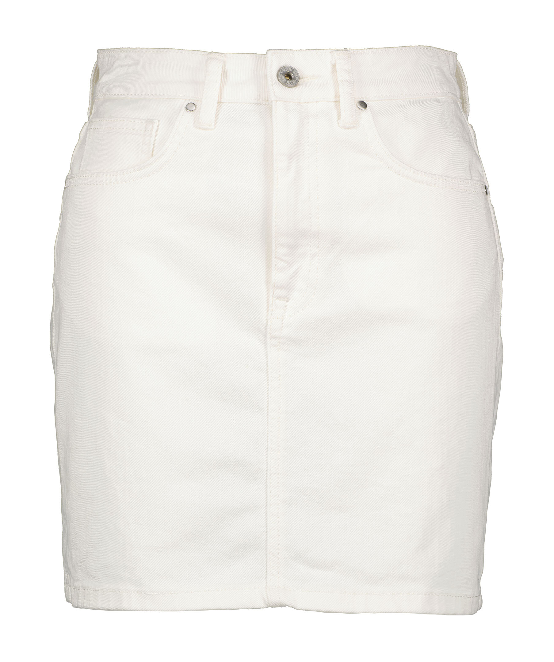 Vit jeanskjol från Gant. Femficks modell och patch i läder med stansad logotyp bak i linningen. A-linjeformad och slutar mitt på låret samt har fina detaljer med beigea sömmar.