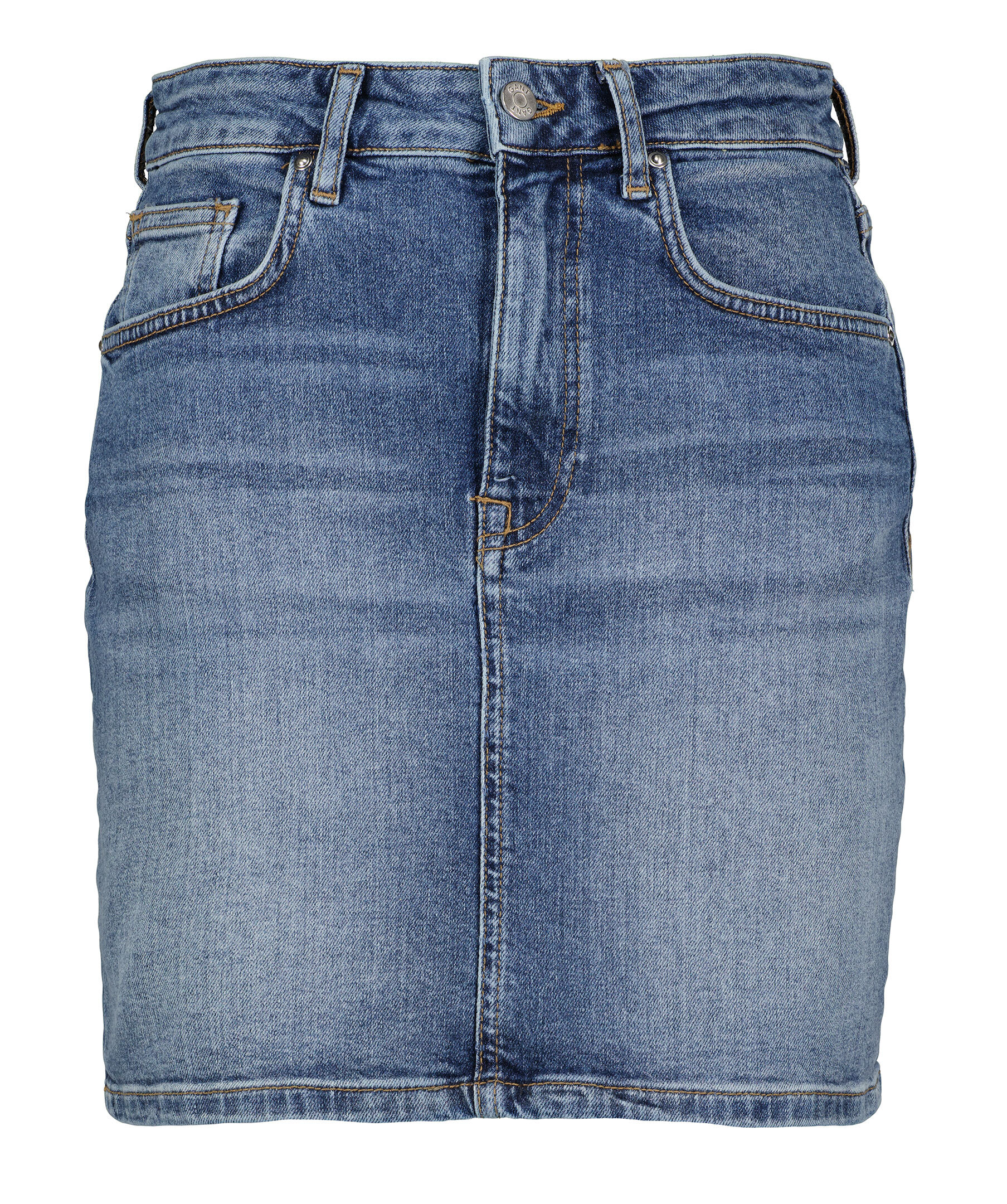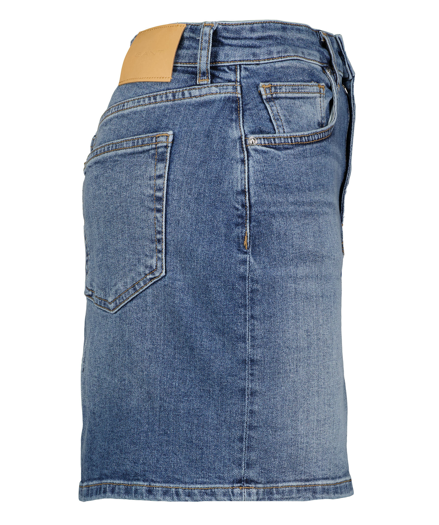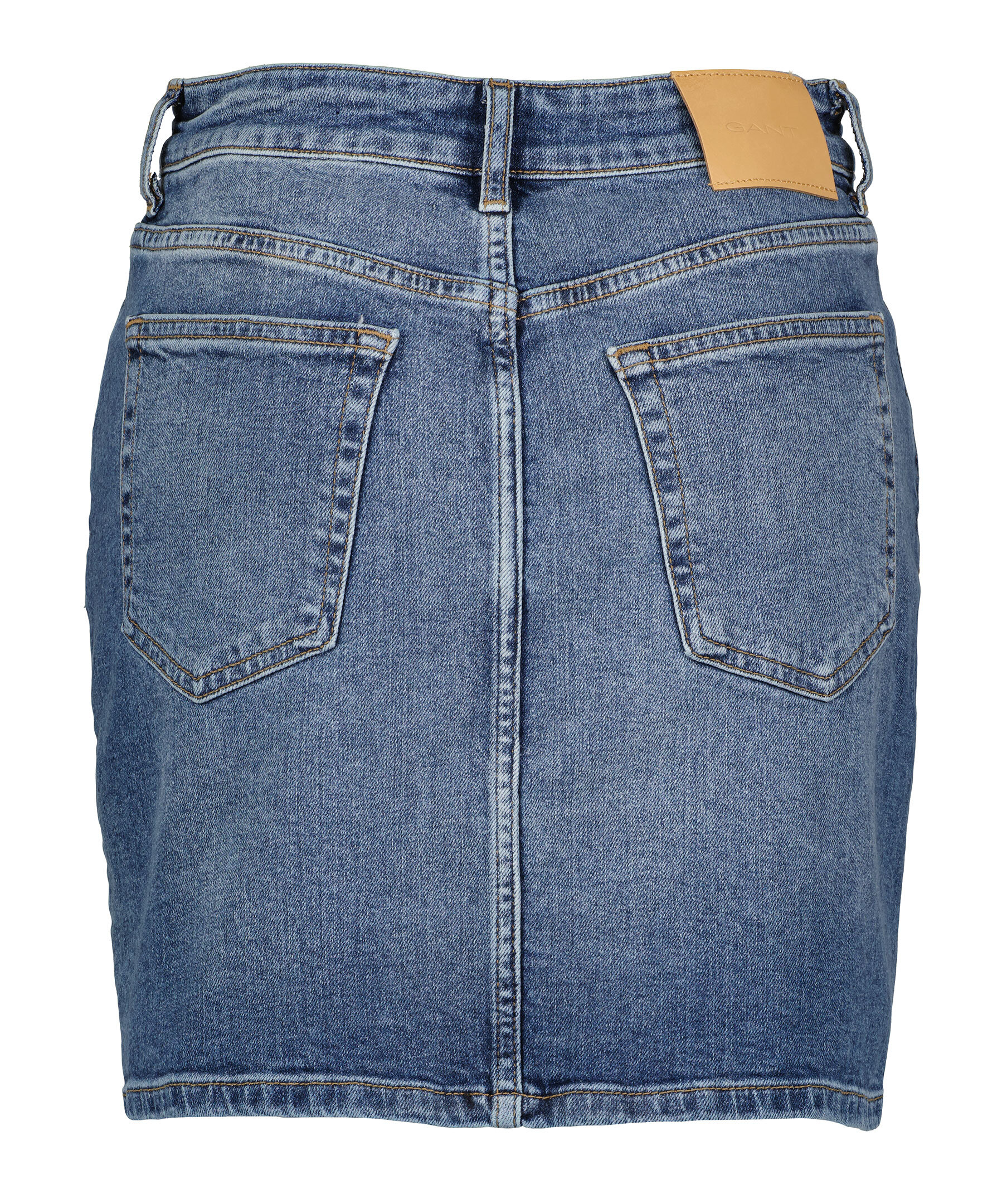 Ljusblå jeanskjol från Gant. Femficks modell och patch i läder med stansad logotyp bak i linningen. A-linjeformad och slutar mitt på låret samt har fina detaljer med beigea sömmar.