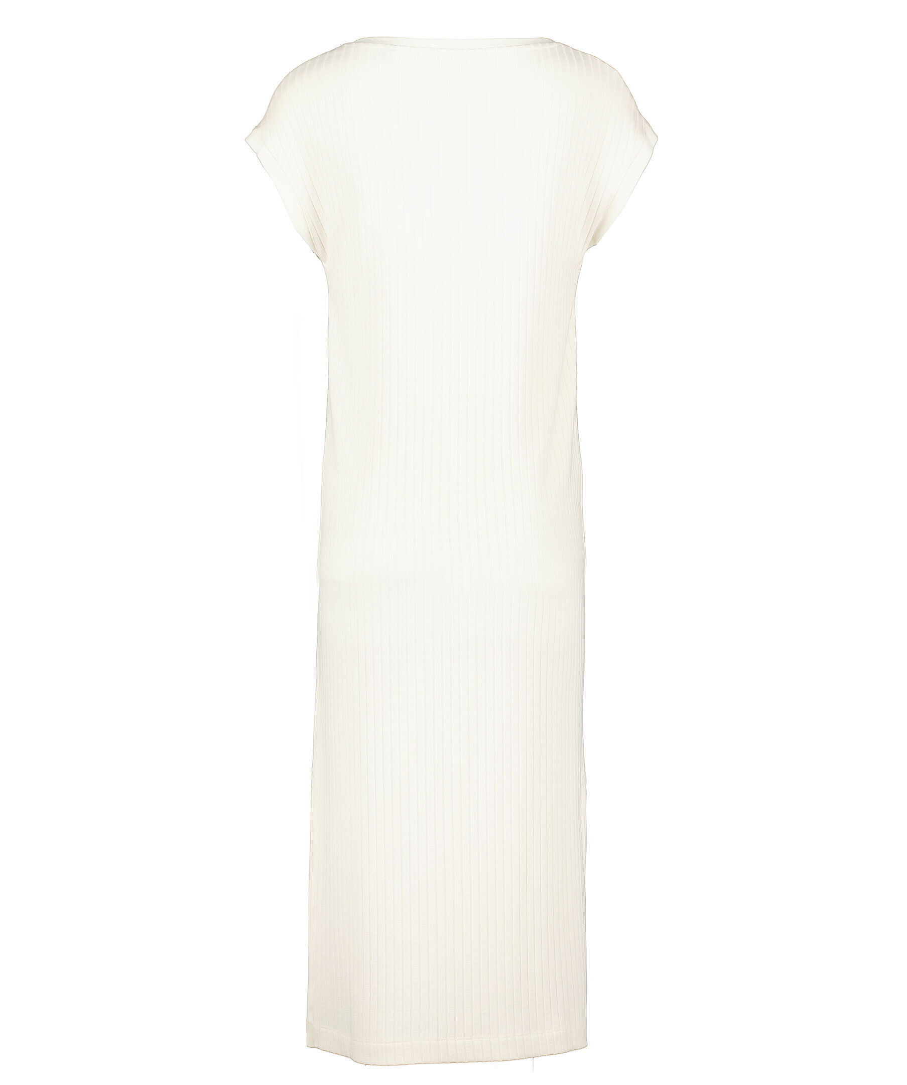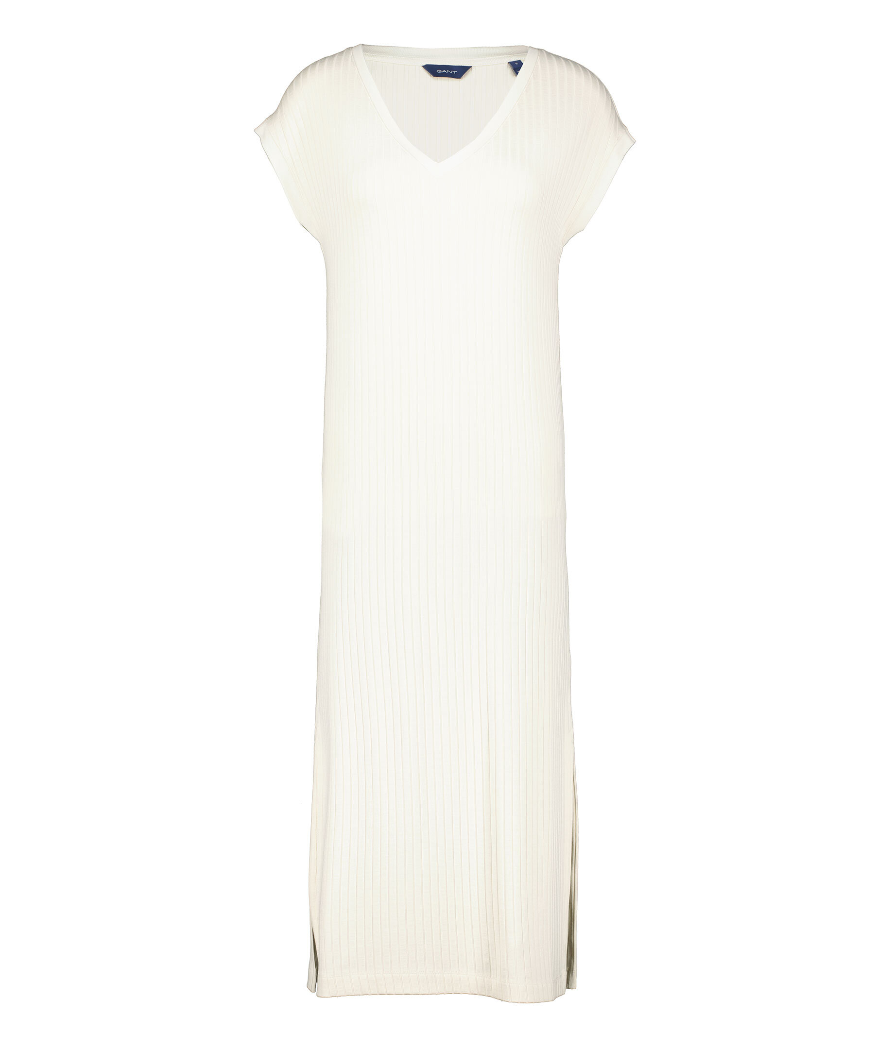 Benvit, ärmlös ribbad jerseyklänning från Gant. V-ringad. Relaxed fit. Slitsar i sidorna. Tillverkad i viskos blandning.