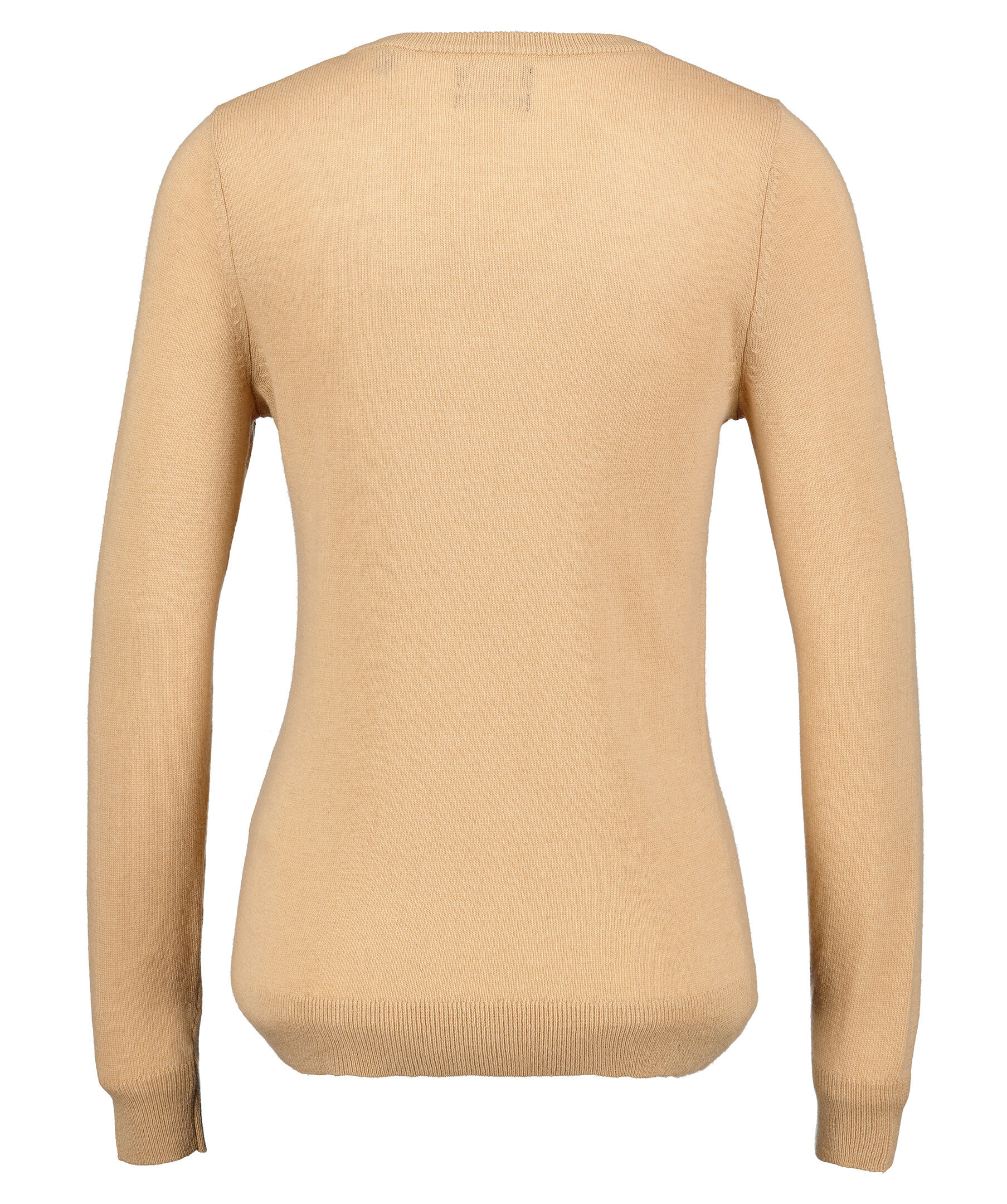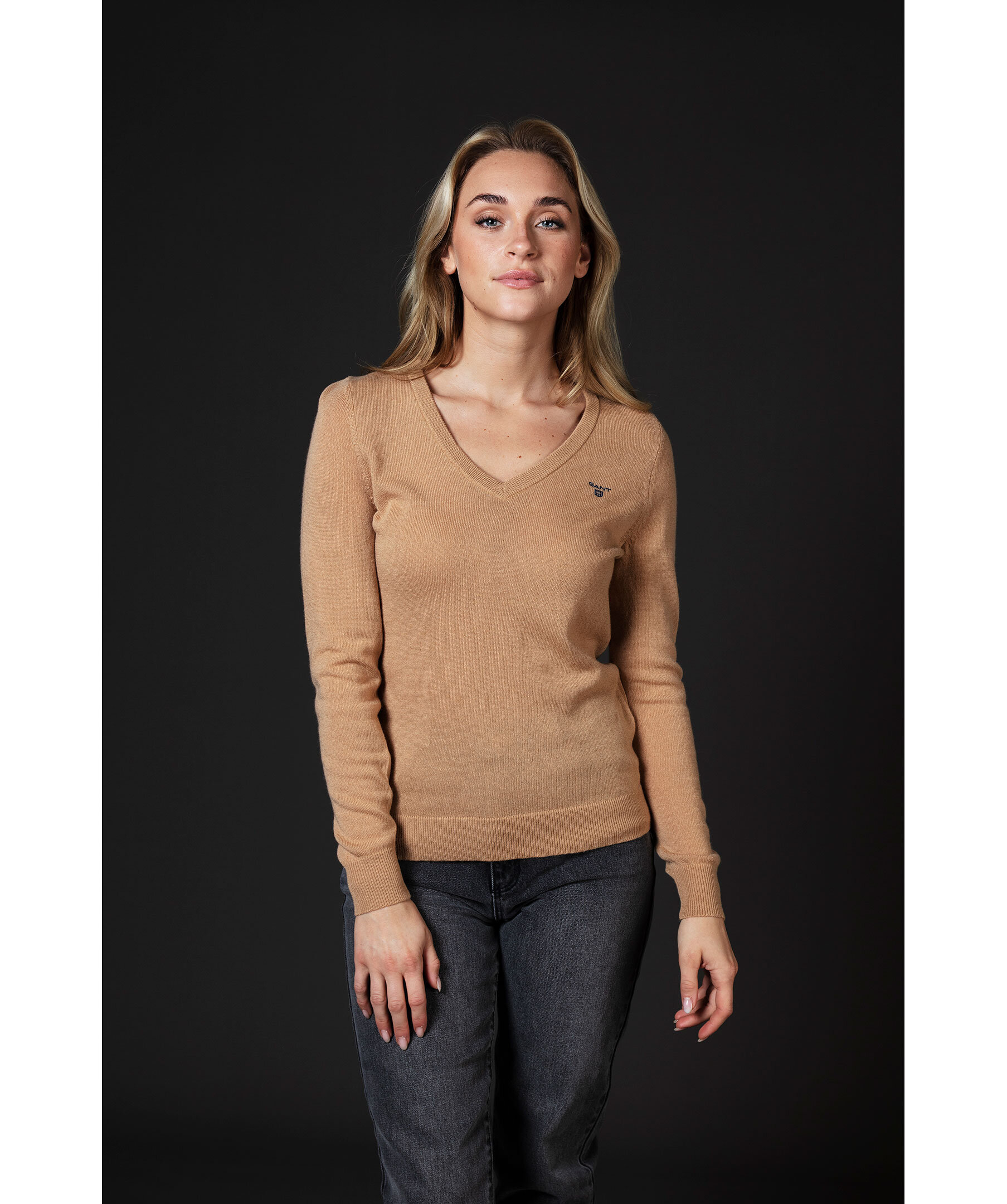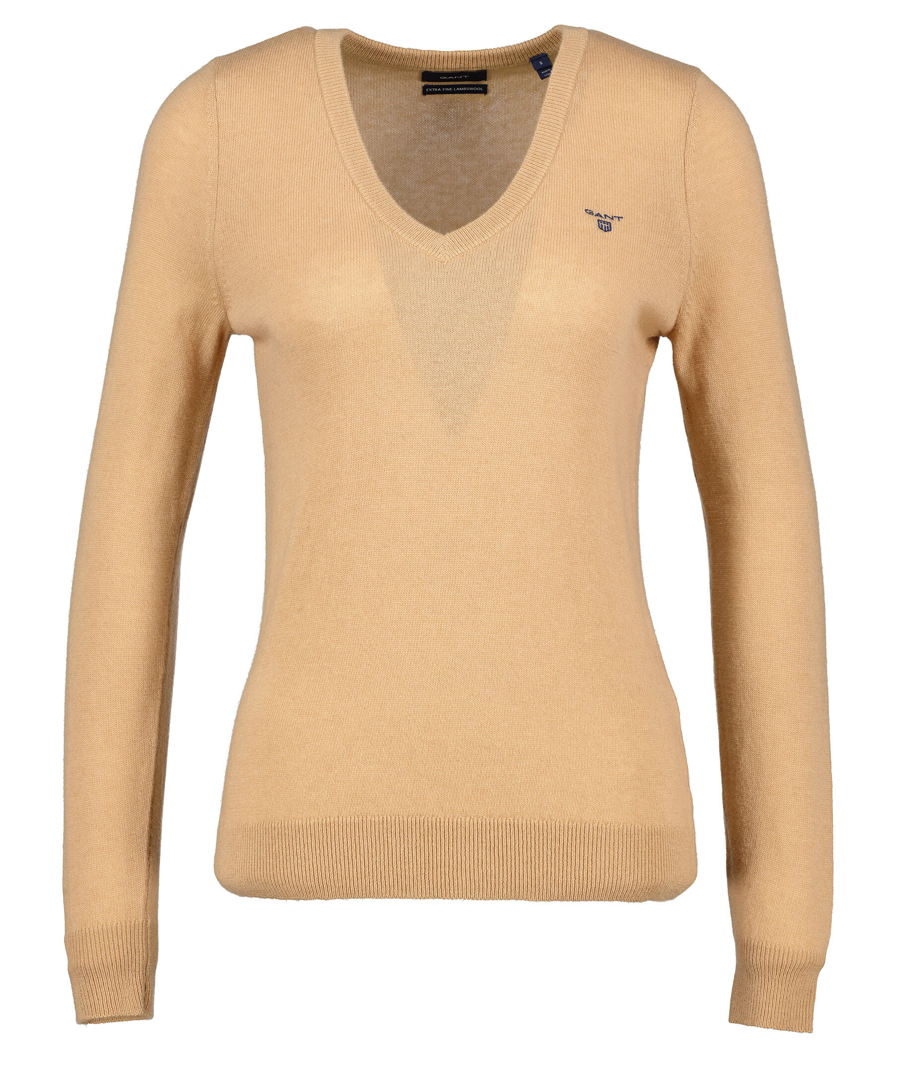 Beige finstickad V-ringad tröja från Gant. Tröjan är gjord i ett tunt superfint lammullsmaterial. Normal passform, ribbstickade muddar och broderad logotyp på bröstet. Perfekt att använda som en pullover.