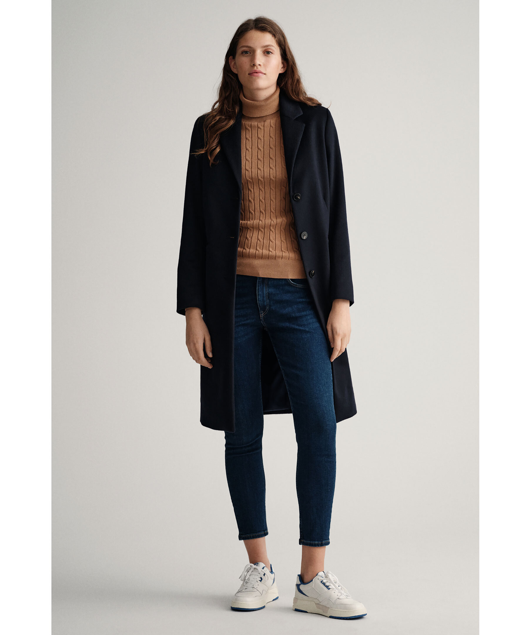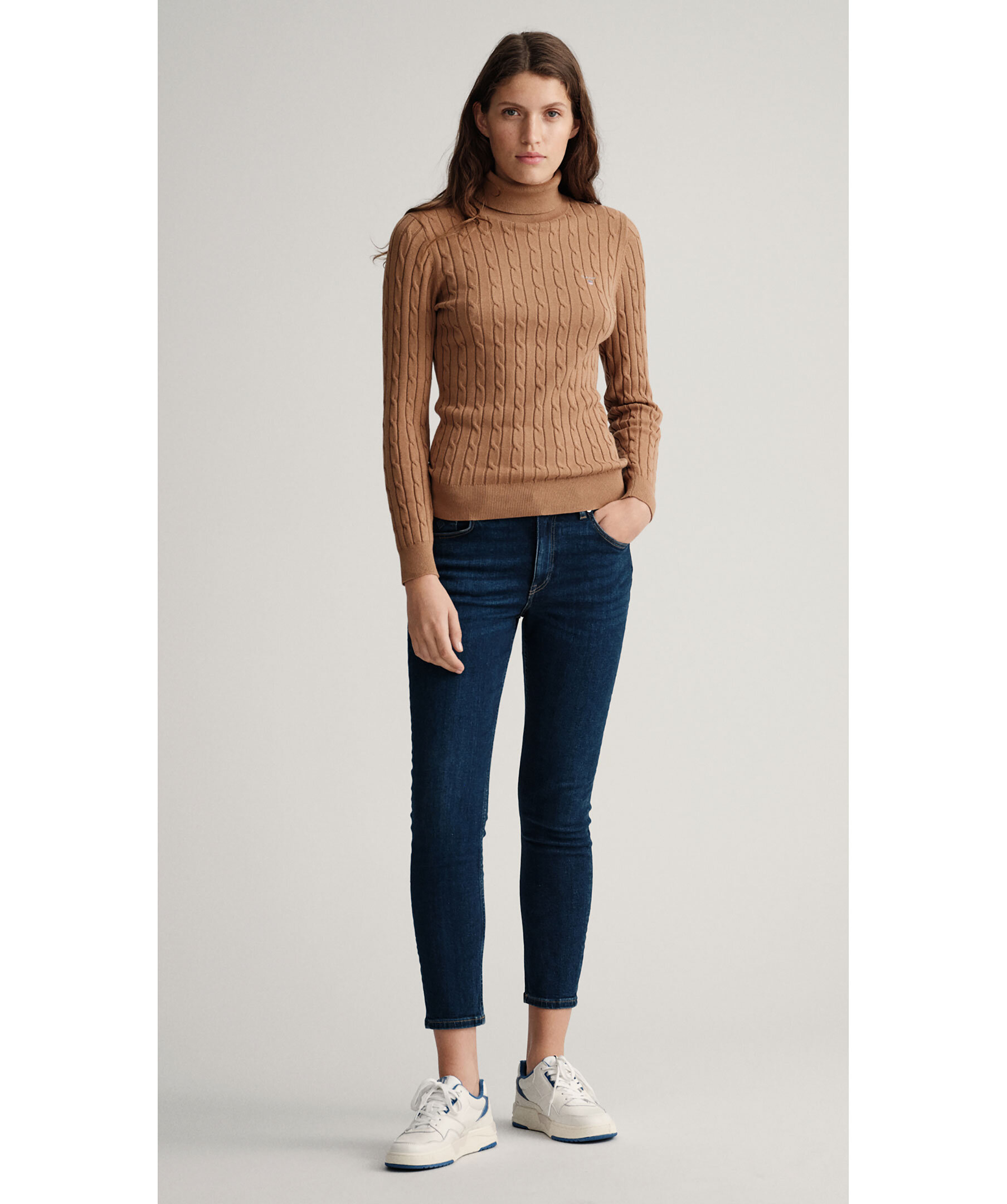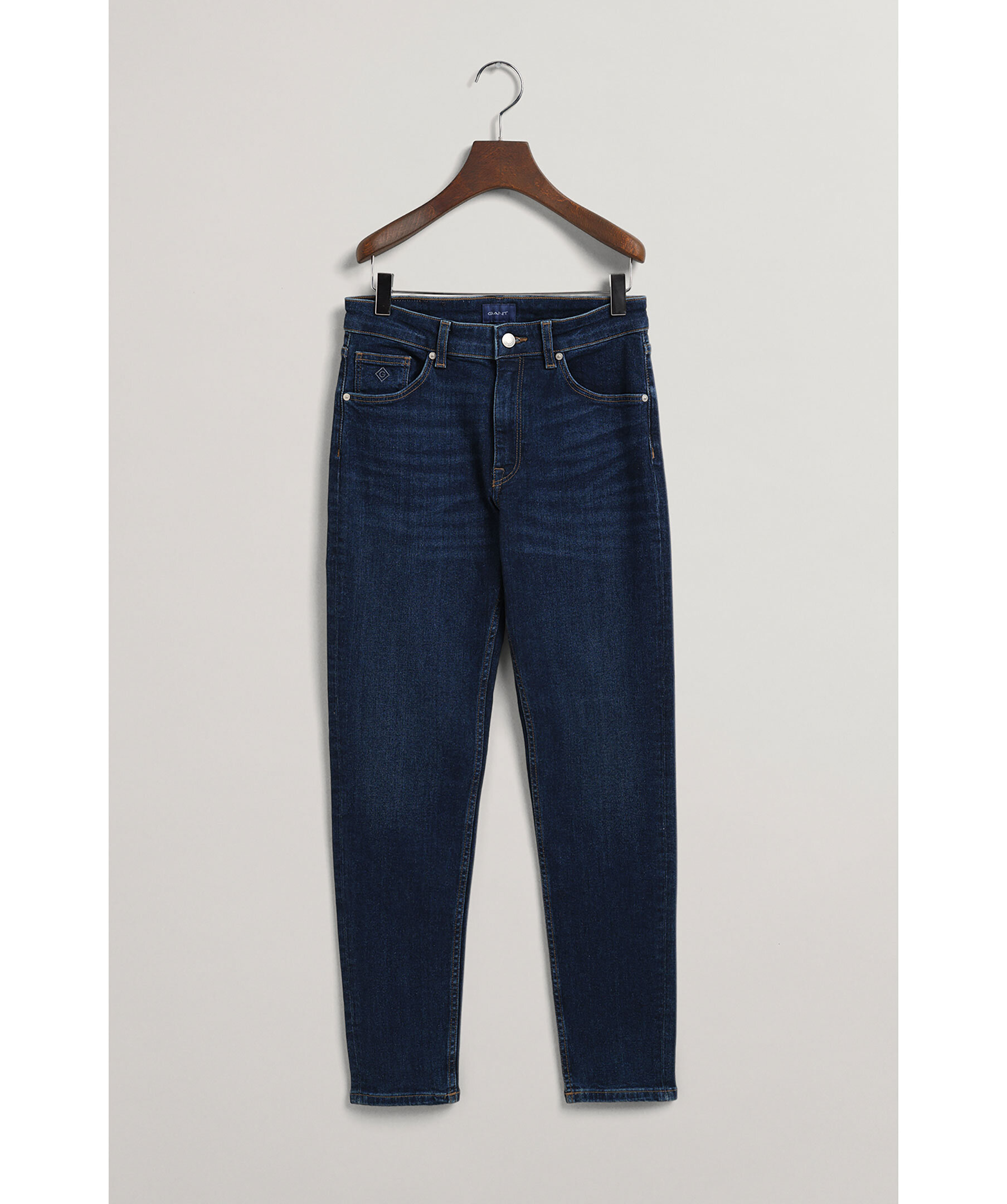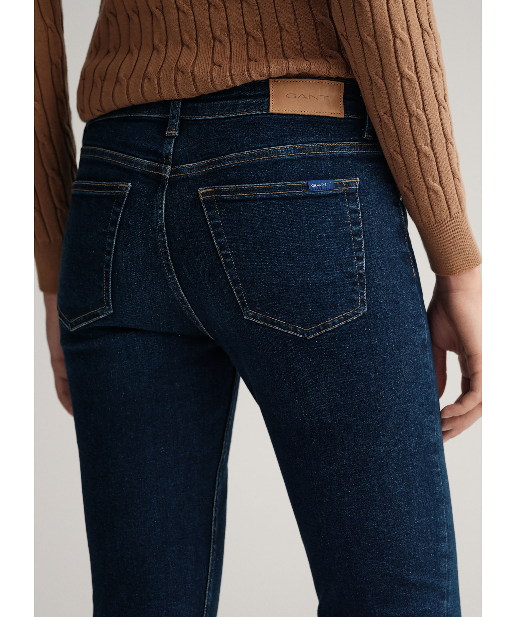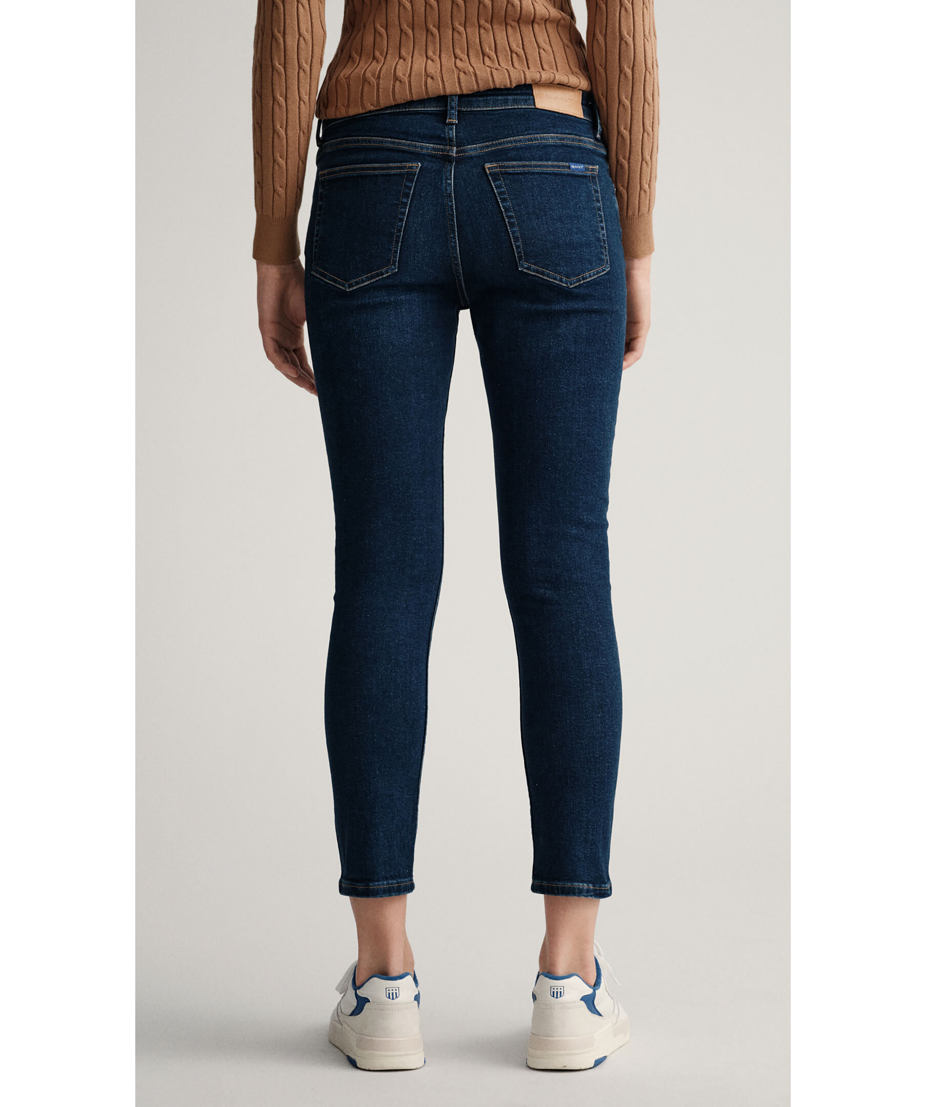 Blåa jeans från Gant. Croppade ben i slimfit modell med medelhög midja. Hällor för bälte i midjan, fem fickor och patch i läder med logotyp på bak.