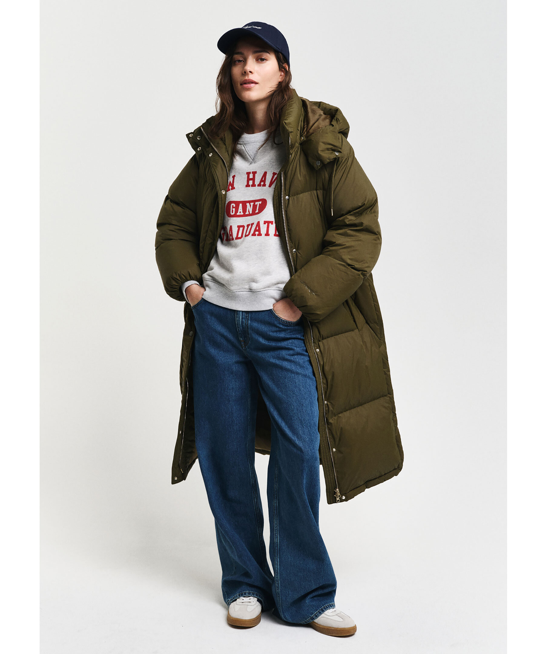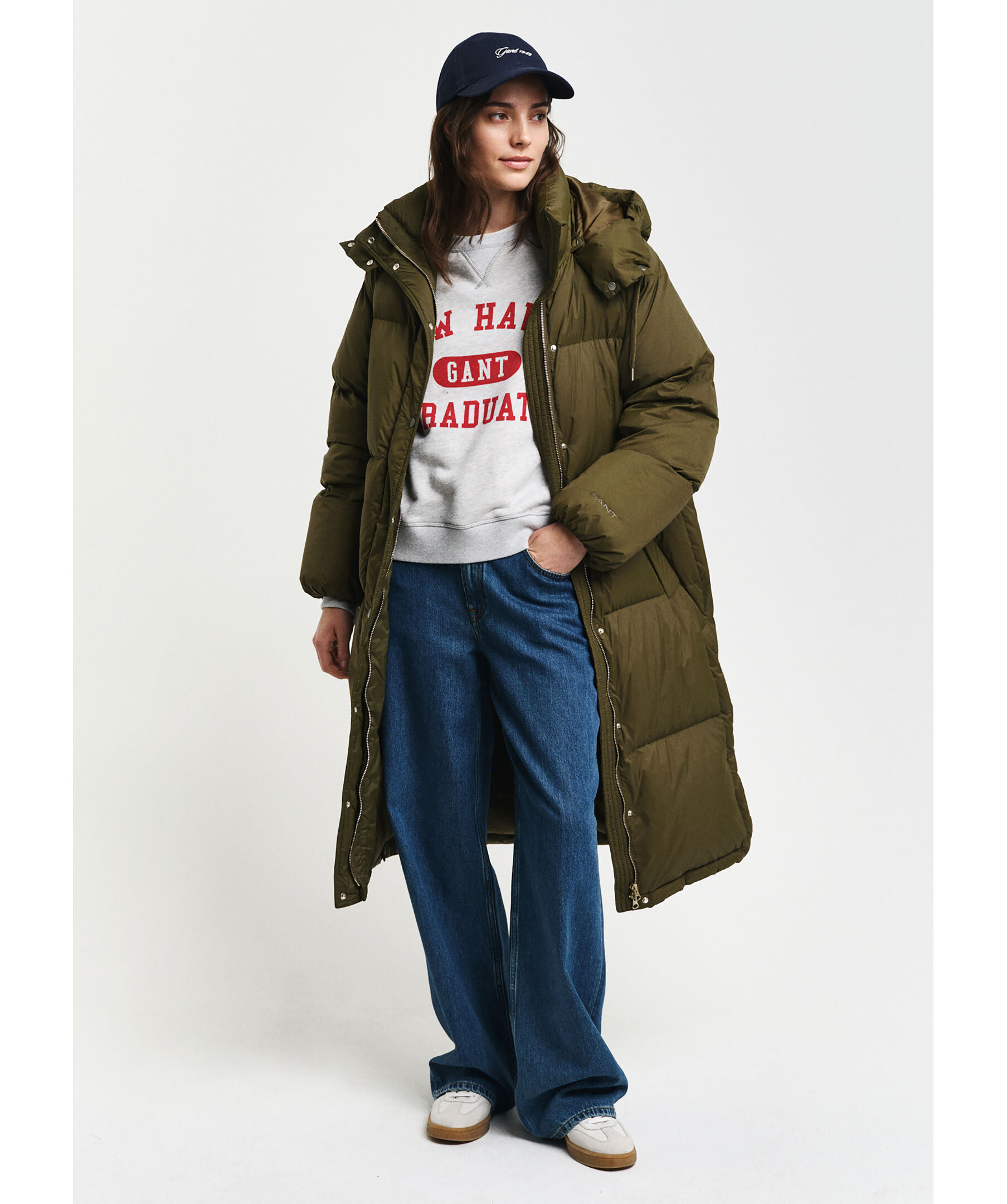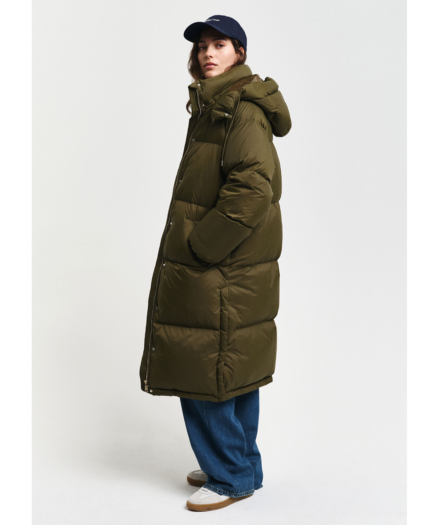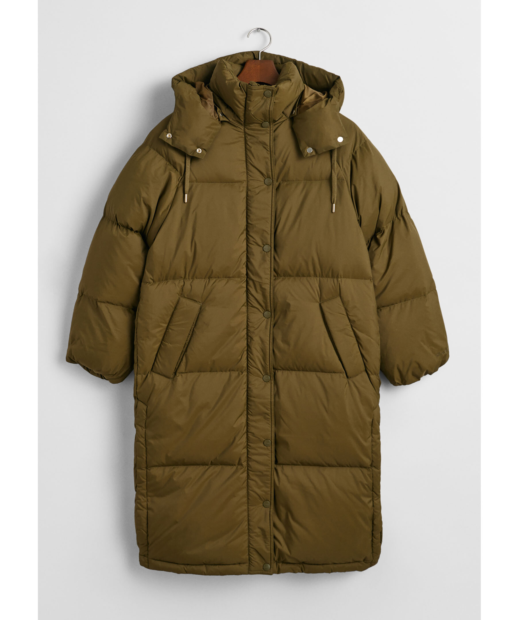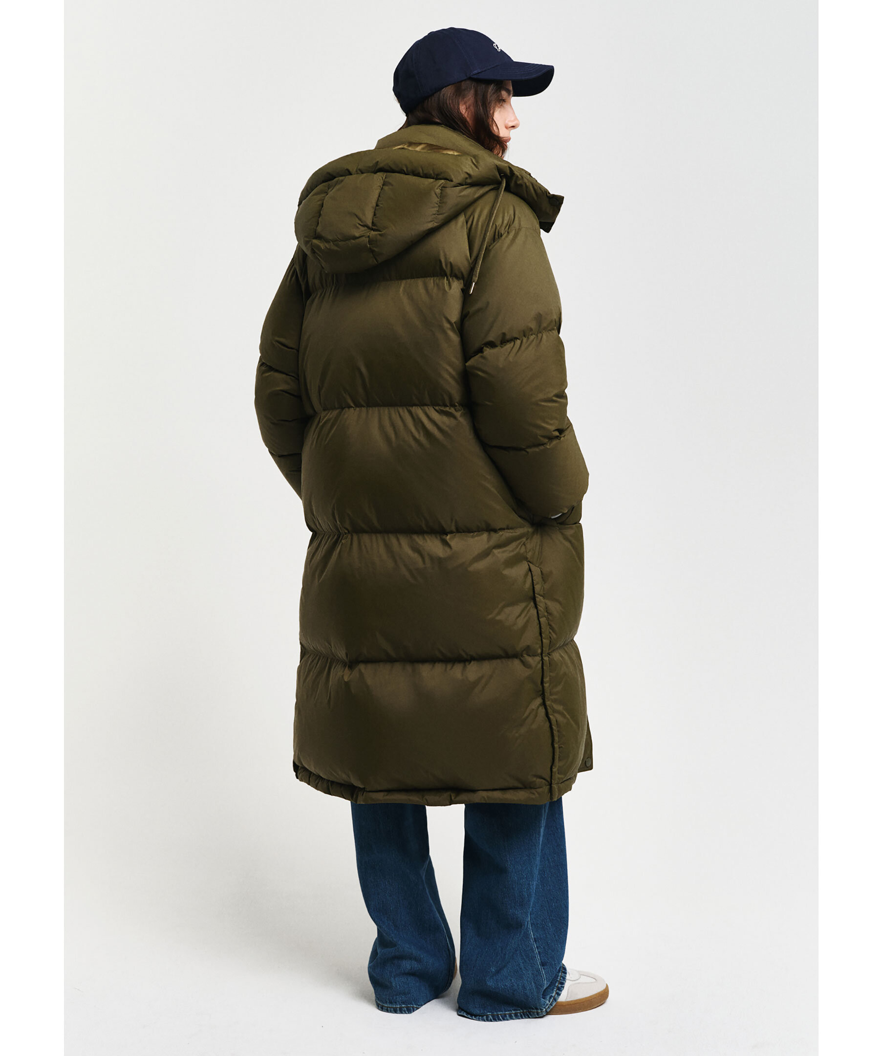 Olivgrön, lång pufferjacka från Gant. Jackan stängs med tvåvägsdragkedja och har avtagbar och justerbar huva, tryckknappar med logotyp, innerficka, och två passpoalfickor fram. Andra detaljer är raglanärmar med resår i ärmsluten samt dragsko i midjan för en åtsmitande passform. Jackan har jacquardfoder med logotyp och en GANT-logotyp i gummi på ärmen. Vattenavvisande och slutar vid nedre delen av vaden. Tillverkad i polyamid med dunfyllning.