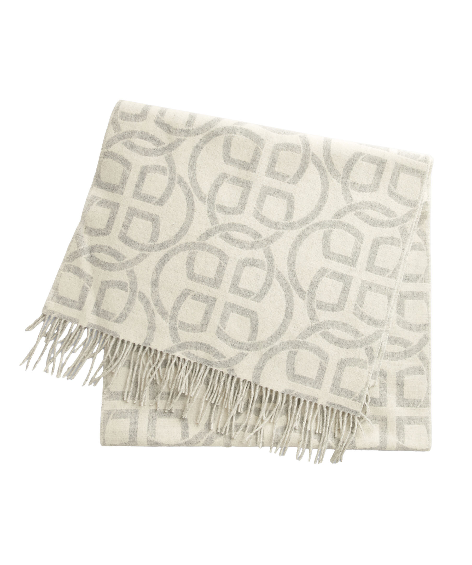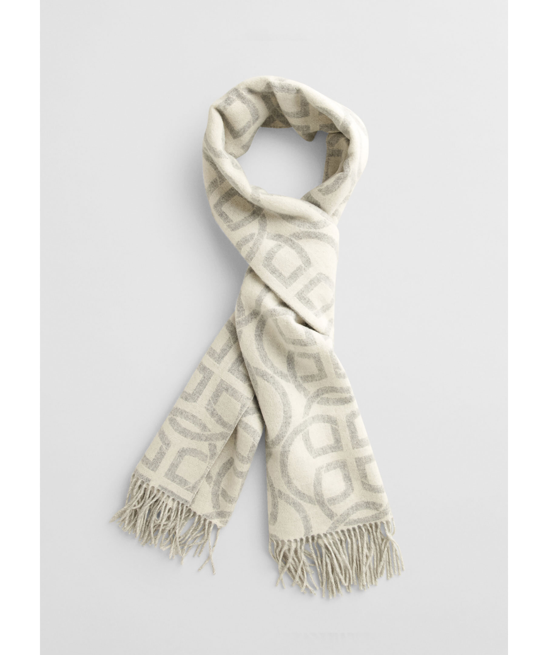 Grå och benvitsfärgad halsduk från Gant. Halsduken har fransar i kanterna, broderad GANT-logotyp längst ner och ett heltäckande G-mönster i jacquard. Halsduken är vändbar och tillverkad i 100% merinoull. Mått: 180 x 50cm.