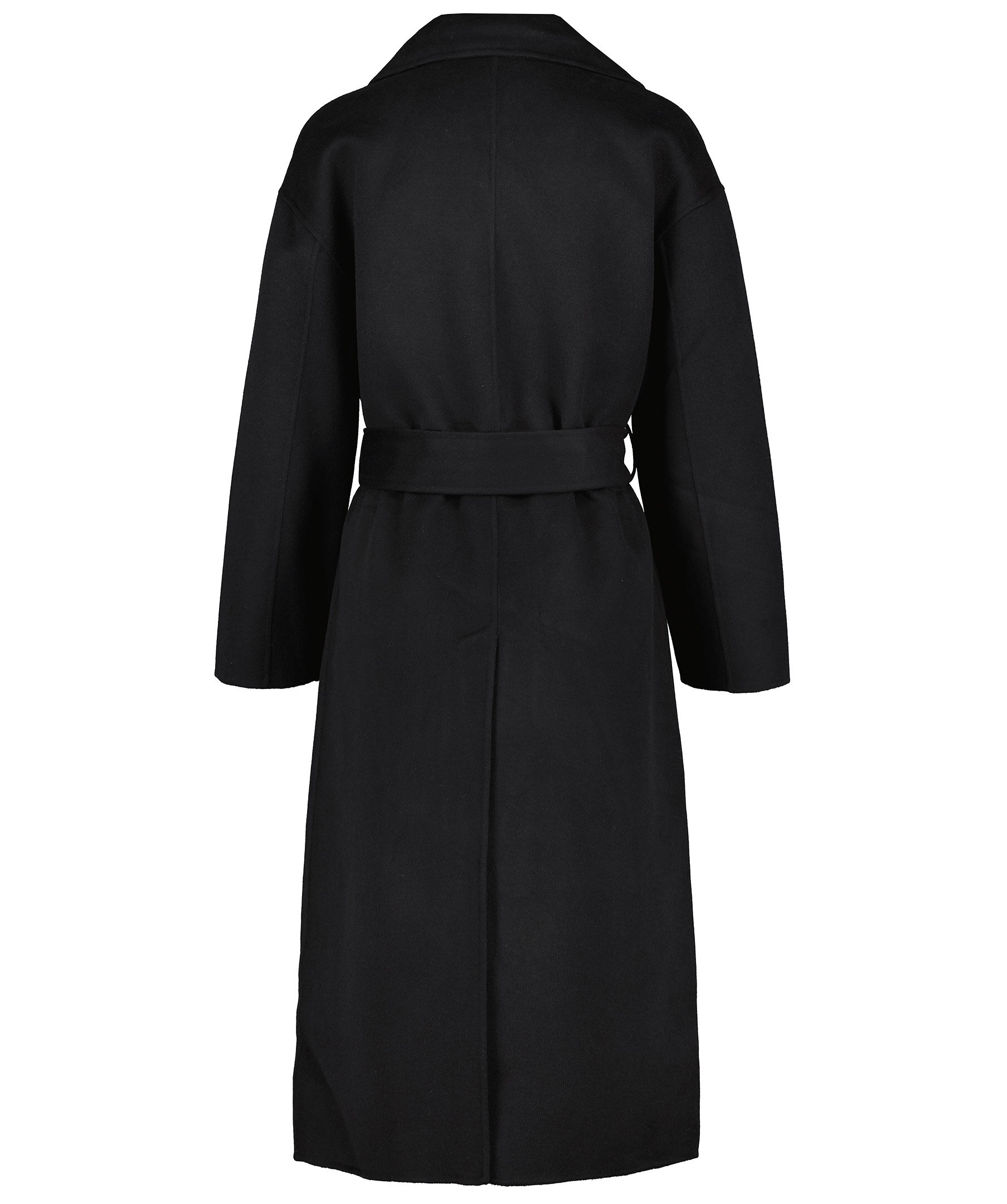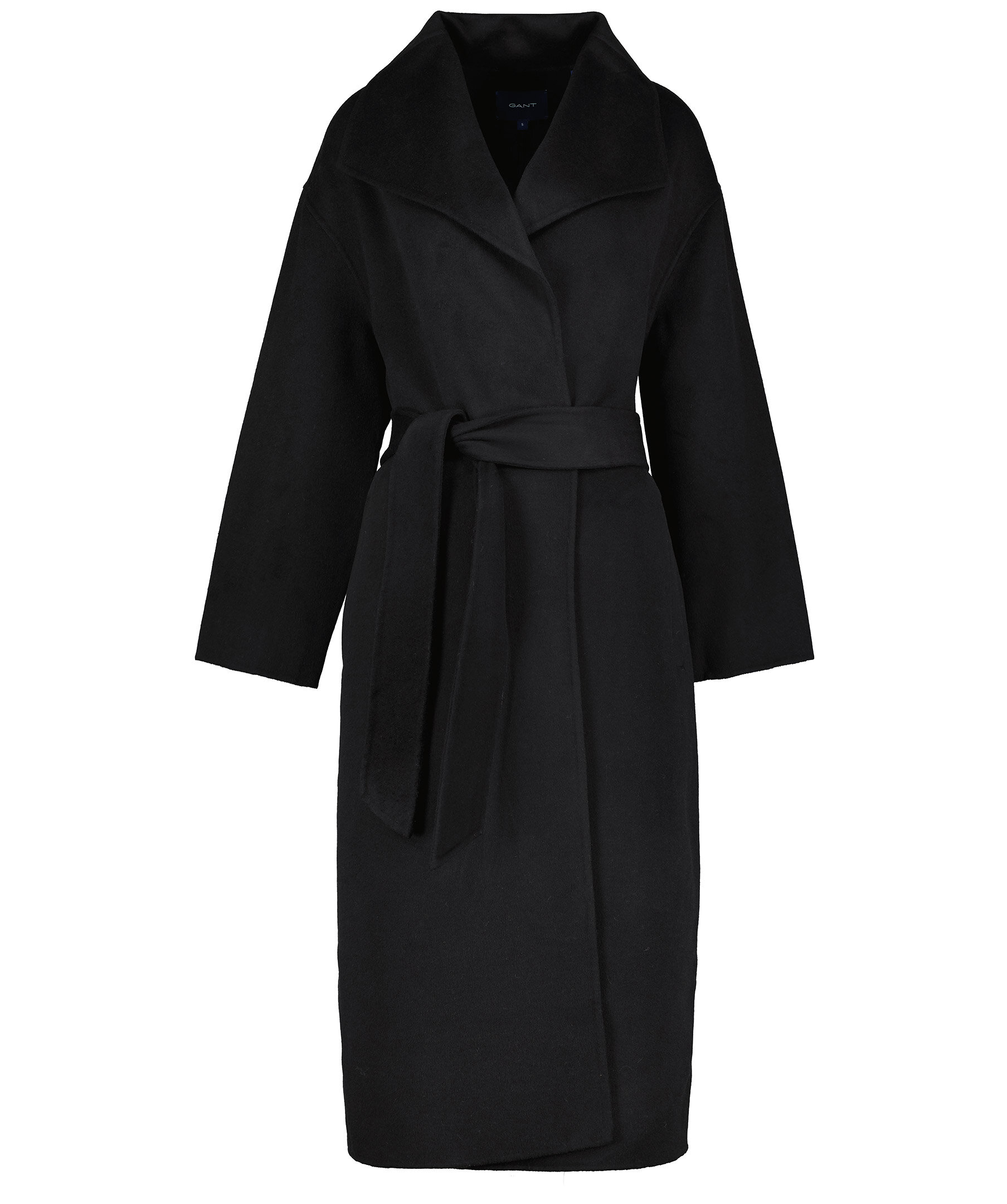 Svart kappa från Gant. Handsydd kappa i dubbelsidig ullblandning, dropped shoulders och oversized öppen krage. Avslappnad passform, bälte i midjan, passpoalfickor och högt sprund baktill. Tillverkad i ull och polyester.