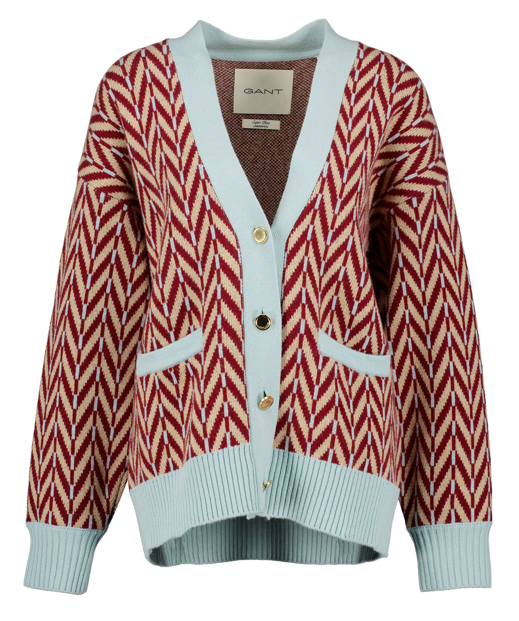 Stickad, flerfärgad kofta från Gant. Tillverkad i 100% superfin italiensk lammull som är både tjock och mjuk. Den är gjord i fiskbensmönstrad jacquard med kontrasterande kanter samt guldfärgade knappar med logotyp för en putsad och preppy look. Två fickor. Plagget har en relaxed fit. För en mer figurnära passform rekommenderar vi att du väljer en mindre storlek.