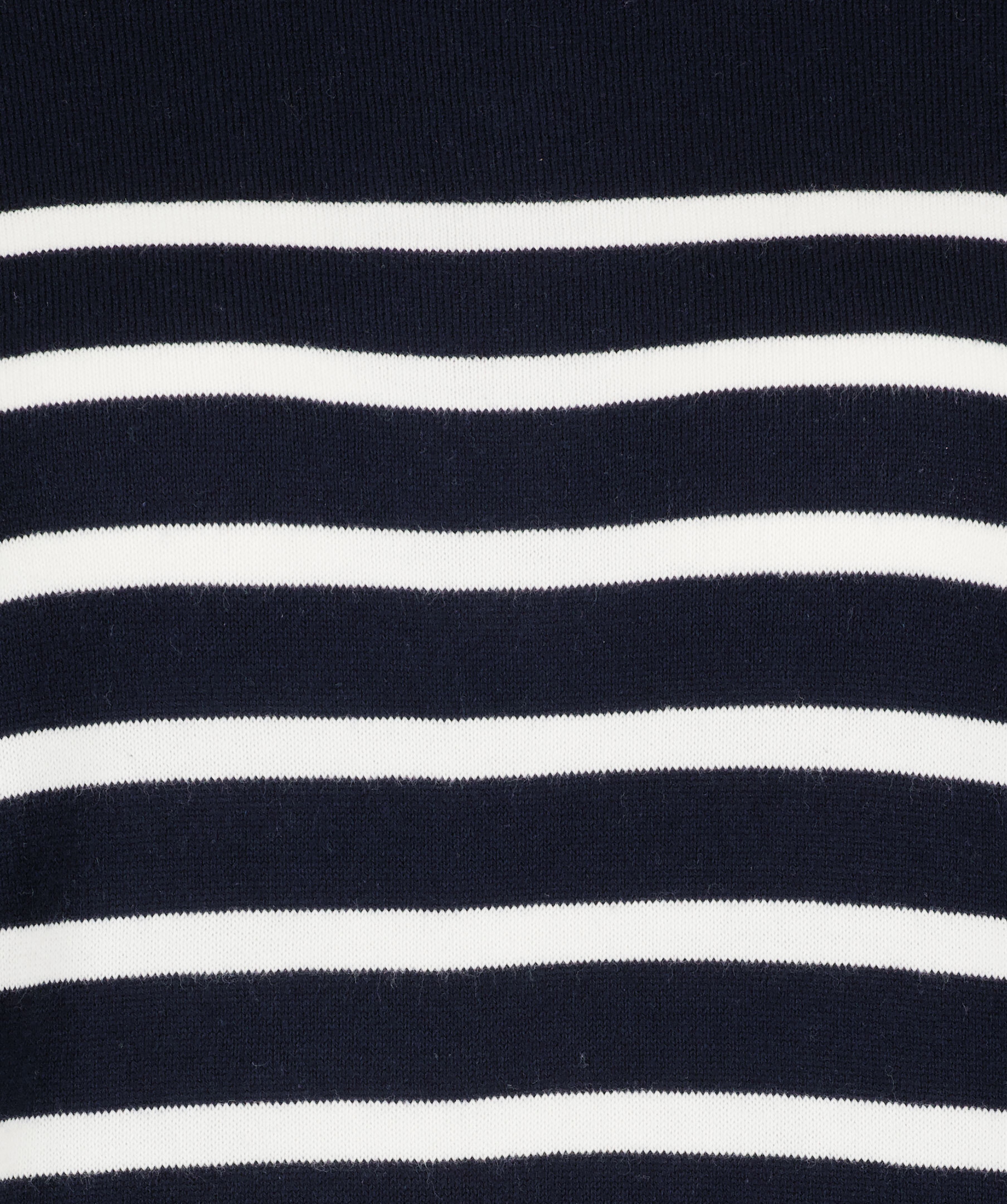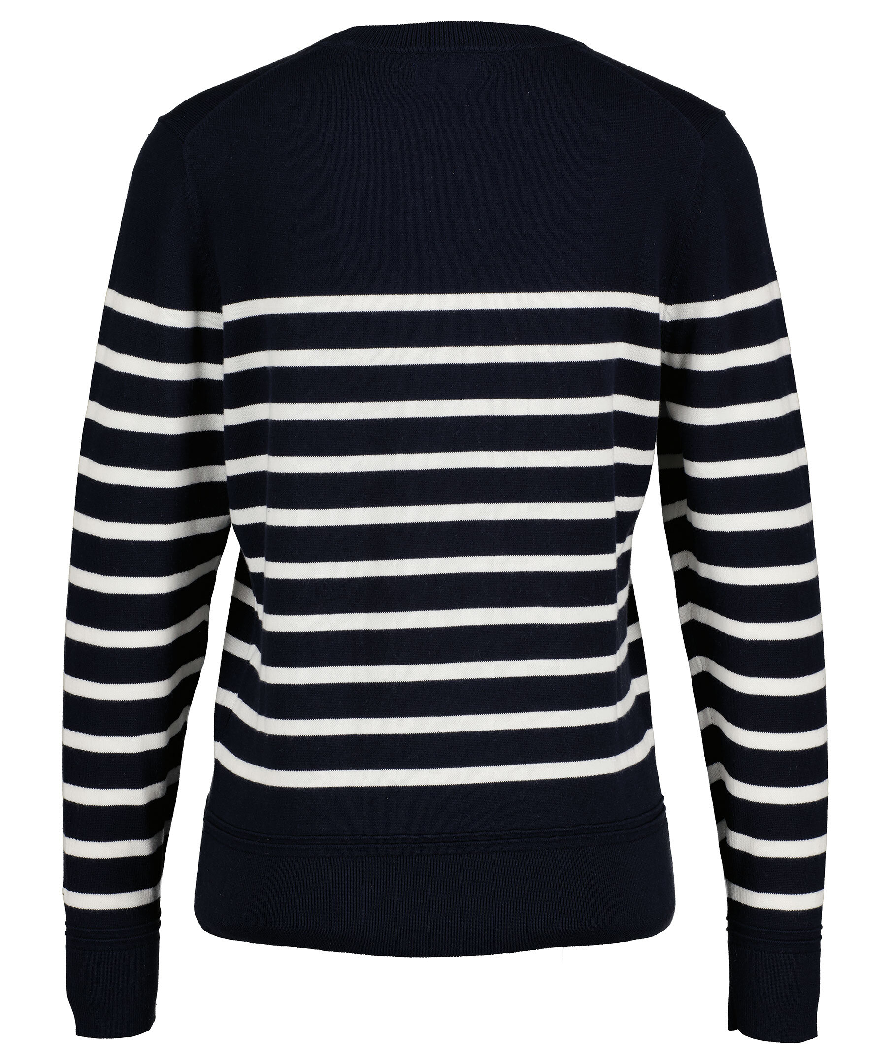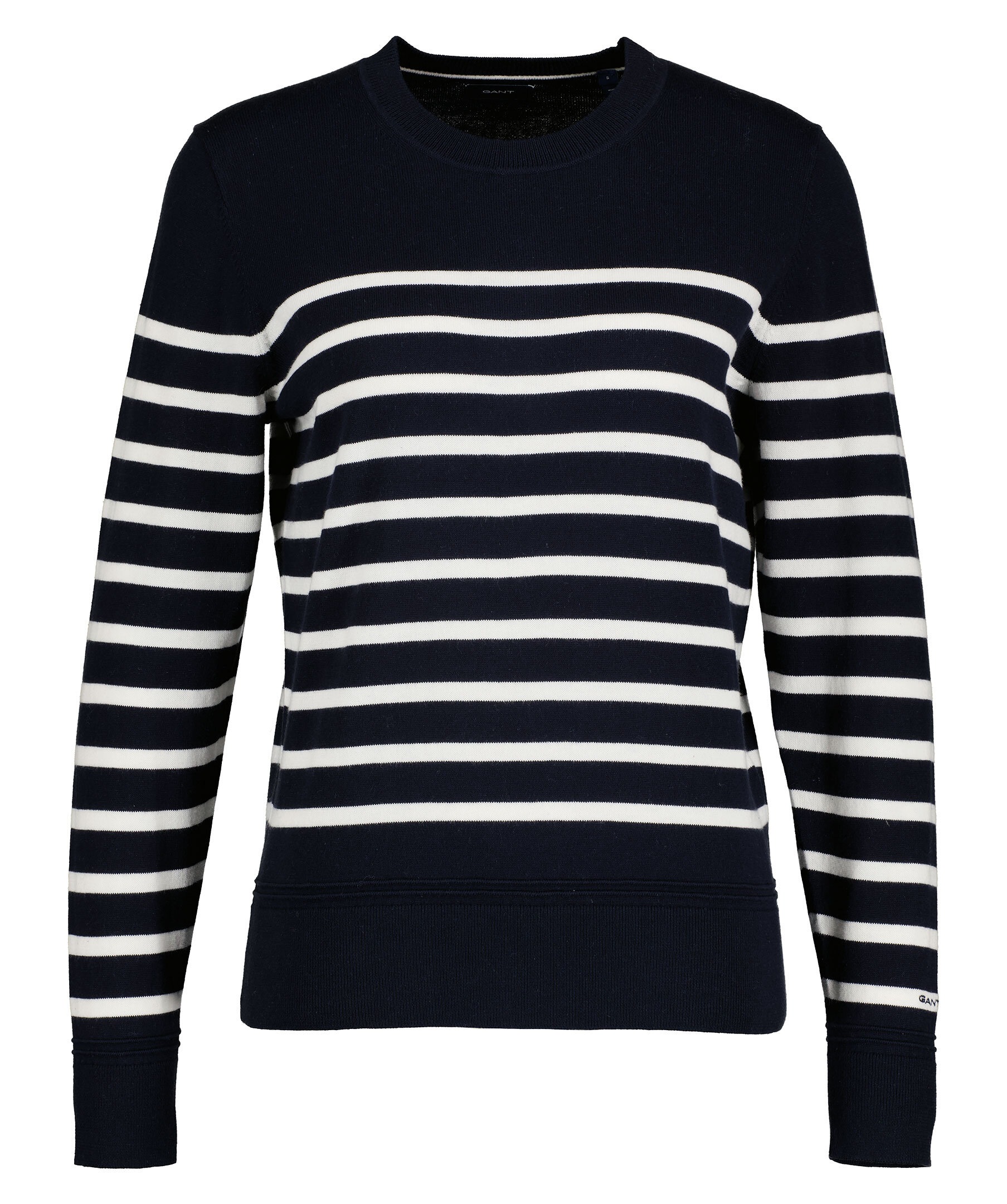 Marinblå- och vitrandig, finstickad tröja från Gant. Rundad halsringning med ribbstickad mudd och muddar i ärmslut och plaggslut. Liten broderad logotyp på den vänstra ärmens ärmslut. Tillverkad i bomull.