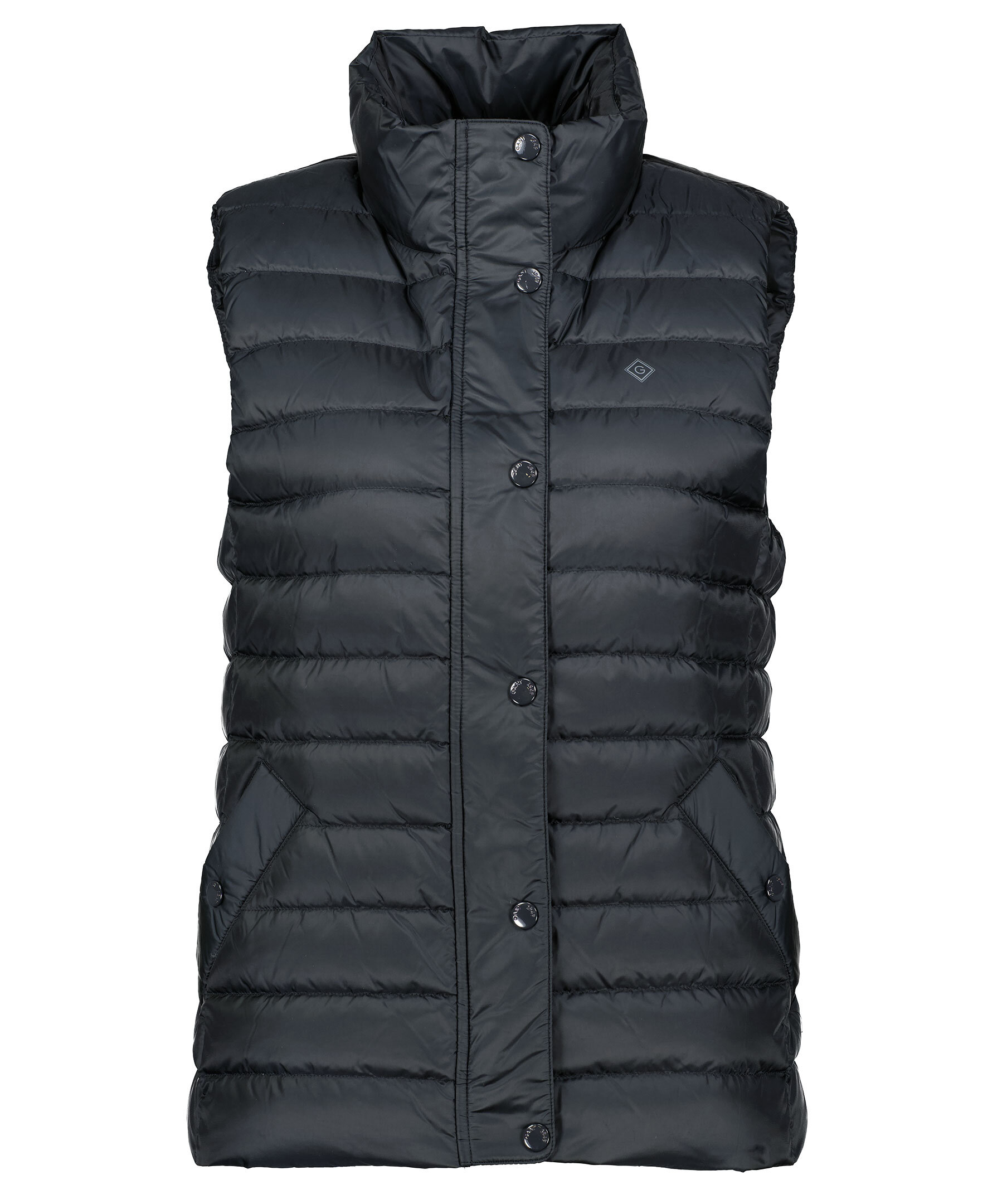 Svart quiltad dunväst från Gant. Stängs framtill med tvåvägsdragkedja och tryckknappar. Snedställda fickor framtill som stängs med tryckknappar. Innerficka som stängs med dragkedja. Tryckt logotyp på vänster bröst.