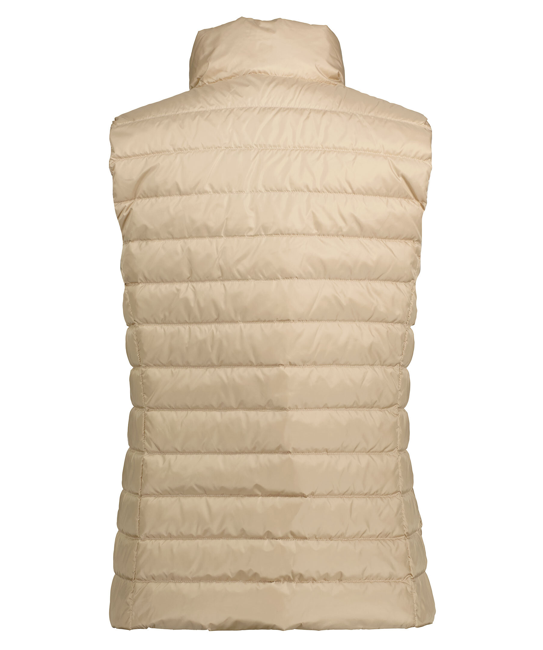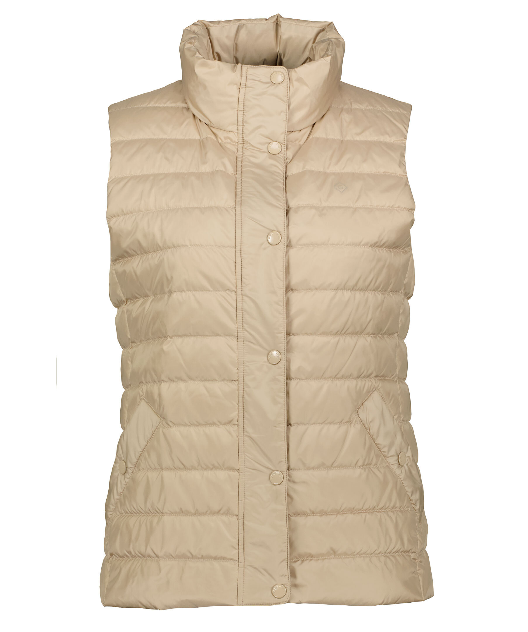 Beige quiltad dunväst från Gant. Stängs framtill med tvåvägsdragkedja och tryckknappar. Snedställda fickor framtill som stängs med tryckknappar. Innerficka som stängs med dragkedja. Tryckt logotyp på vänster bröst.