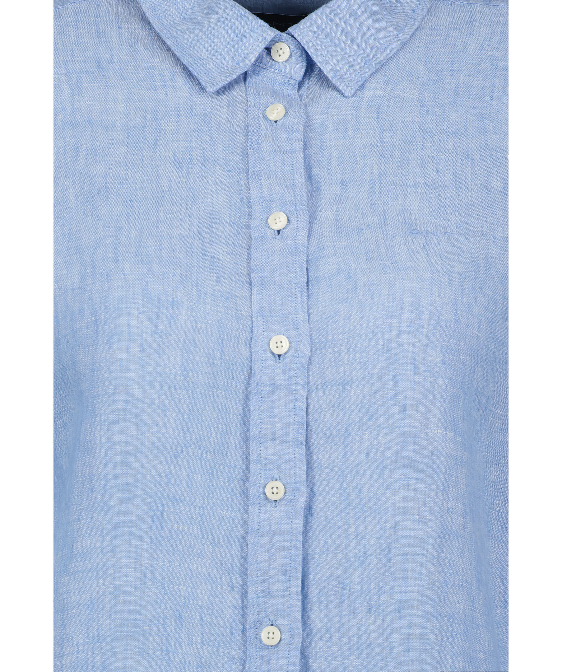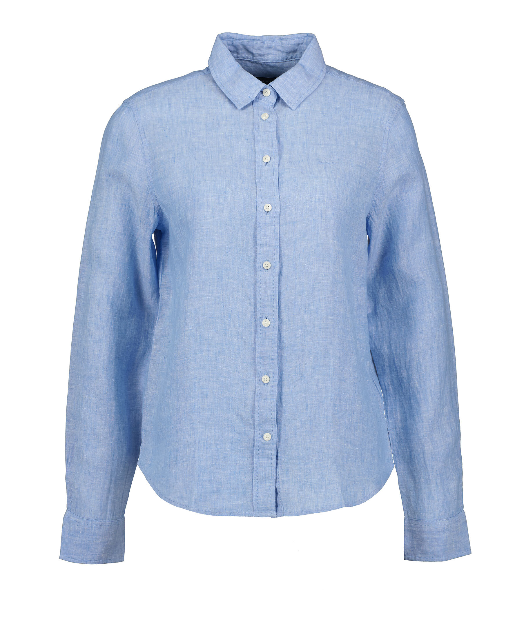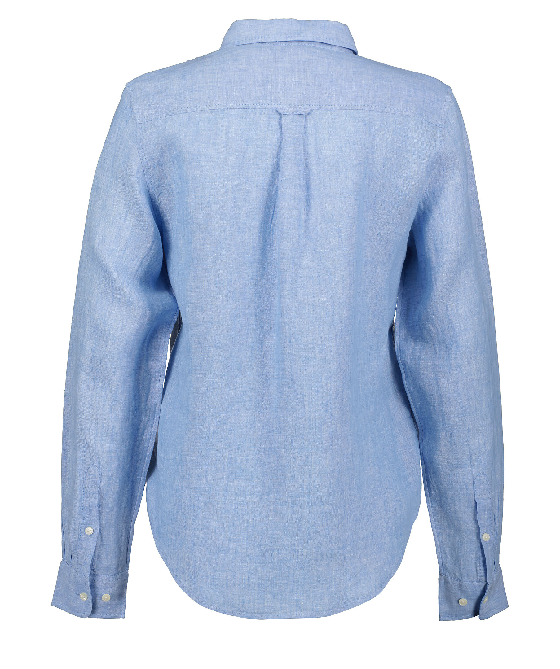 Ljusblå linneskjorta från Gant. Stängs framtill med knappar. Spetsig krage. Broderad logotyp på vänster bröst. Enkla, justerbara manschetter. Boxpleat och locker loop på ryggen.