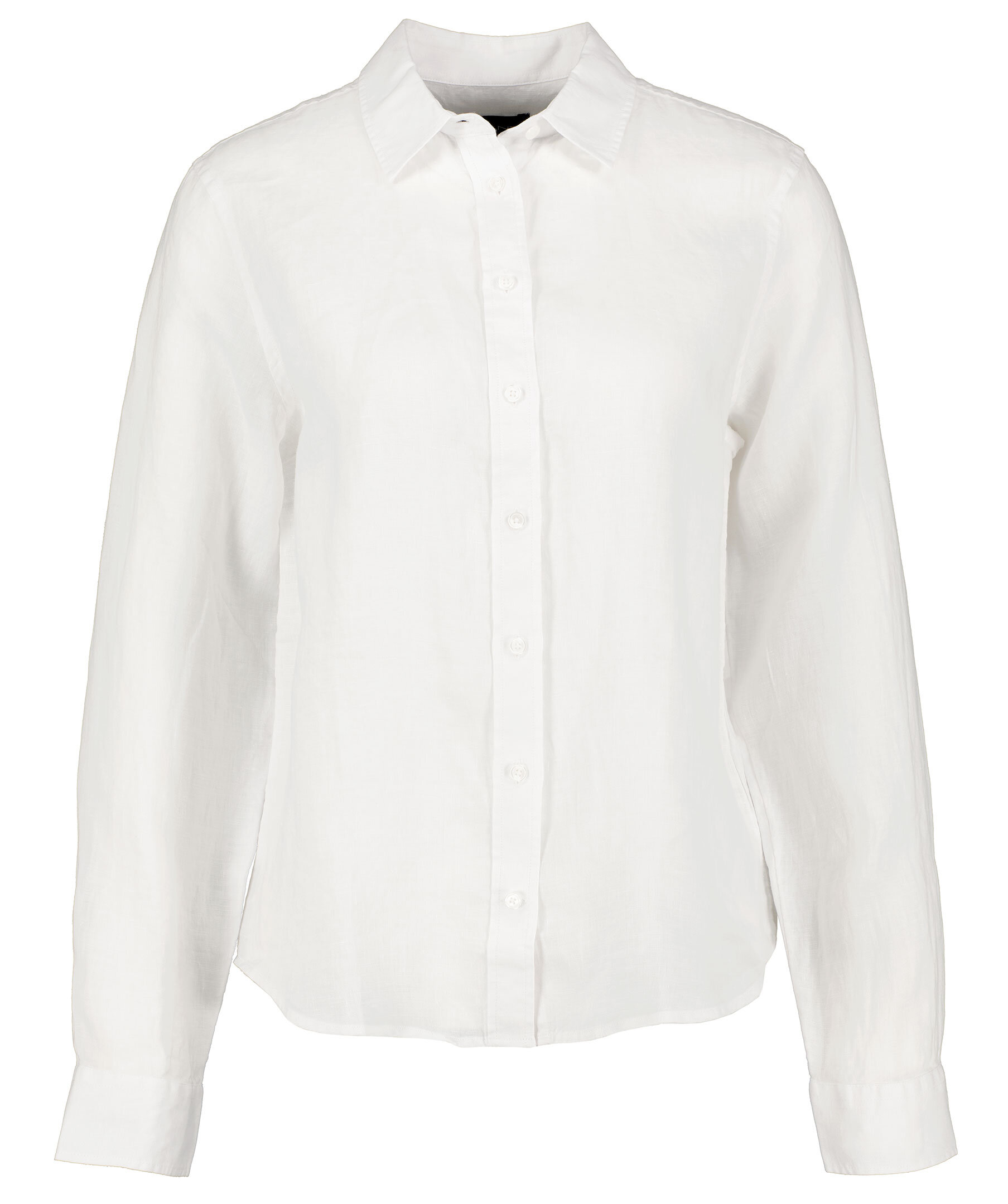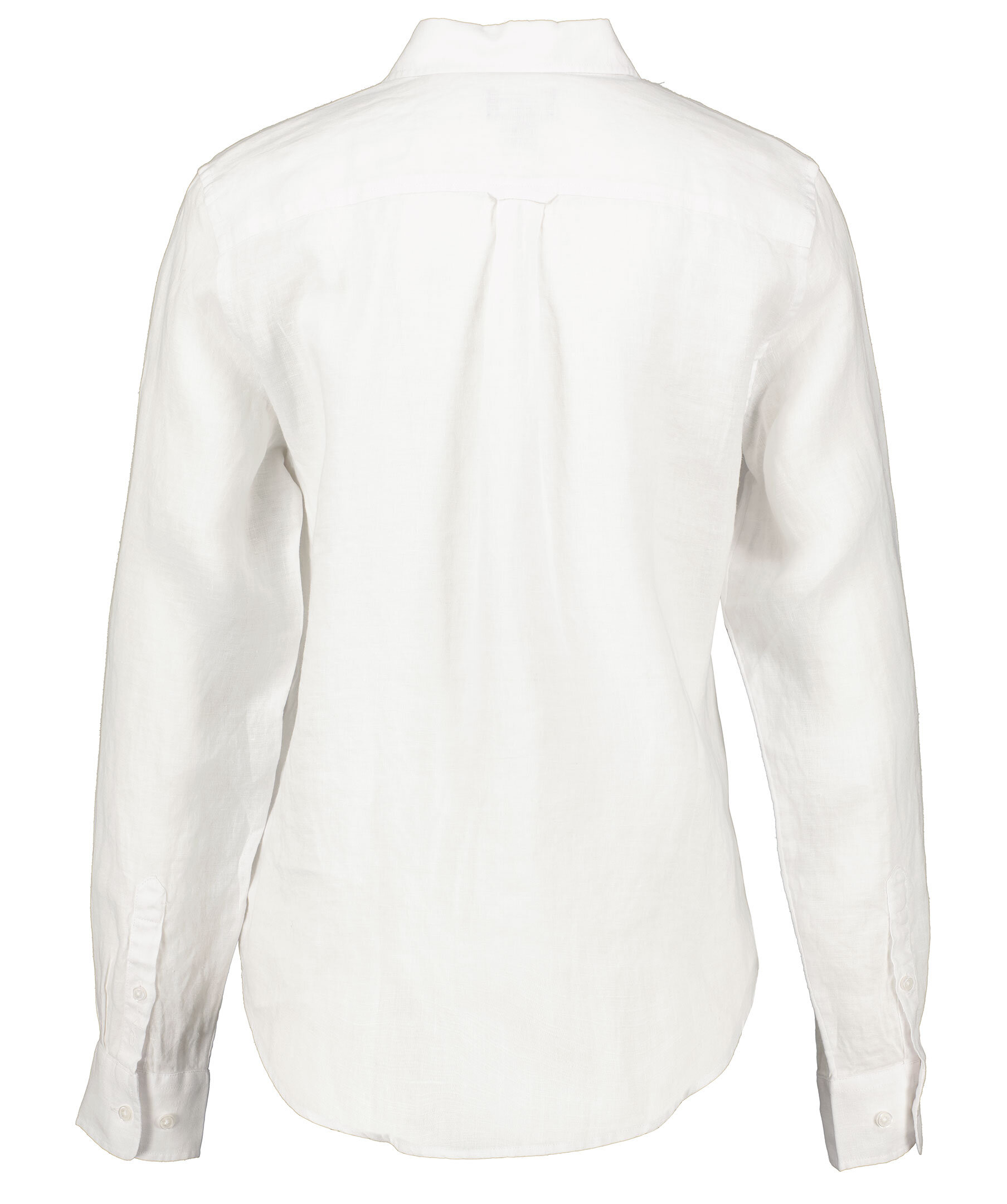 Vit Linneskjorta från Gant. Broderad GANT-logotyp på vänster manschett. Justerbara manschetter. Locker loop och boxpleat på ryggen. Modellen är 182cm lång och har på sig storlek C38.