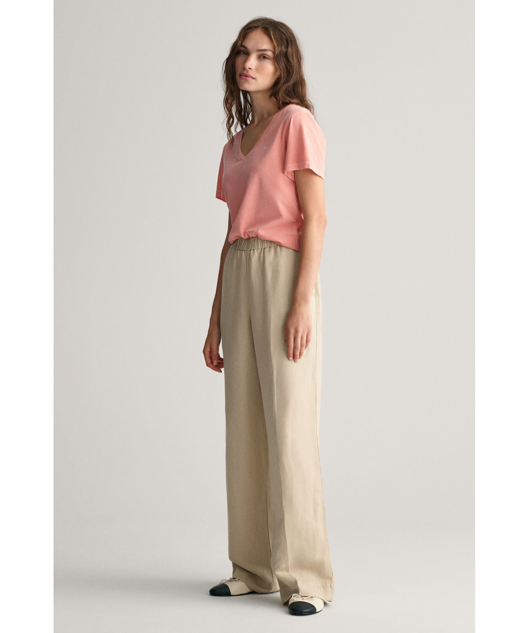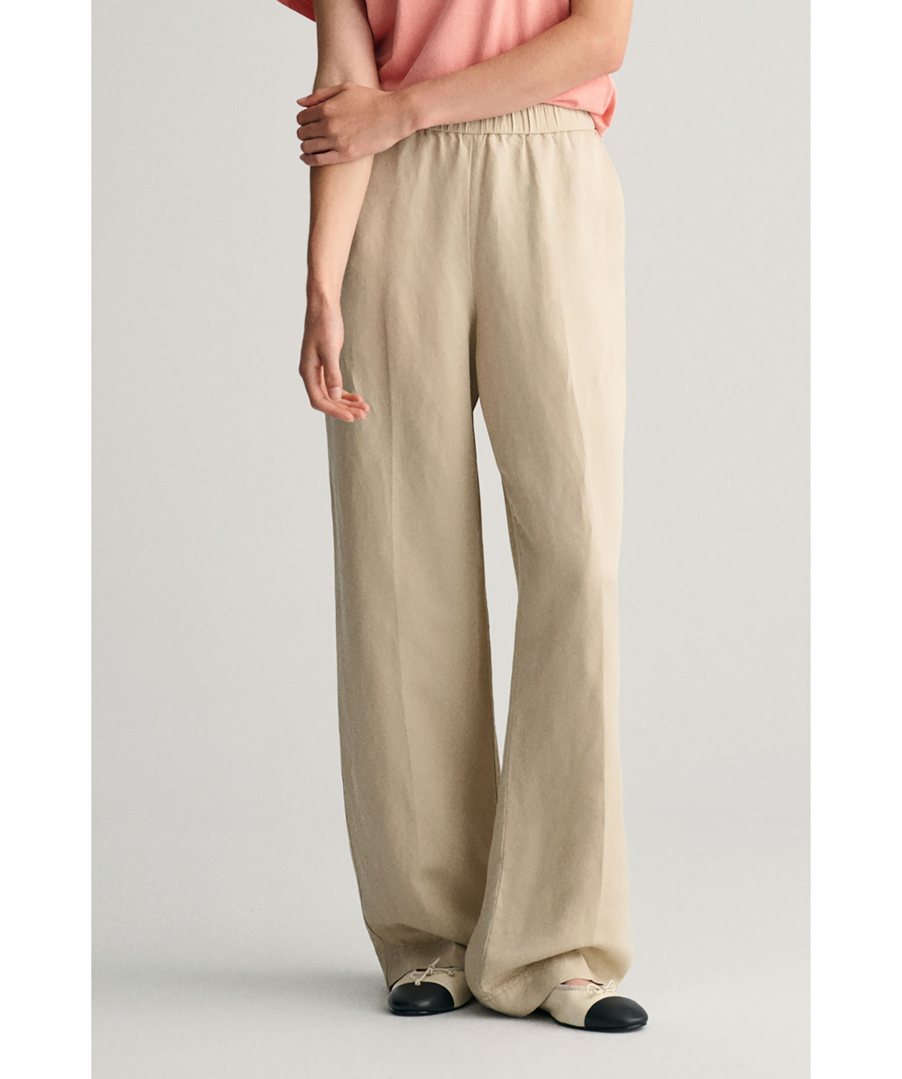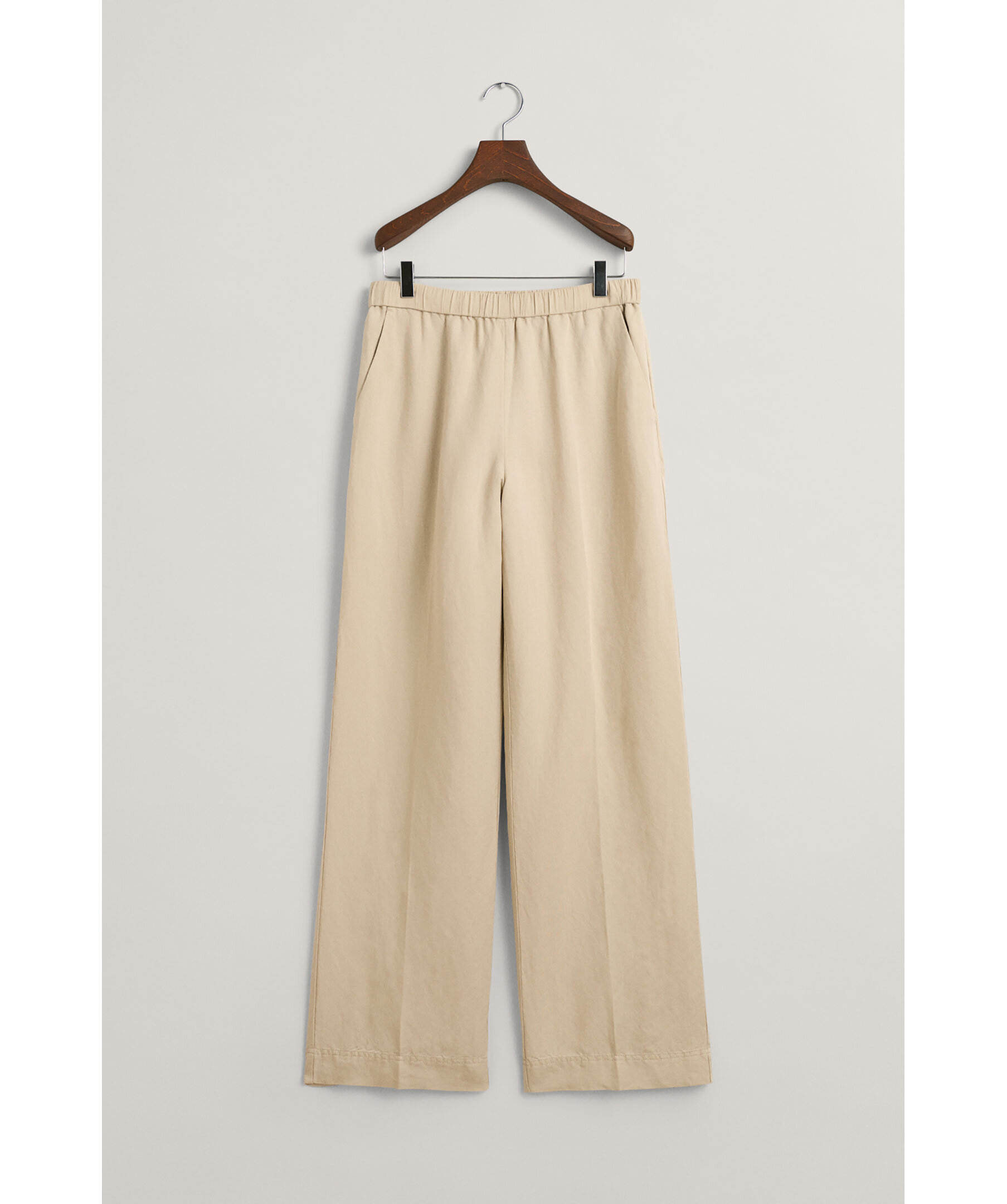 Beigea Linnebyxor från Gant. Mellanhög midja med elastik resår och vida byxben. Snedställda fickor framtill. Tillverkad i Linneblandning.