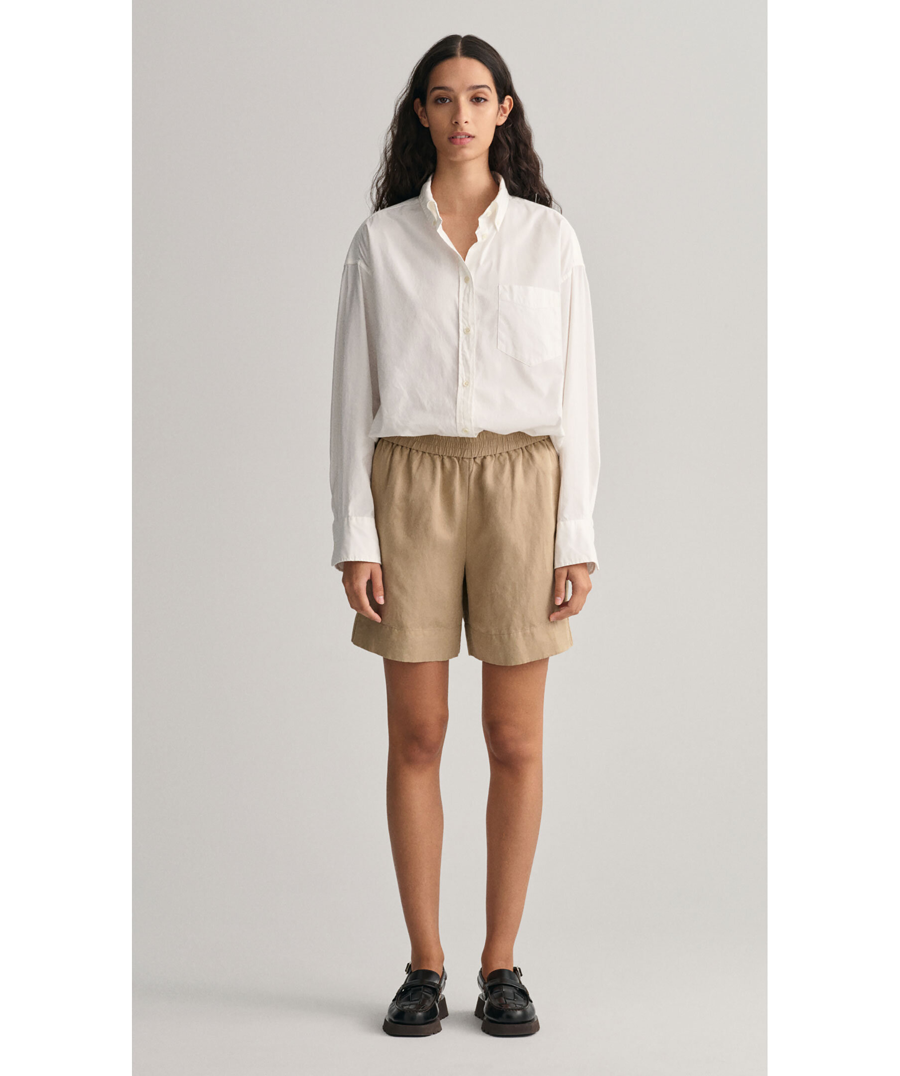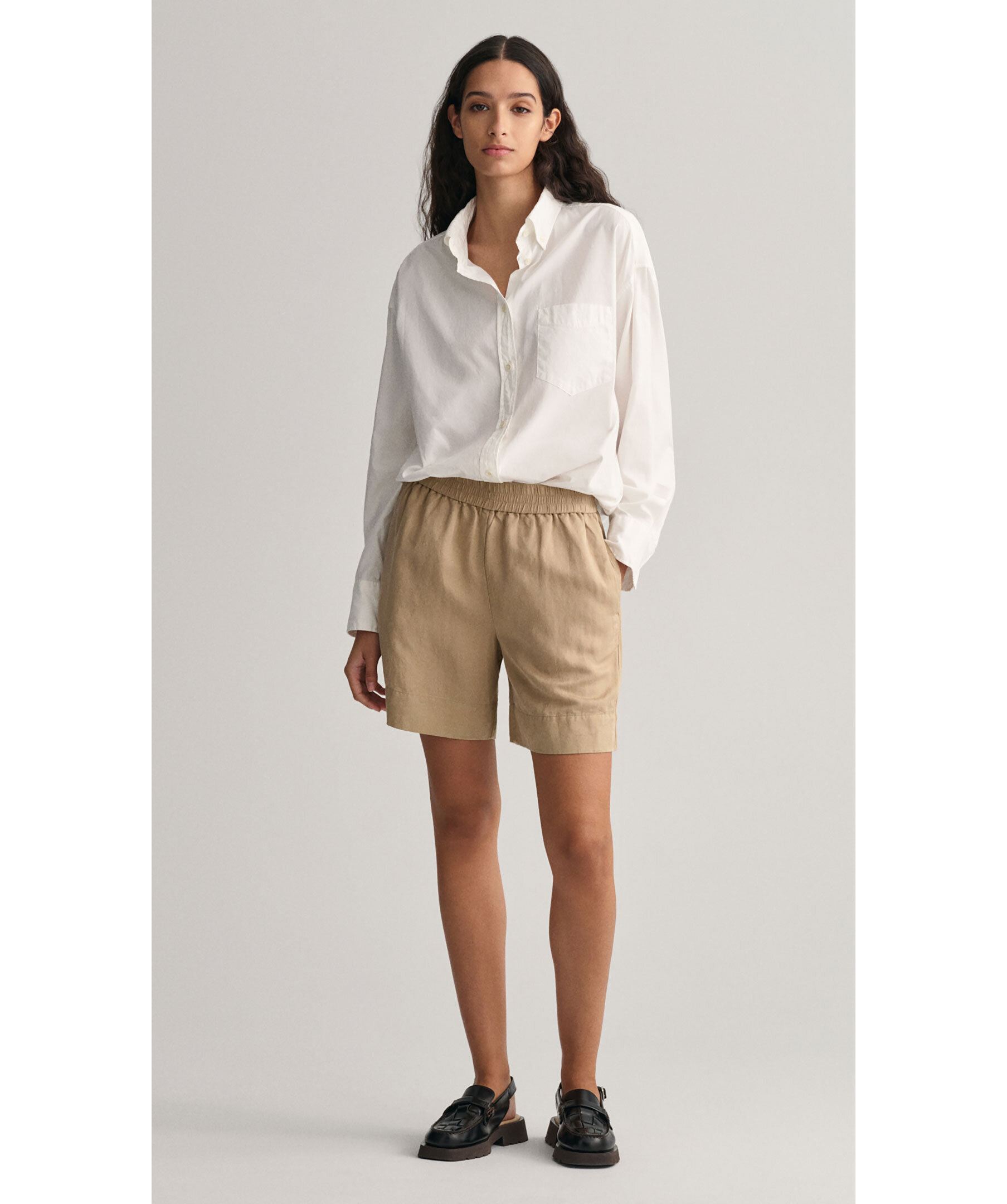Beigea shorts i linne och viskosblandning från Gant. Två fickor framtill. Garment-washed för en mjuk känsla och lätt glans. Dra-på-modell med resår i midjan, mellanhög midja och något pösigare ben som slutar på mitten av låret.