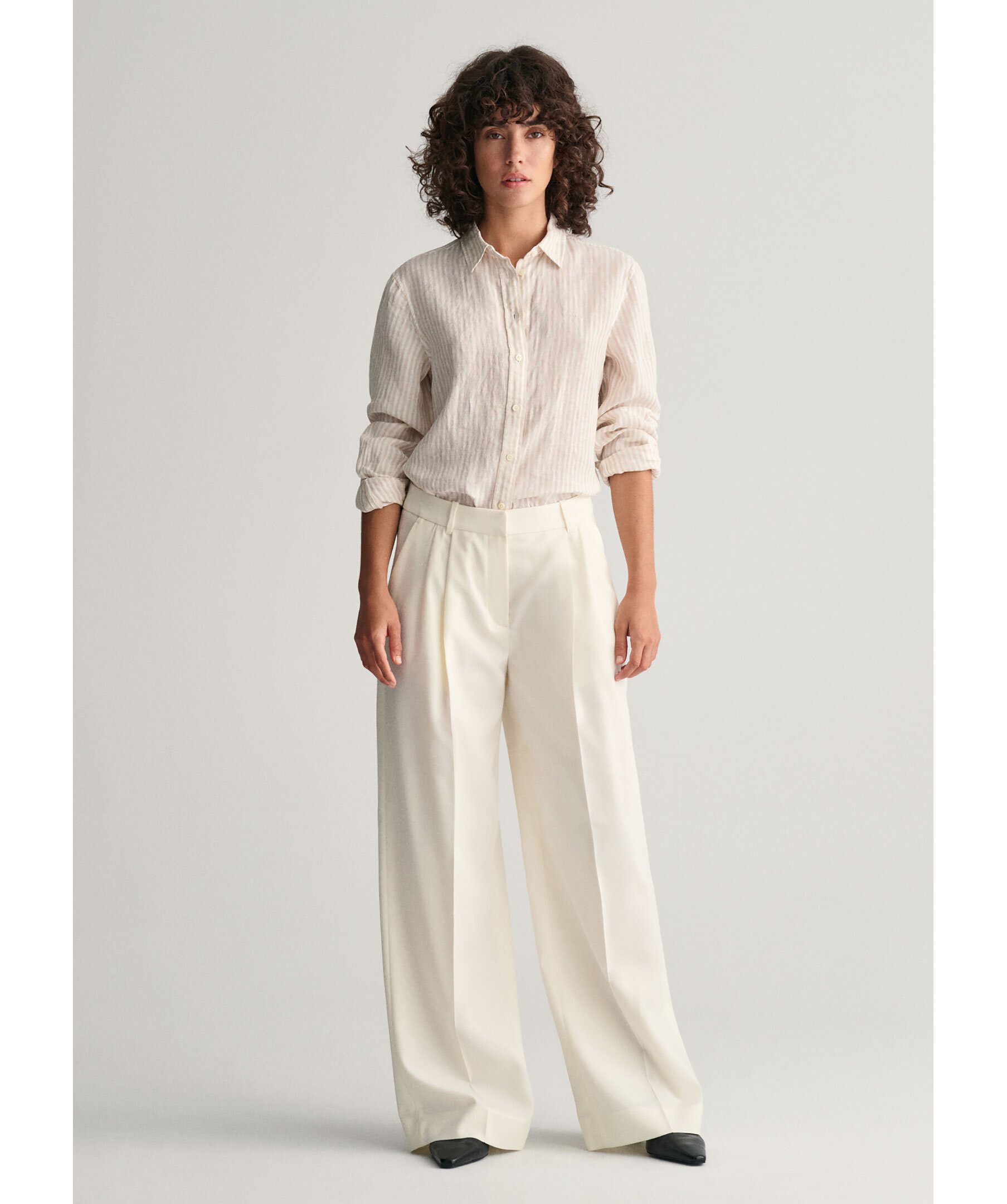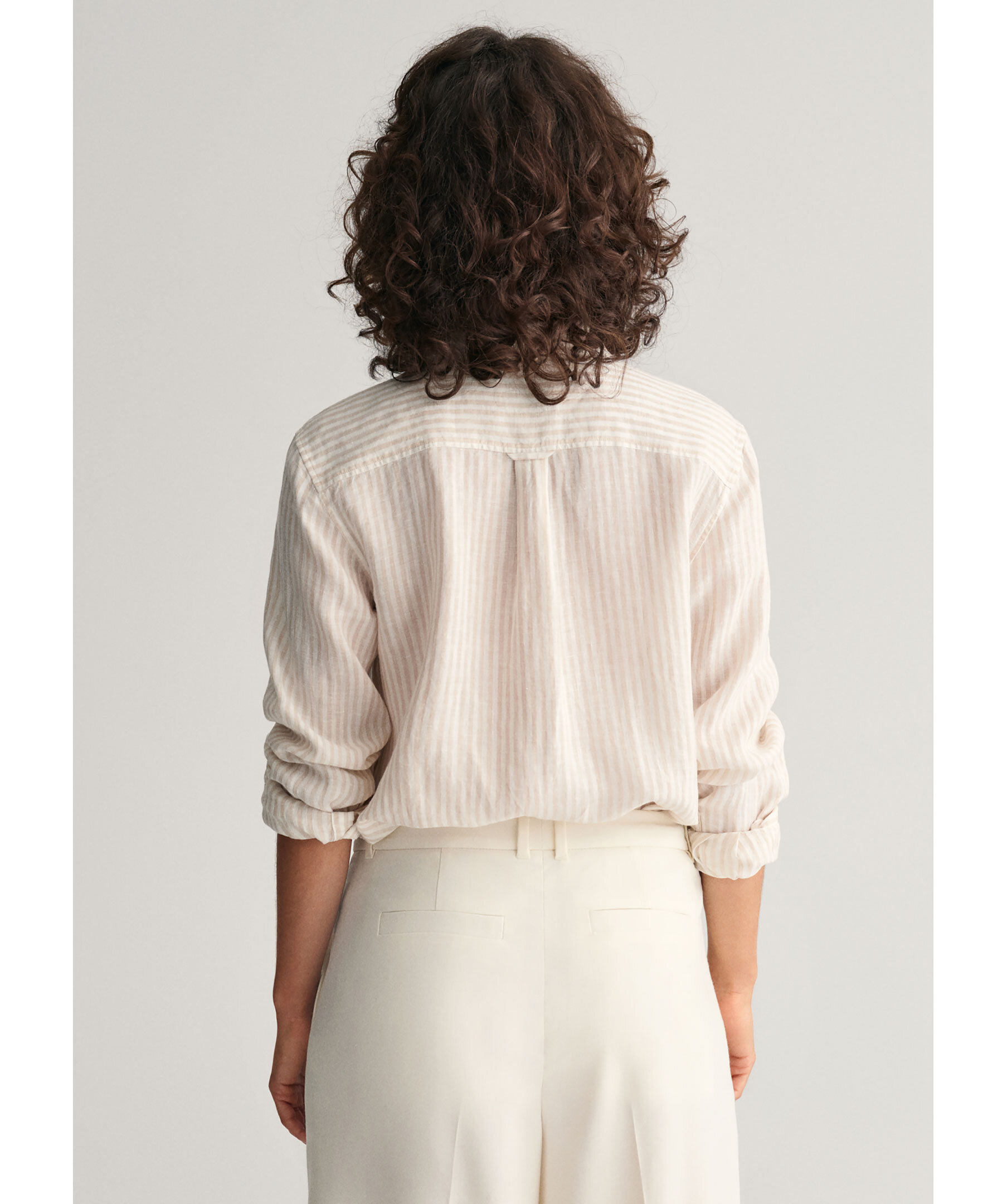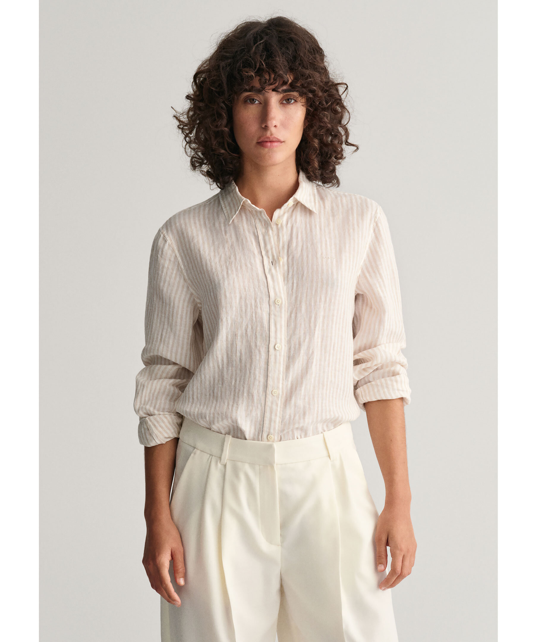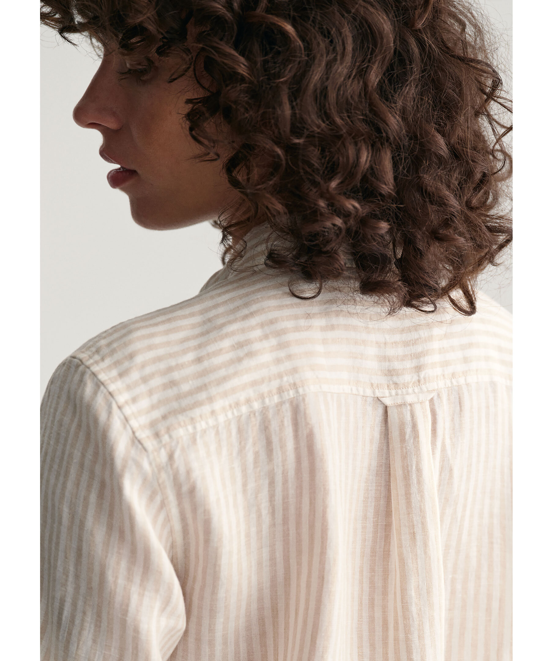 Randig, sandfärgad linneskjorta från Gant. Naturligt lätt och luftig, tillverkad i tunt tvättat linne. Den har en normal passform, point-krage, justerbara manschetter, broderad GANT-logotyp på bröstet och deras klassiska locker loop med boxpleat i ryggen.