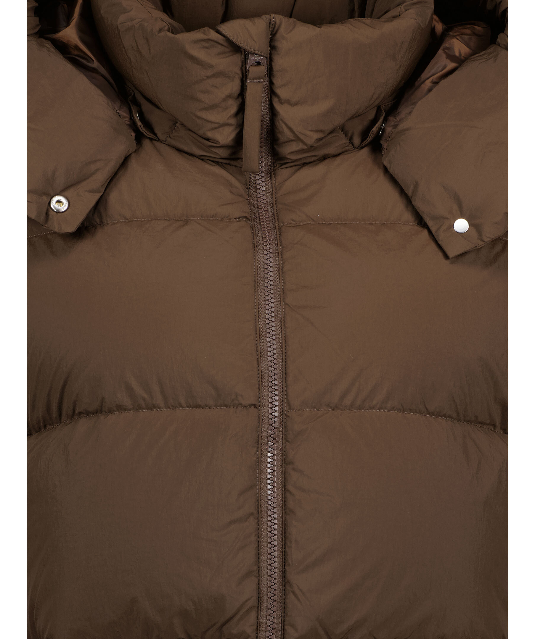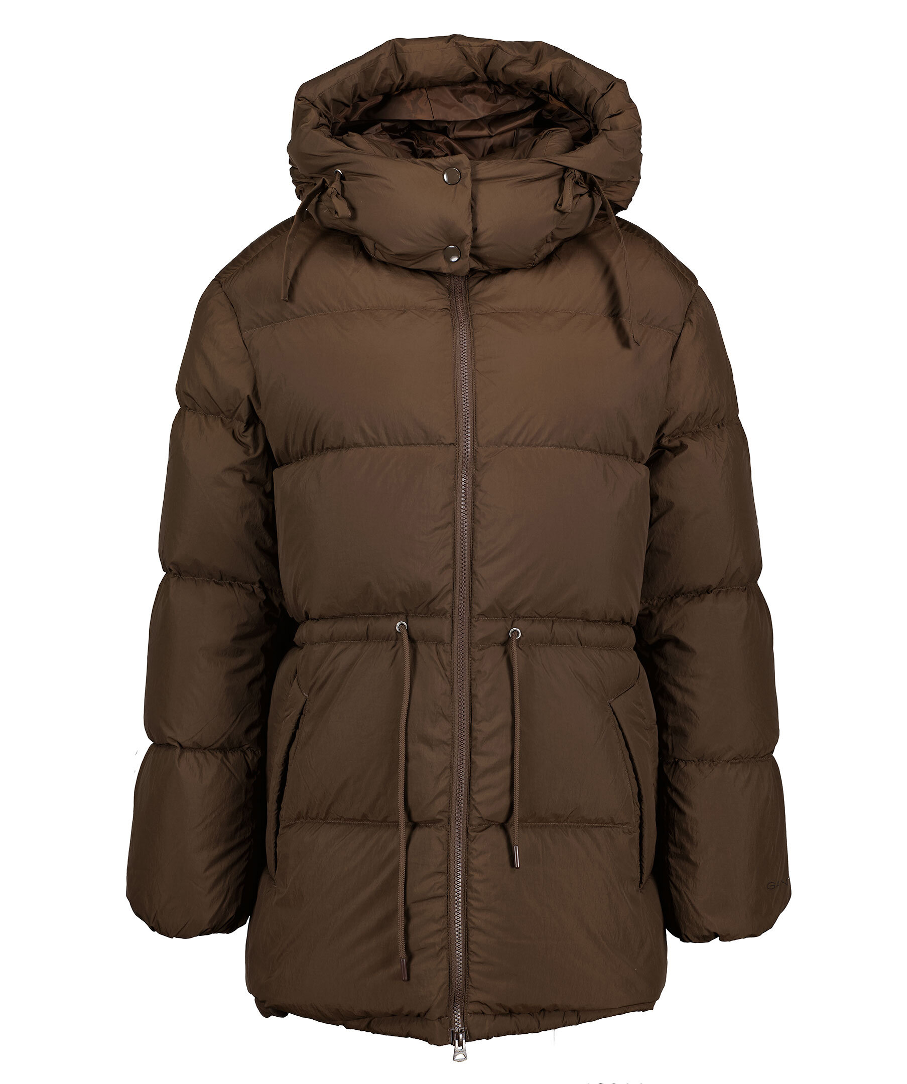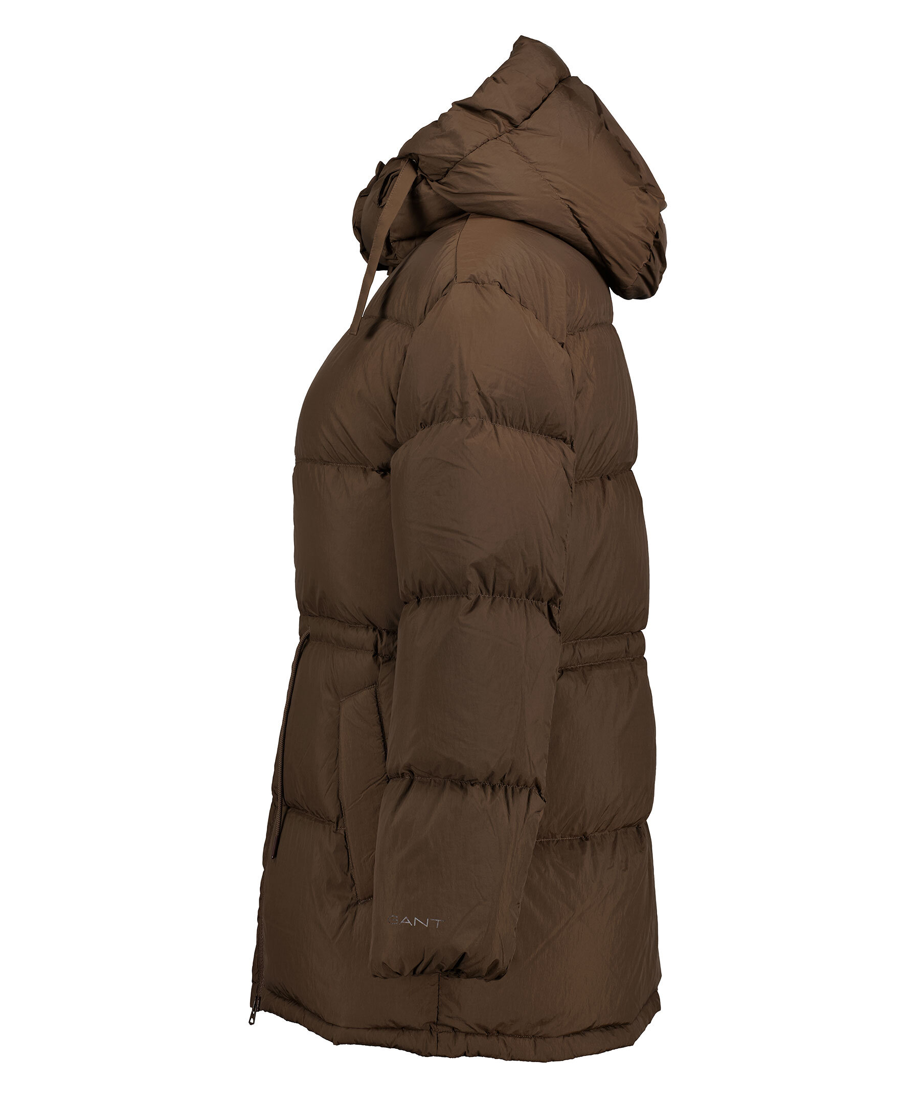 Brun quiltad dunjacka från Gant. Stängs framtill med tvåvägs dragkedja. Dragsko i midjan. Avtagbar luva med dragsko. Tryckt logotyp vid vänster ärmslut. Två fickor framtill, en bröstficka som stängs med dragkedja. Tillverkad i vattenavvisande material. Avslappnad passform.