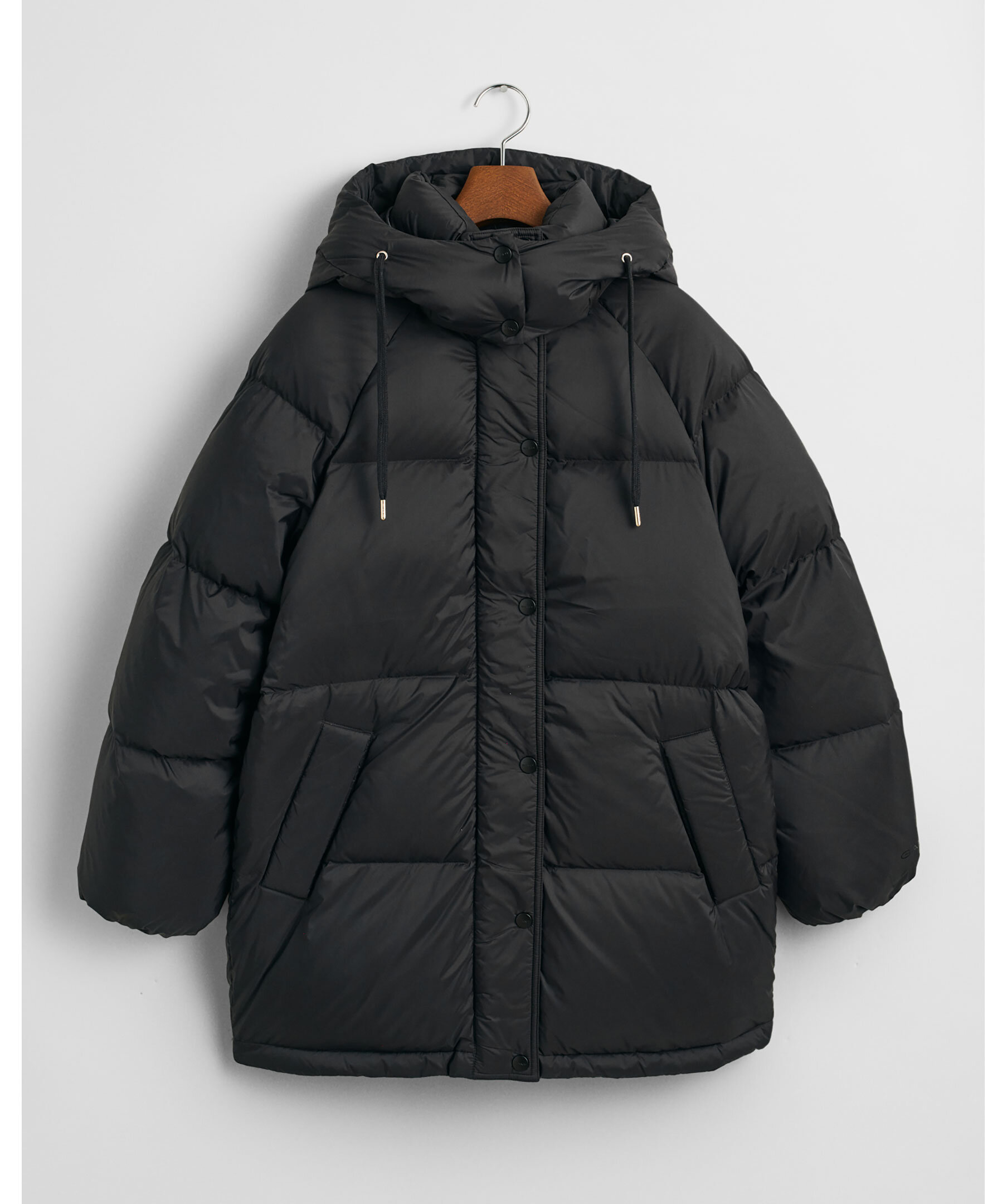 Svart pufferjacka från Gant. Jackan stängs med tvåvägsdragkedja och har avtagbar och justerbar huva, tryckknappar med logotyp, innerficka, och två passpoalfickor fram. Andra detaljer är raglanärmar med resår i ärmsluten samt dragsko i midjan för en åtsmitande passform. Jackan har jacquardfoder med logotyp och en GANT-logotyp i gummi på ärmen. Vattenavvisande och slutar strax nedanför höfterna. Tillverkad i polyamid med dunfyllning.