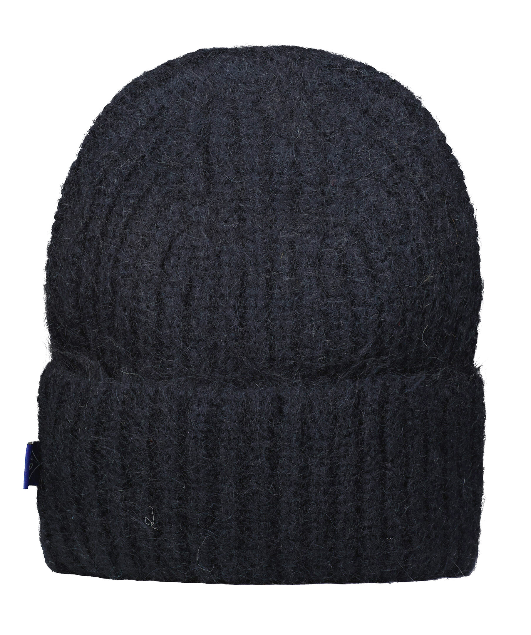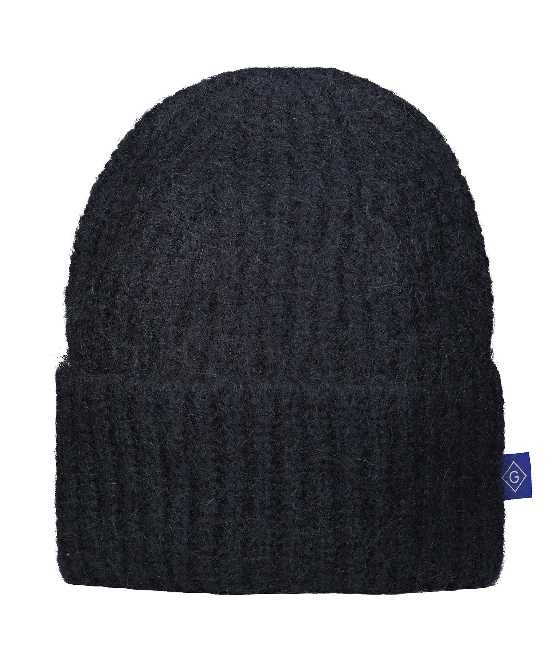 Svart ribbstickad oversizemössa från GANT. Tillverkad av ull- och mohairblandning, har en bred uppvikt kant och marinblå lapp med logga på ena sidan.