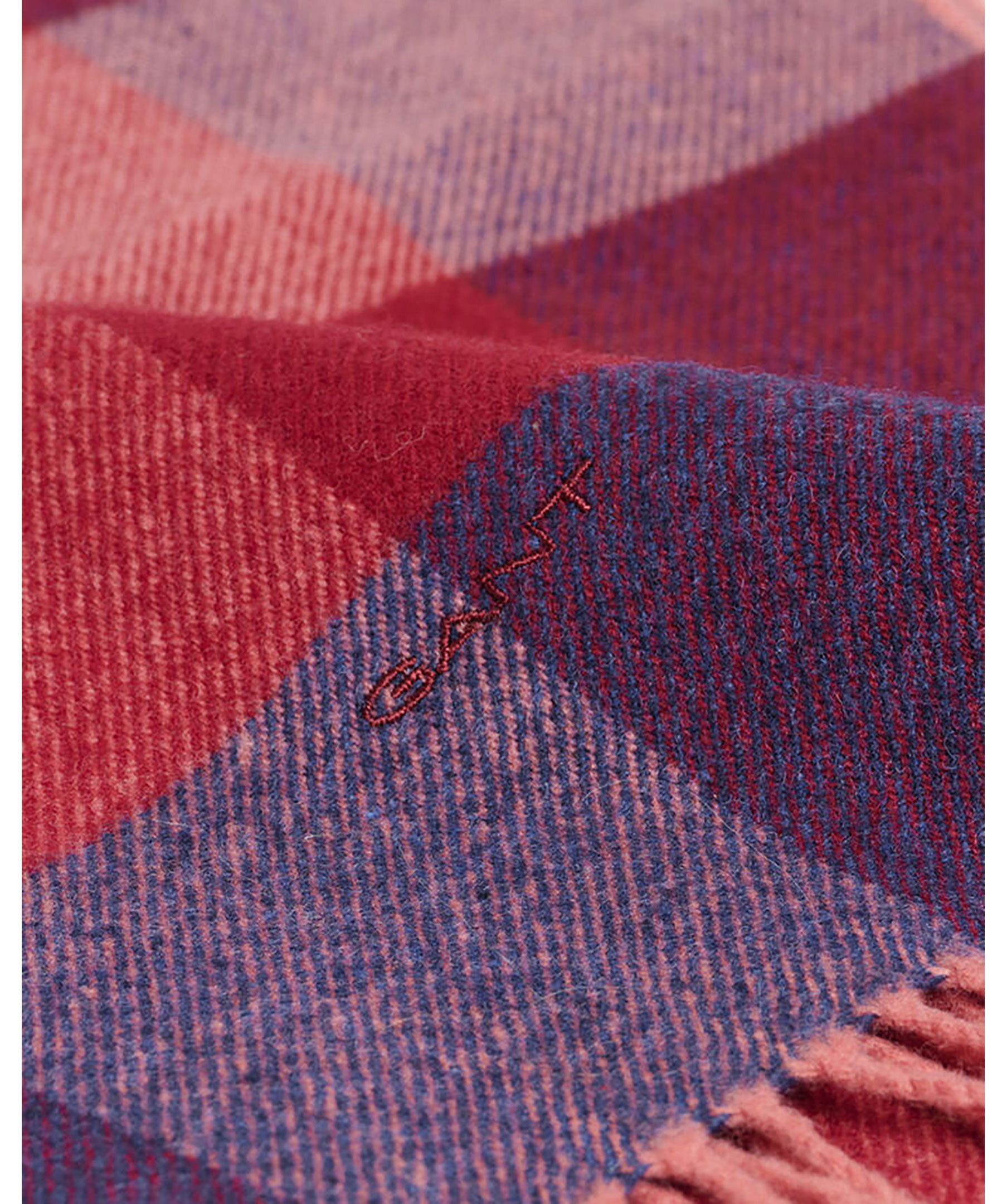 Flerfärgad och rutmönstrad halsduk från GANT. Fransar i kanterna, broderad logotyp vid kanten. Tillverkad i 100% ull. 180 x 30 cm lång.
