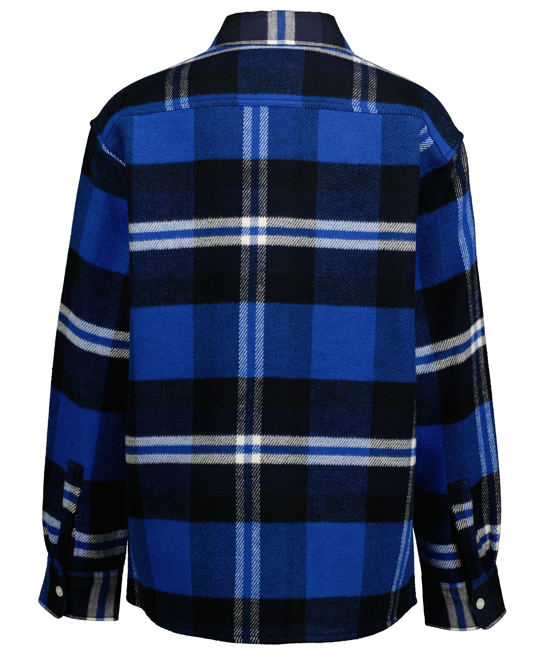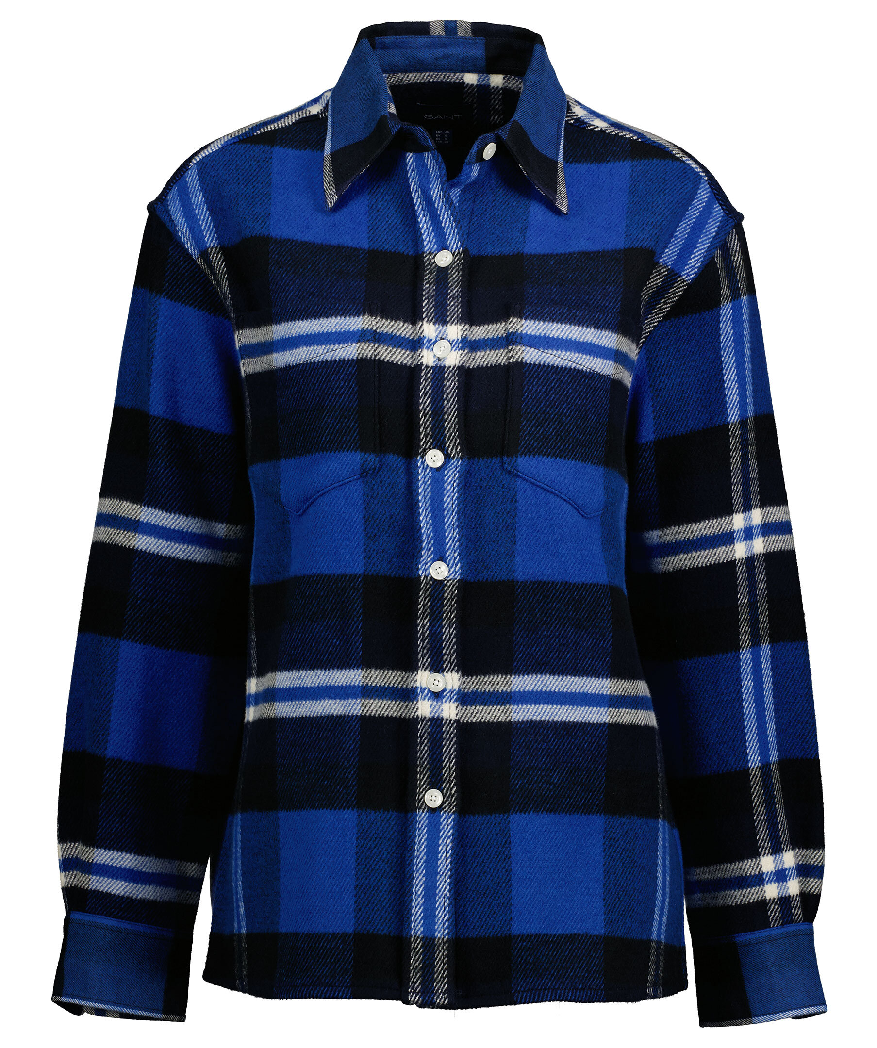 Blårutig, oversize skjortjacka från Gant. Tillverkad i bomulls- och ullblandning och kan användas som en lätt jacka under tidig höst. Det här är ett rustikt tillägg i höstgarderoben med dropped shoulders, en oversized button down-krage, två bröstfickor och en något rundad fåll. Stängs med knappar hela vägen fram.