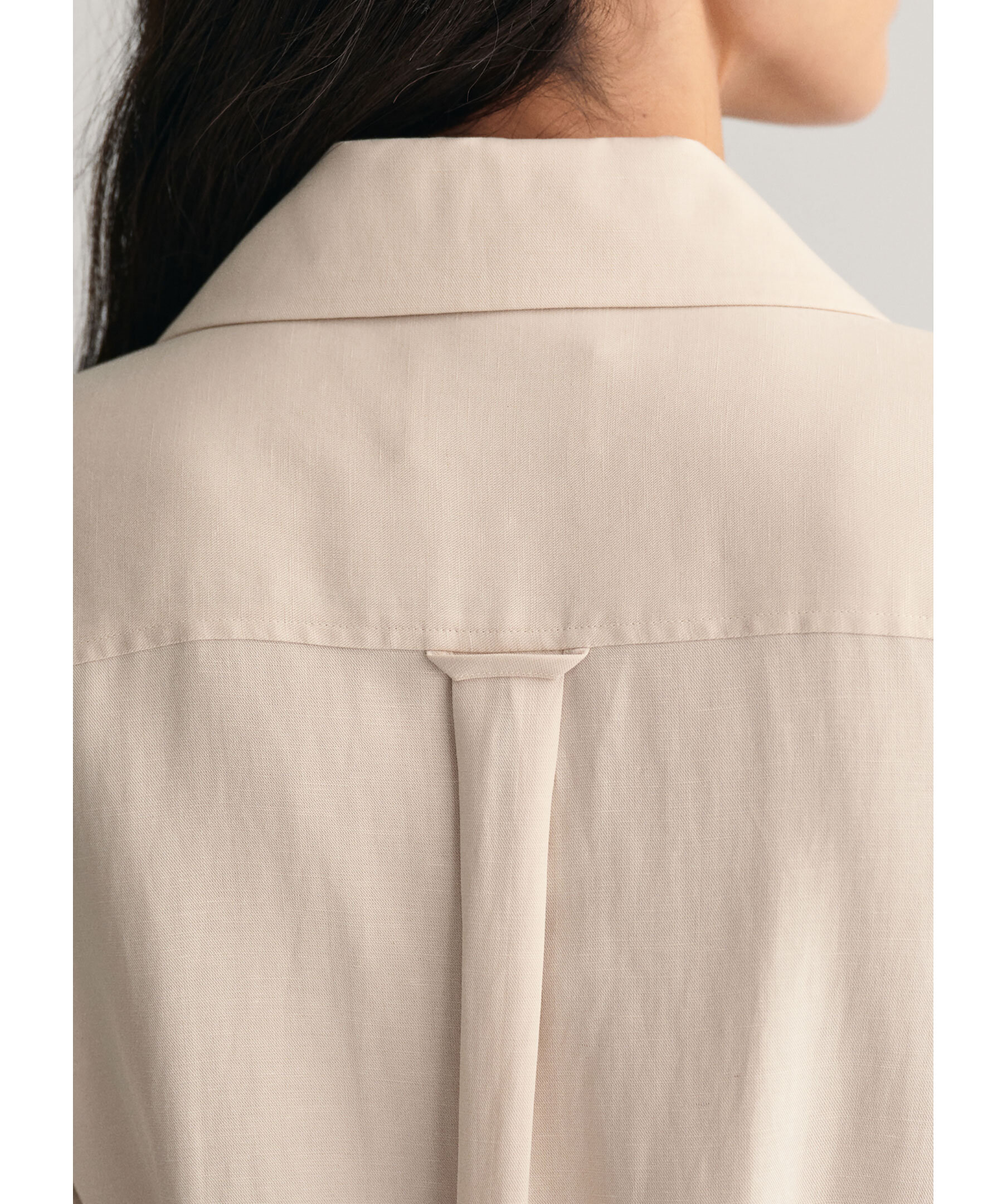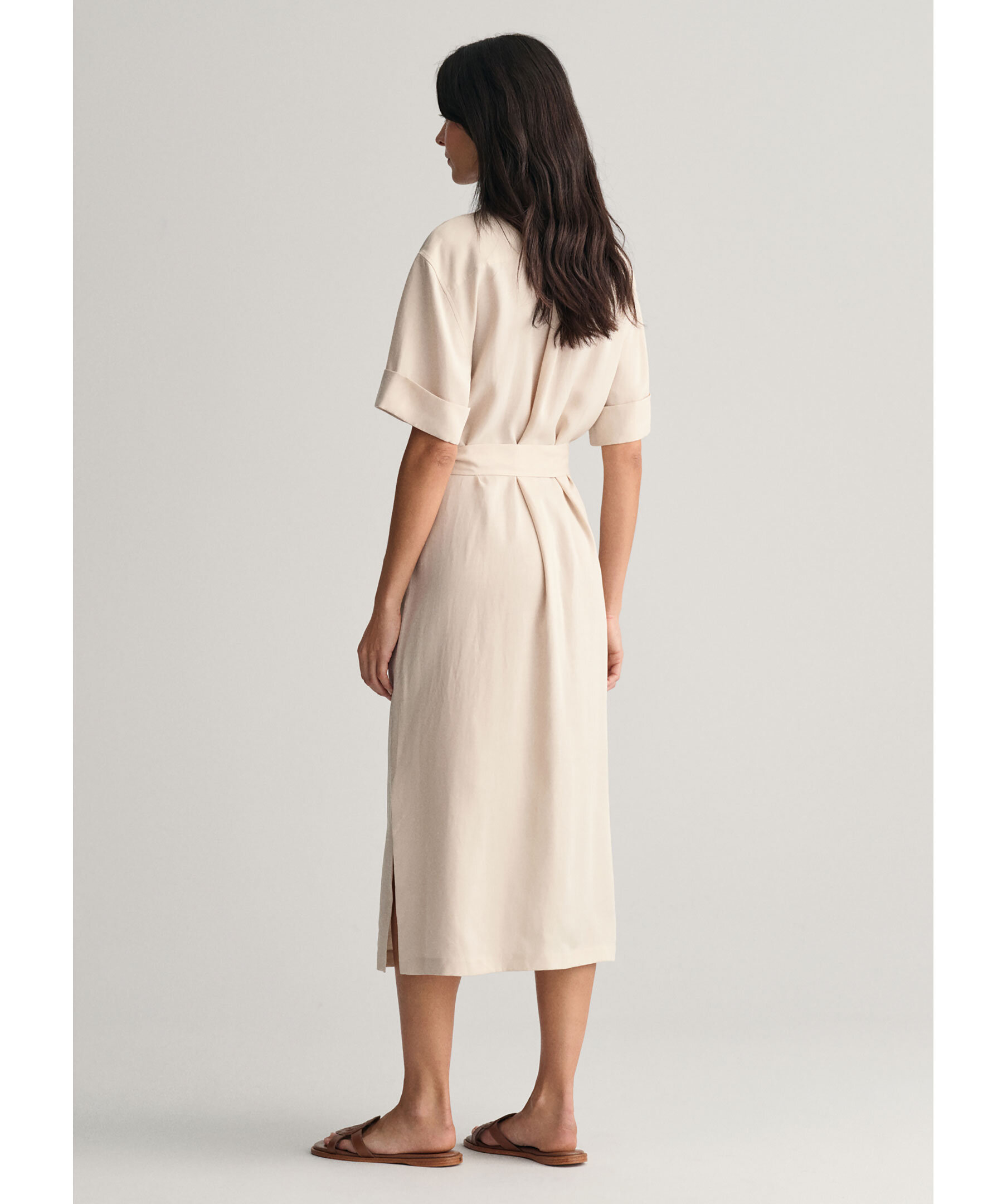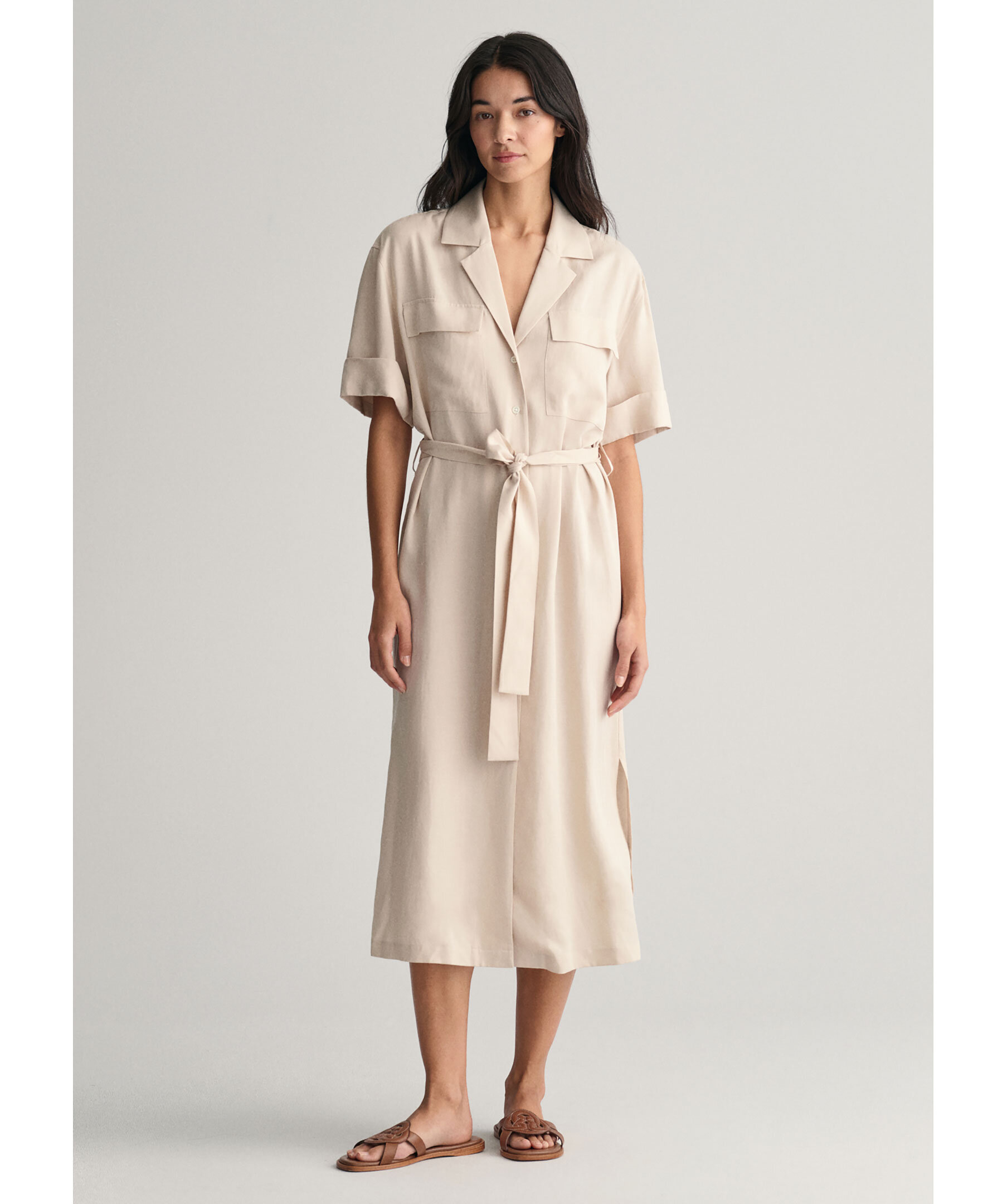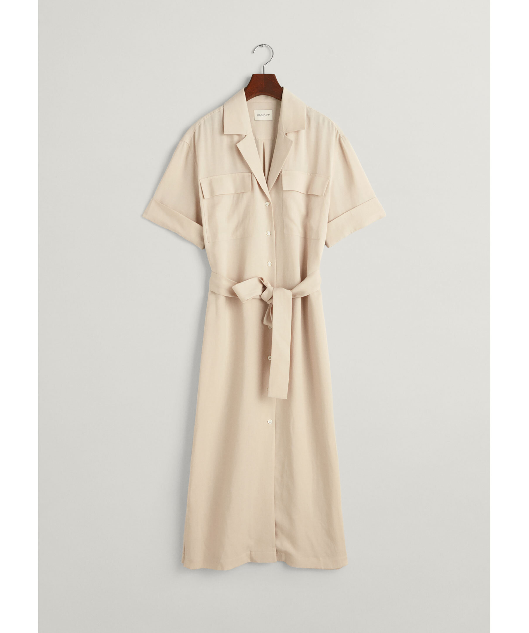 Sandfärgad midiklänning från Gant. V-ringning med bowlingkrage, bröstfickor med lock, uppvikta korta ärmar och ett bälte i midjan. Ytterligare detaljer inkluderar pärlemorknappar och boxpleat med deras klassiska locker loop i ryggen. Tillverkad i en följsam lyocell- och linneblandning för en mjuk känsla och draperad look. Relaxed fit, för en mer figurnära passform rekommenderar vi att du väljer en mindre storlek.