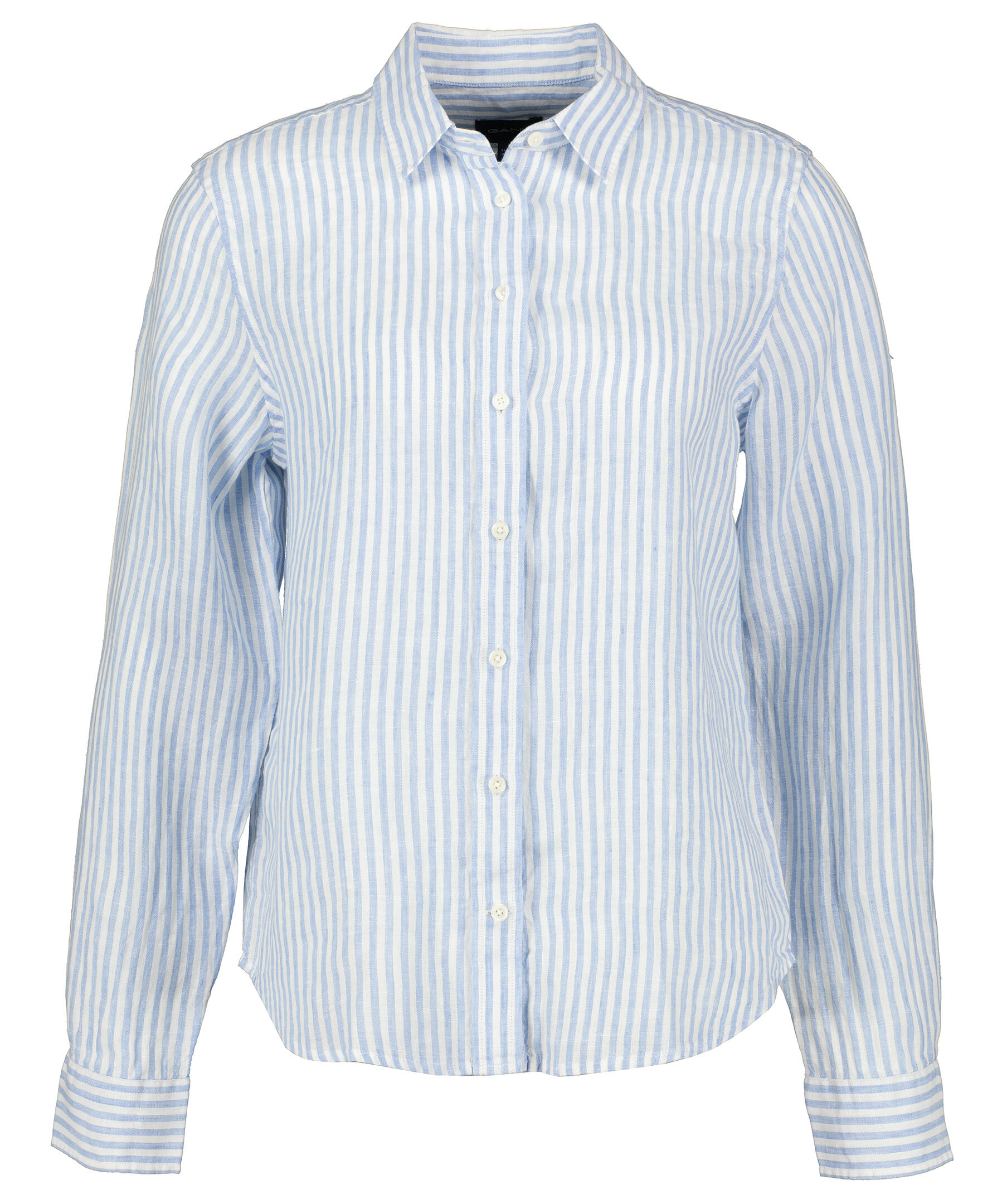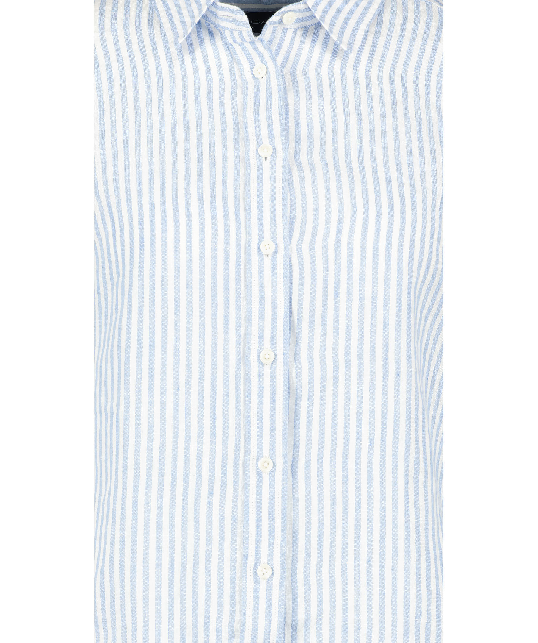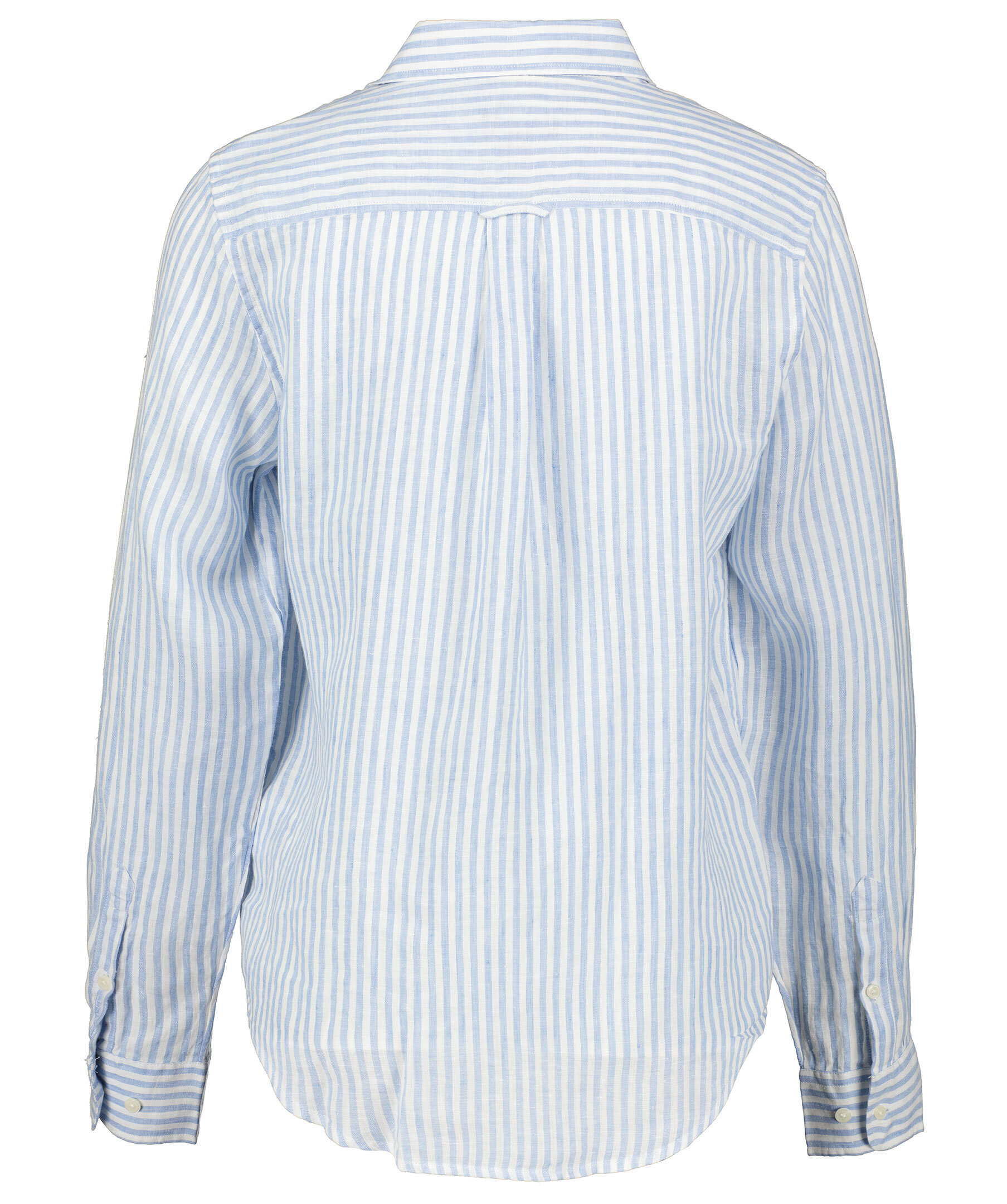 Vit och ljusblå randig Linneskjorta från Gant. Broderad GANT-logotyp på vänster manschett. Justerbara manschetter. Locker loop och boxpleat på ryggen.