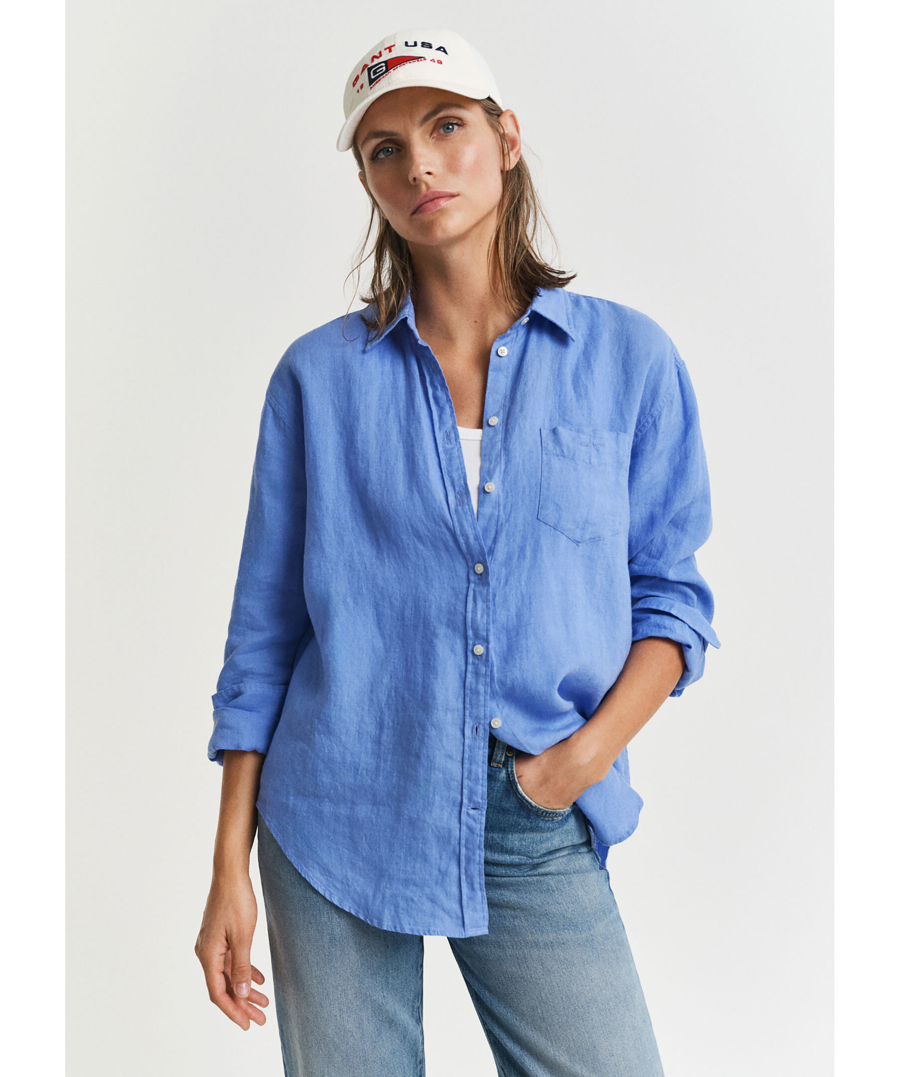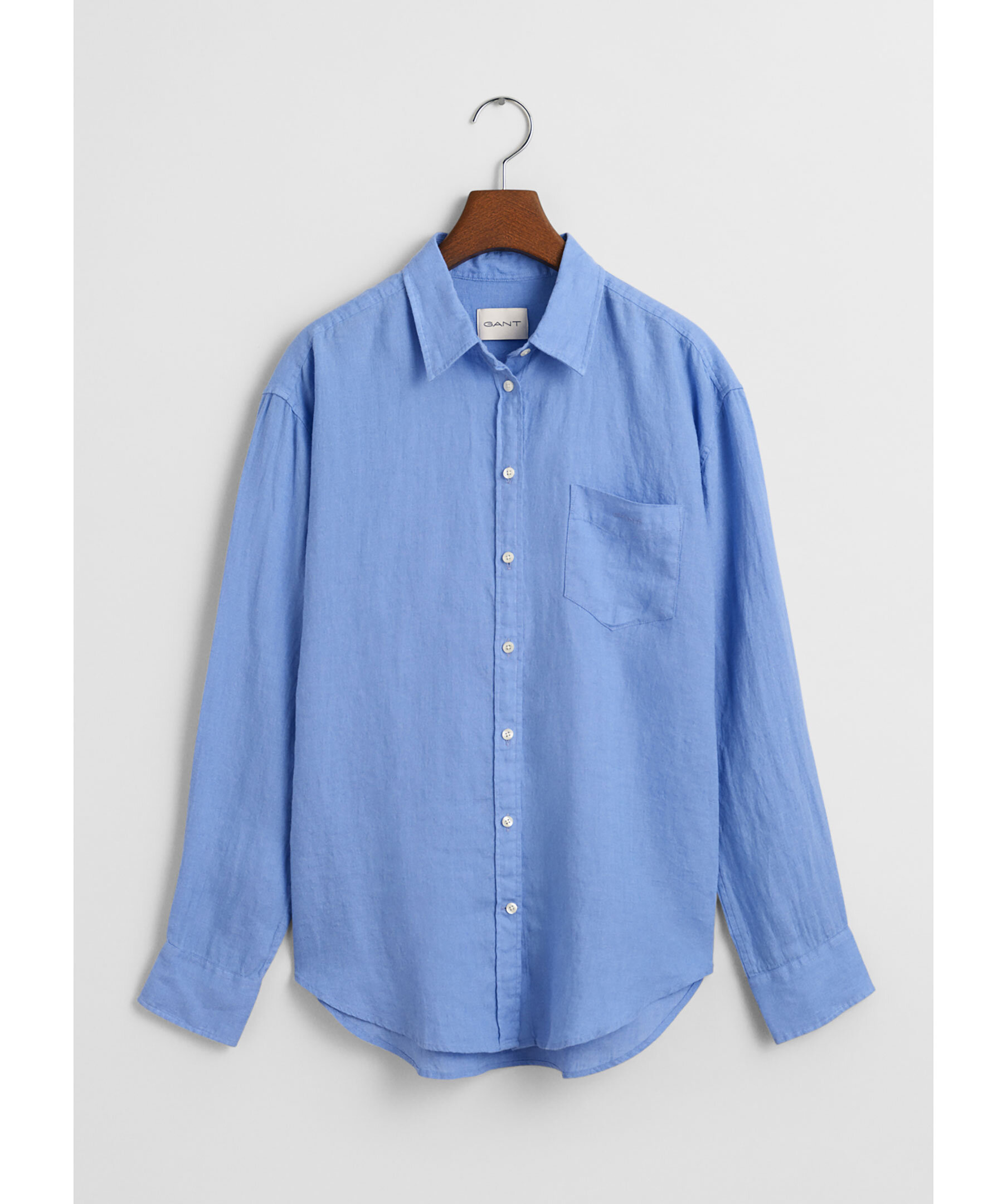 Denna skjorta har en avslappnad passform vill du ha en mer åtsittande rekommenderar vi att gå ned i storlek. Blå linneskjorta från Gant. Skjortan har rundade avslut och justerbara ärmslut. Tillverkad av 100% linne.