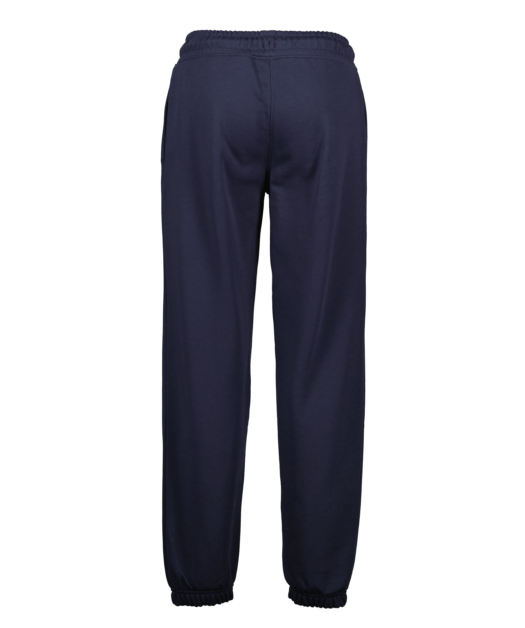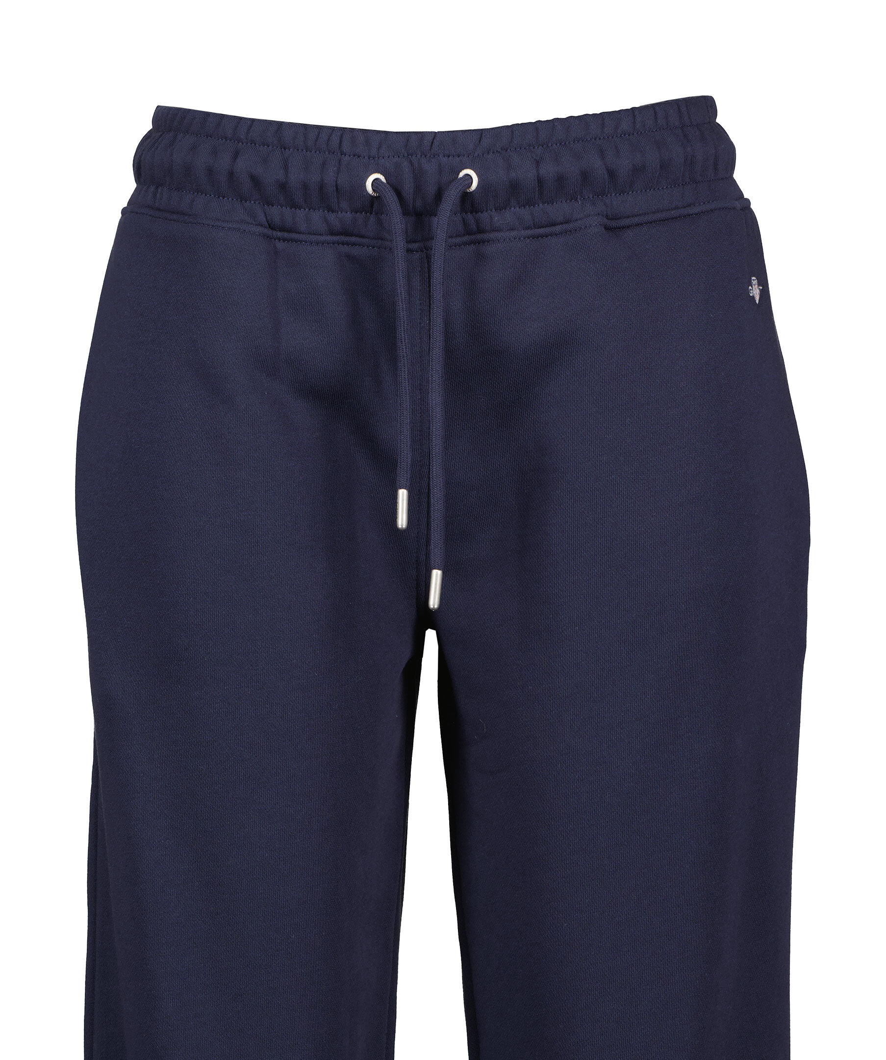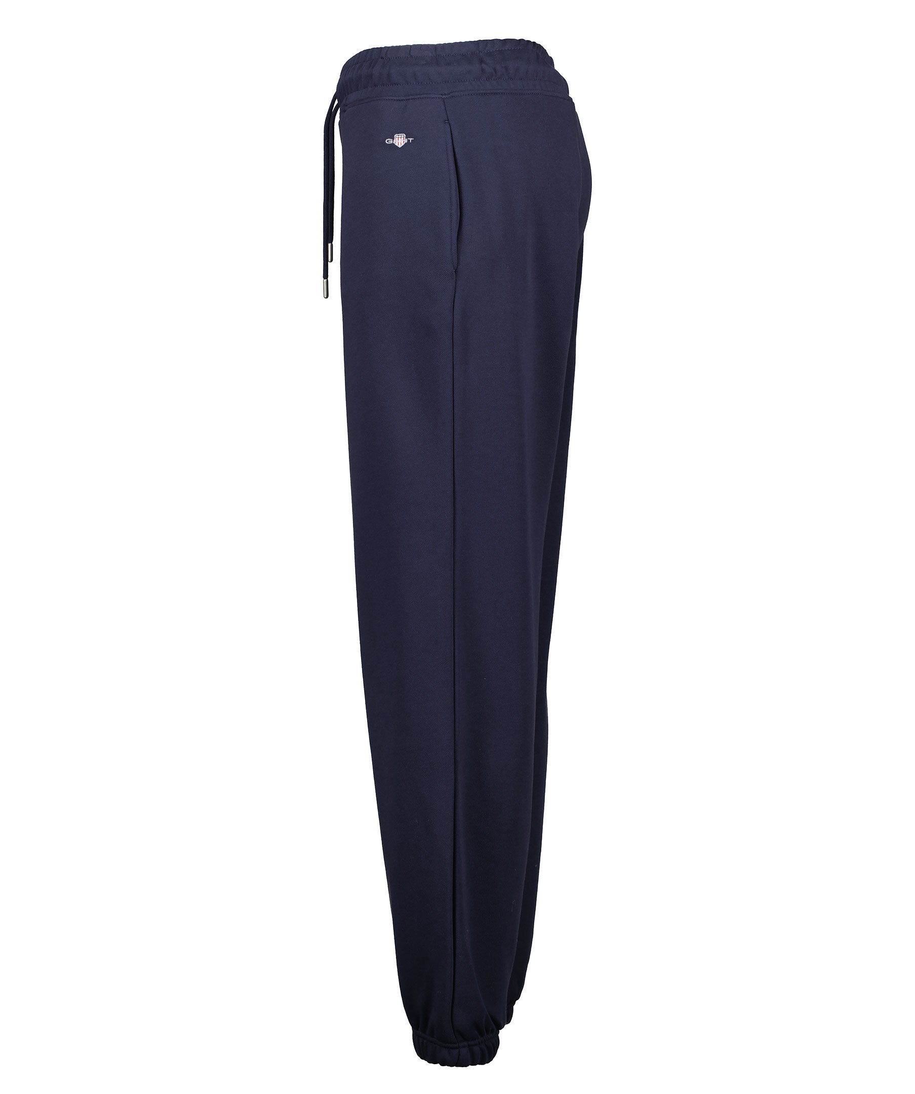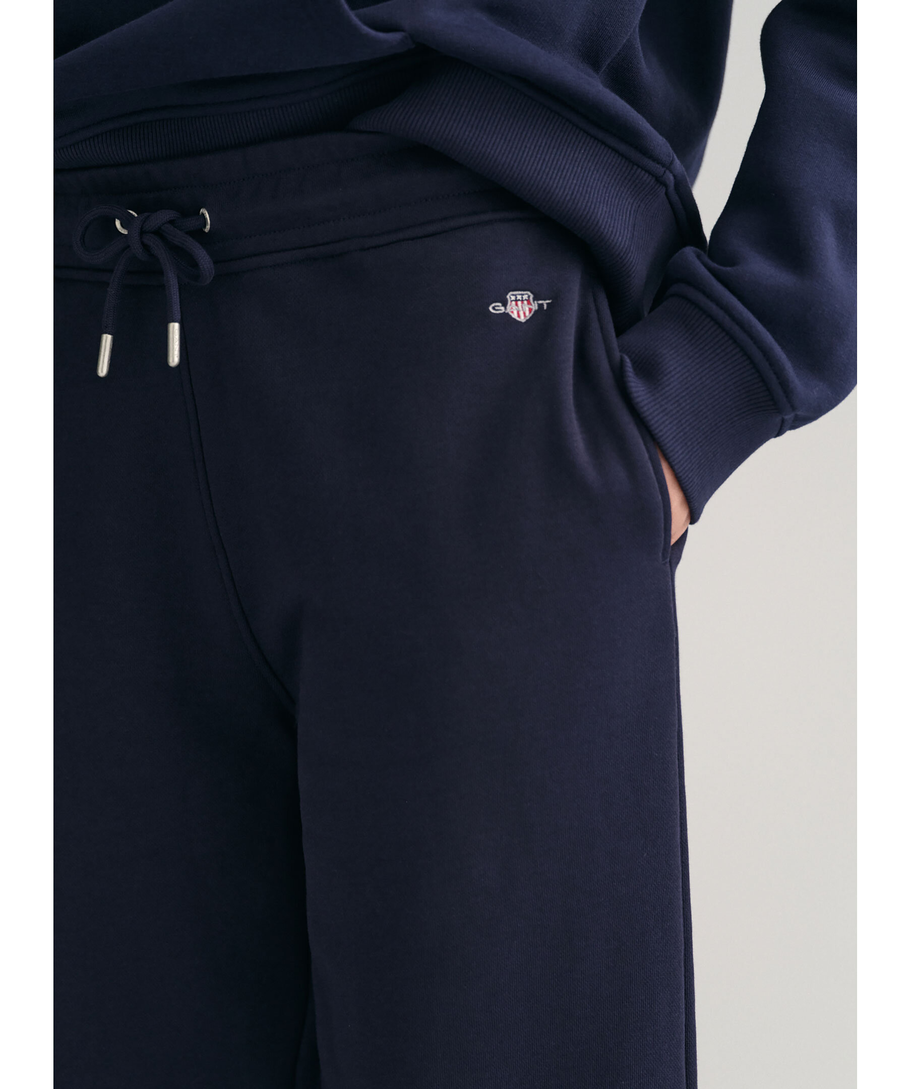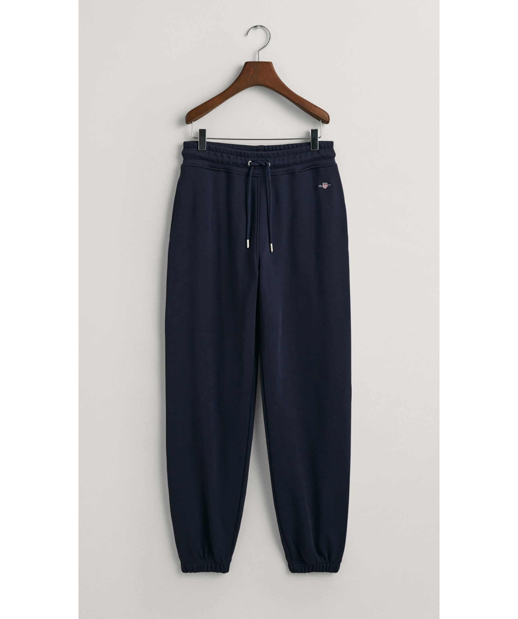 Marinblåa sweatpants med liten sköldlogotyp broderad på ena benet från Gant i en snygg kombination av klassiskt preppy och modernt streetwear. Byxorna är gjorda i en mjuk bomullsblandning och har en mellanhög midja, relaxed fit, resårmuddar, dragsko i midjan och sidfickor.