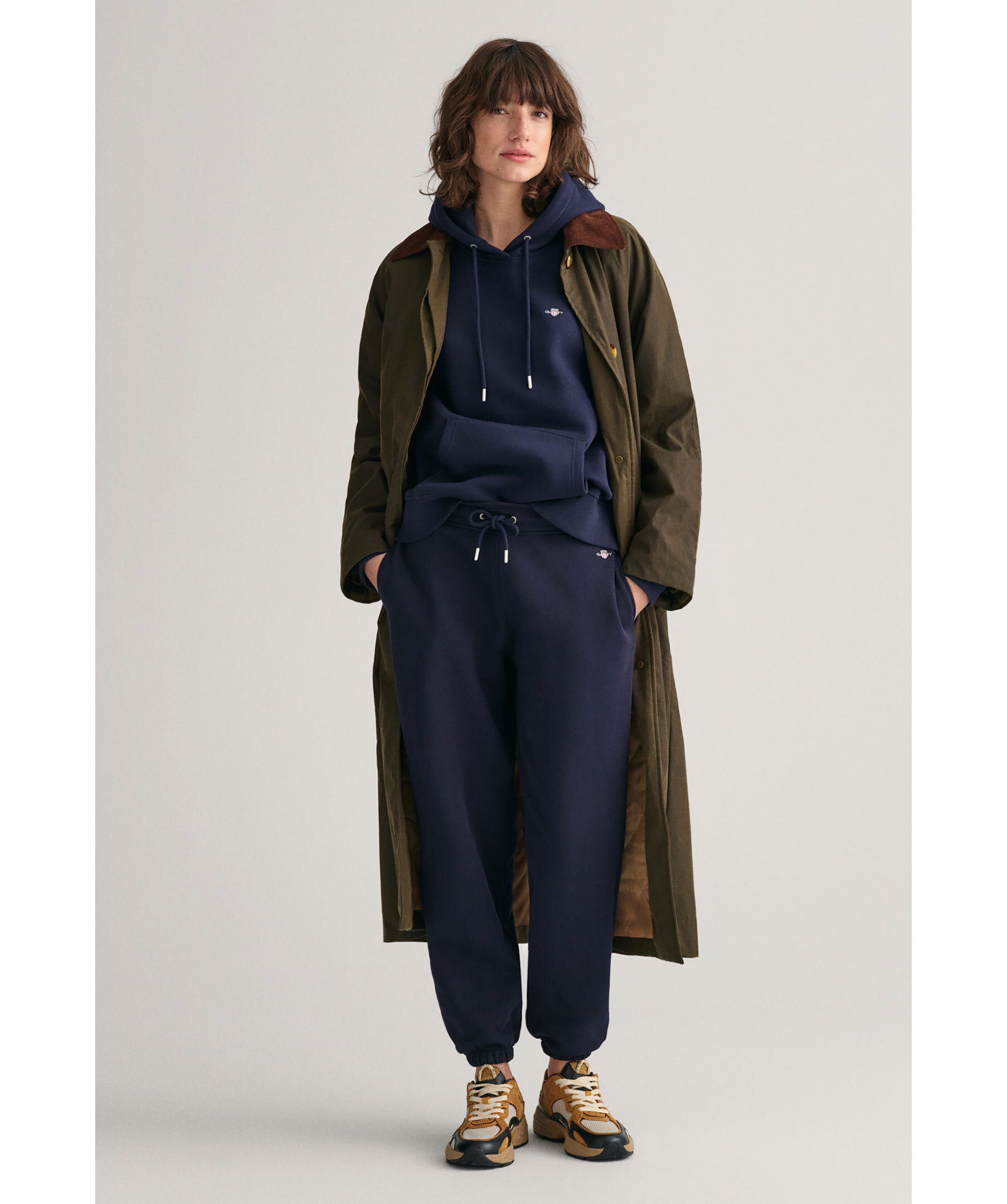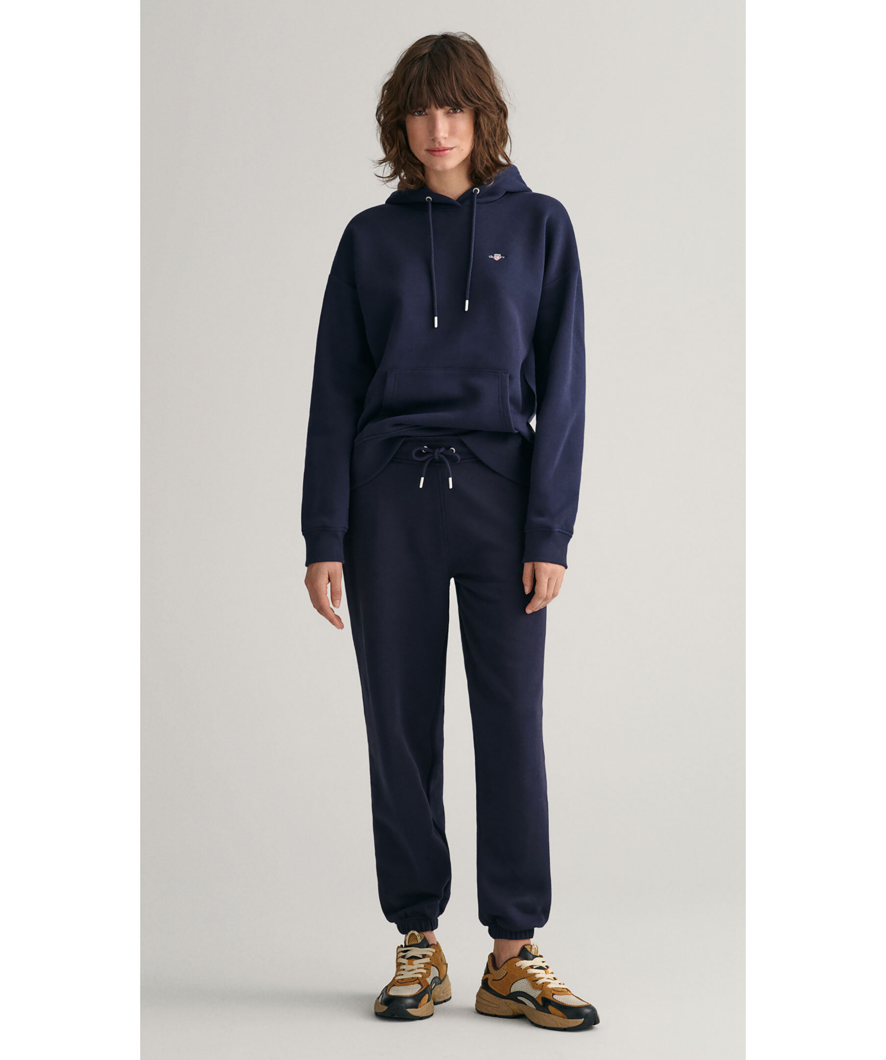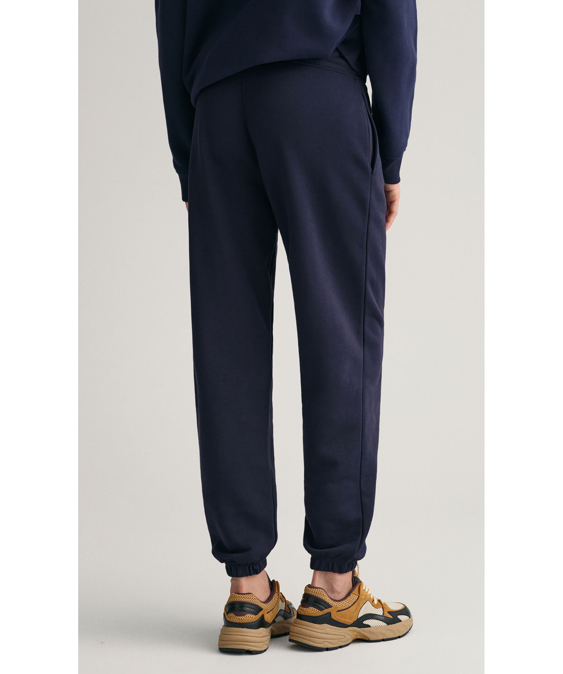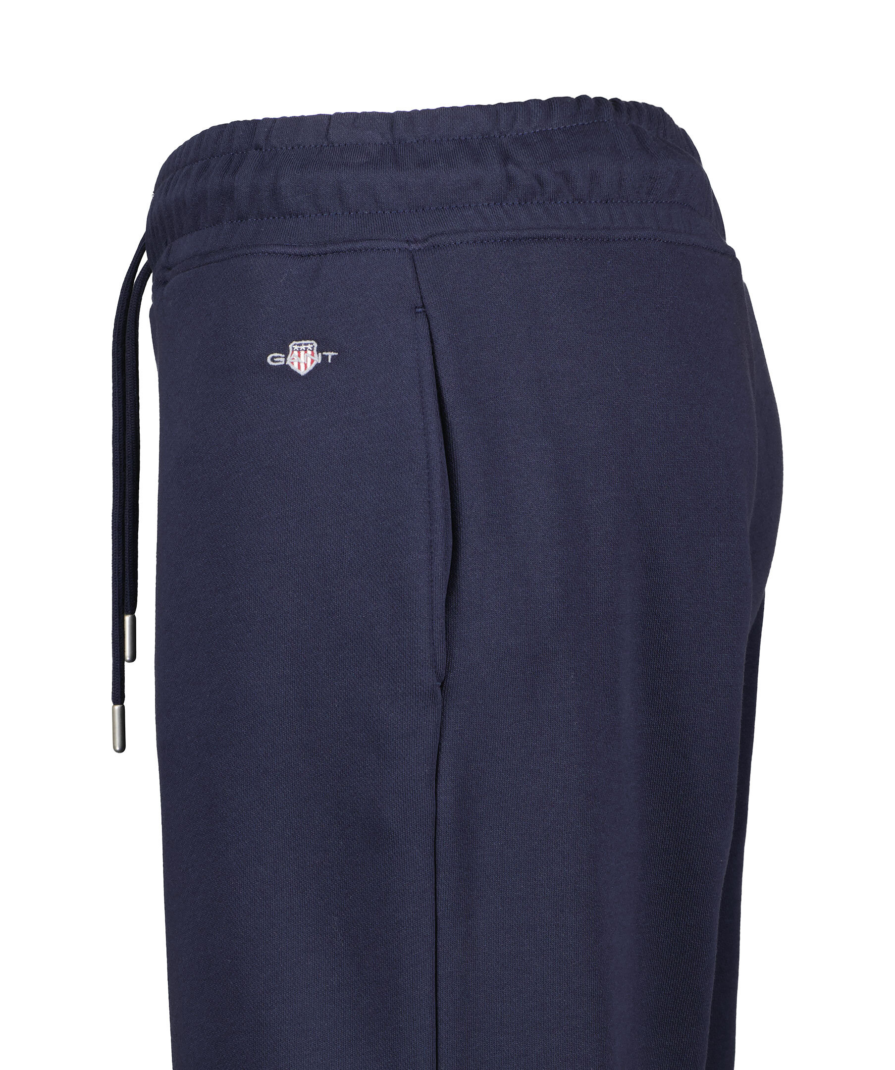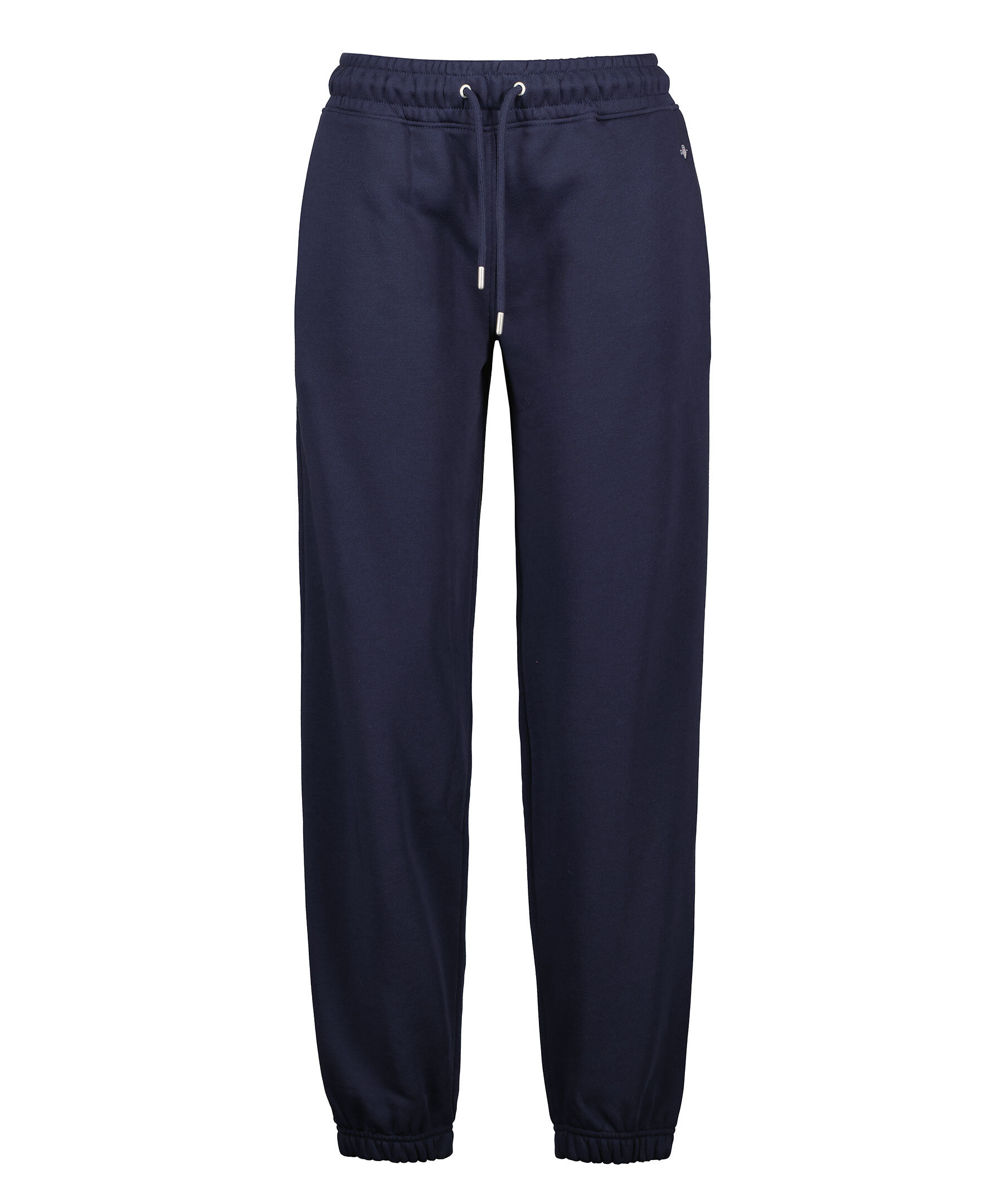 Marinblåa sweatpants med liten sköldlogotyp broderad på ena benet från Gant i en snygg kombination av klassiskt preppy och modernt streetwear. Byxorna är gjorda i en mjuk bomullsblandning och har en mellanhög midja, relaxed fit, resårmuddar, dragsko i midjan och sidfickor.