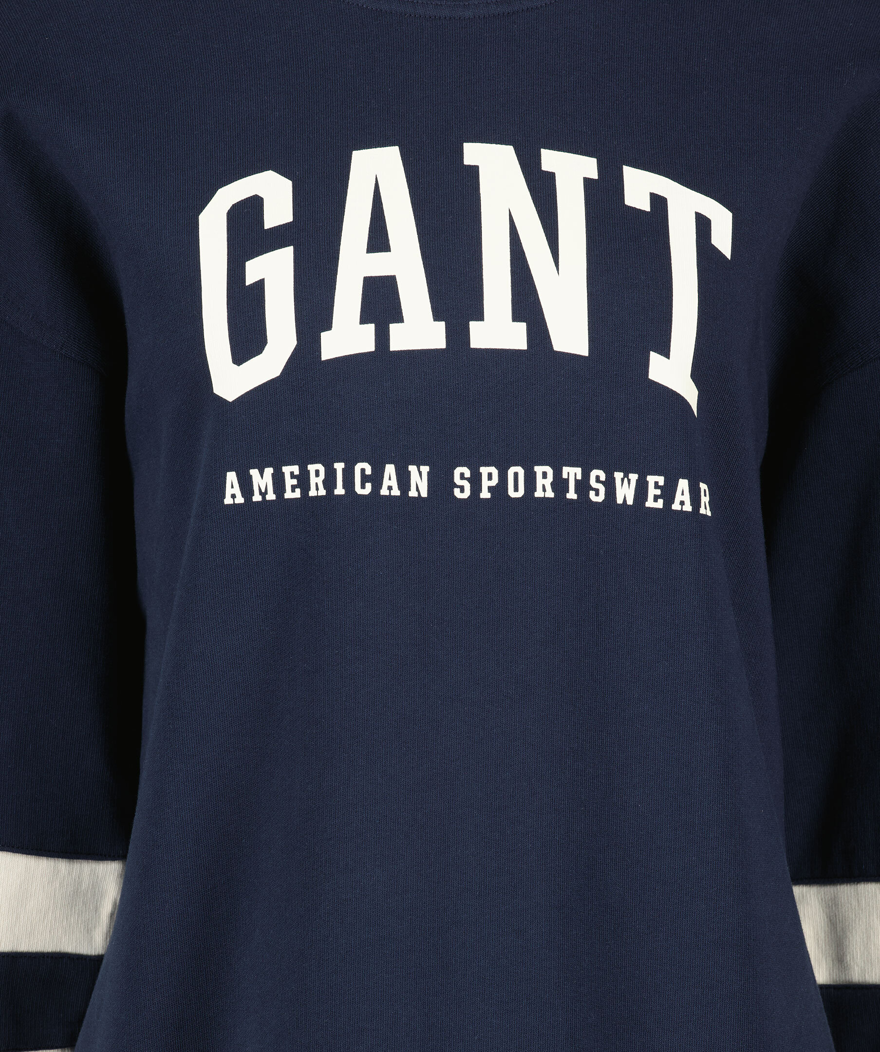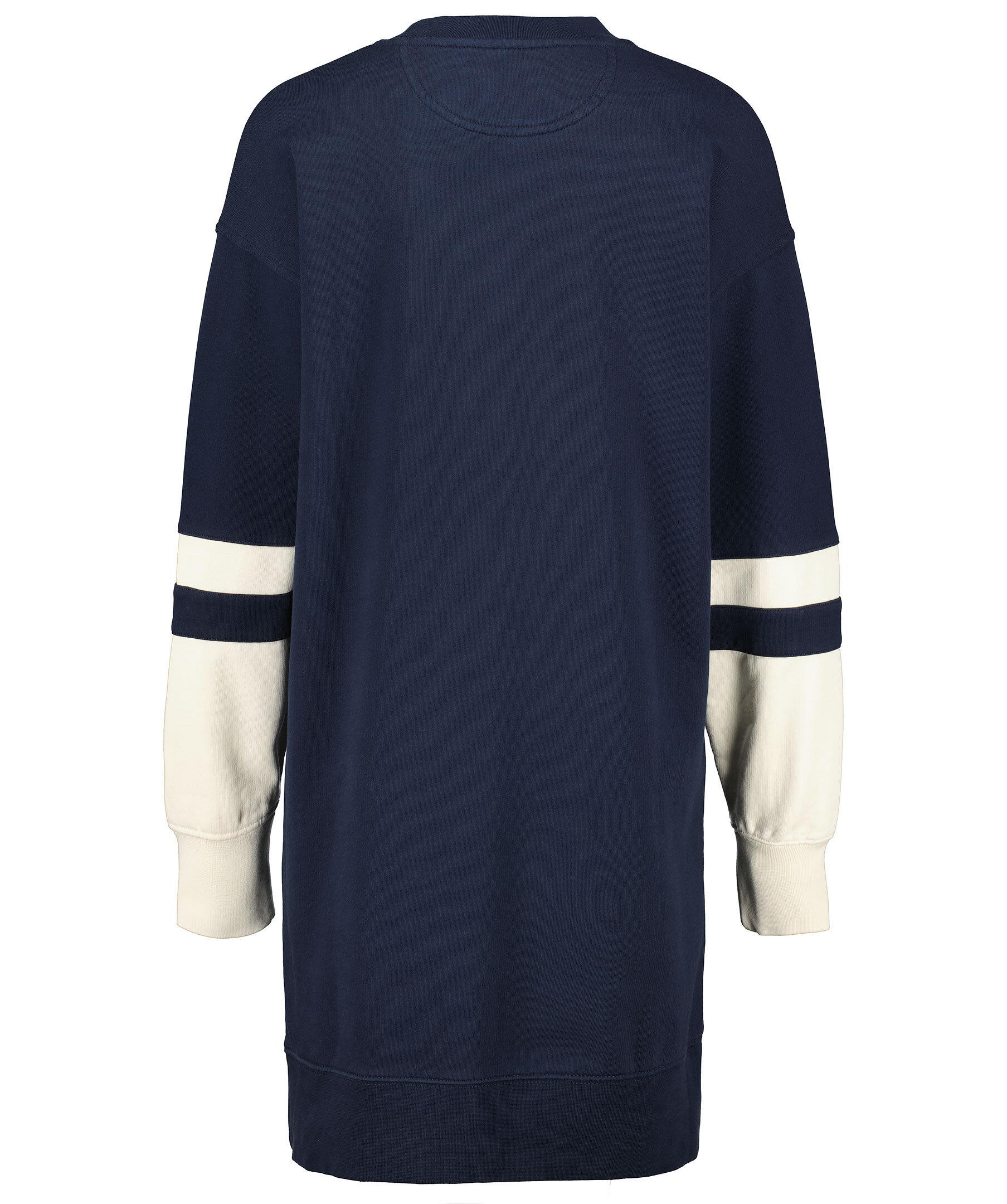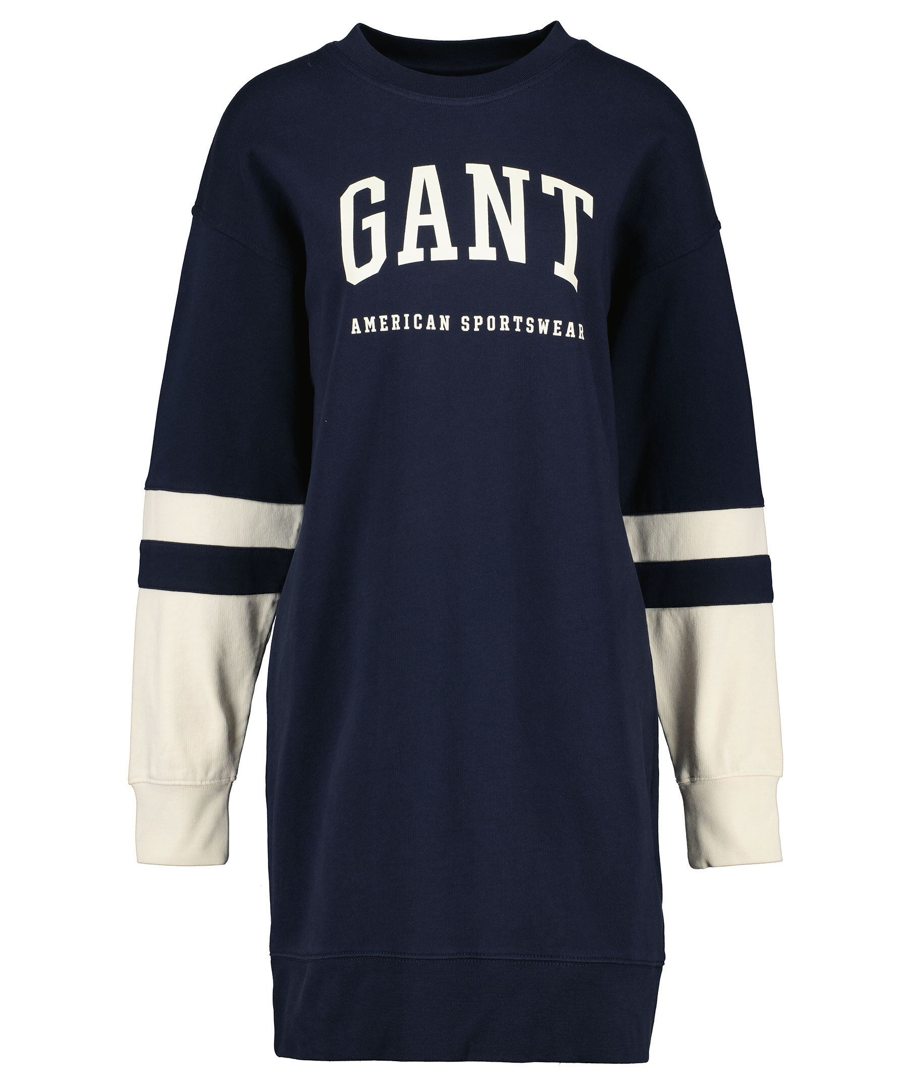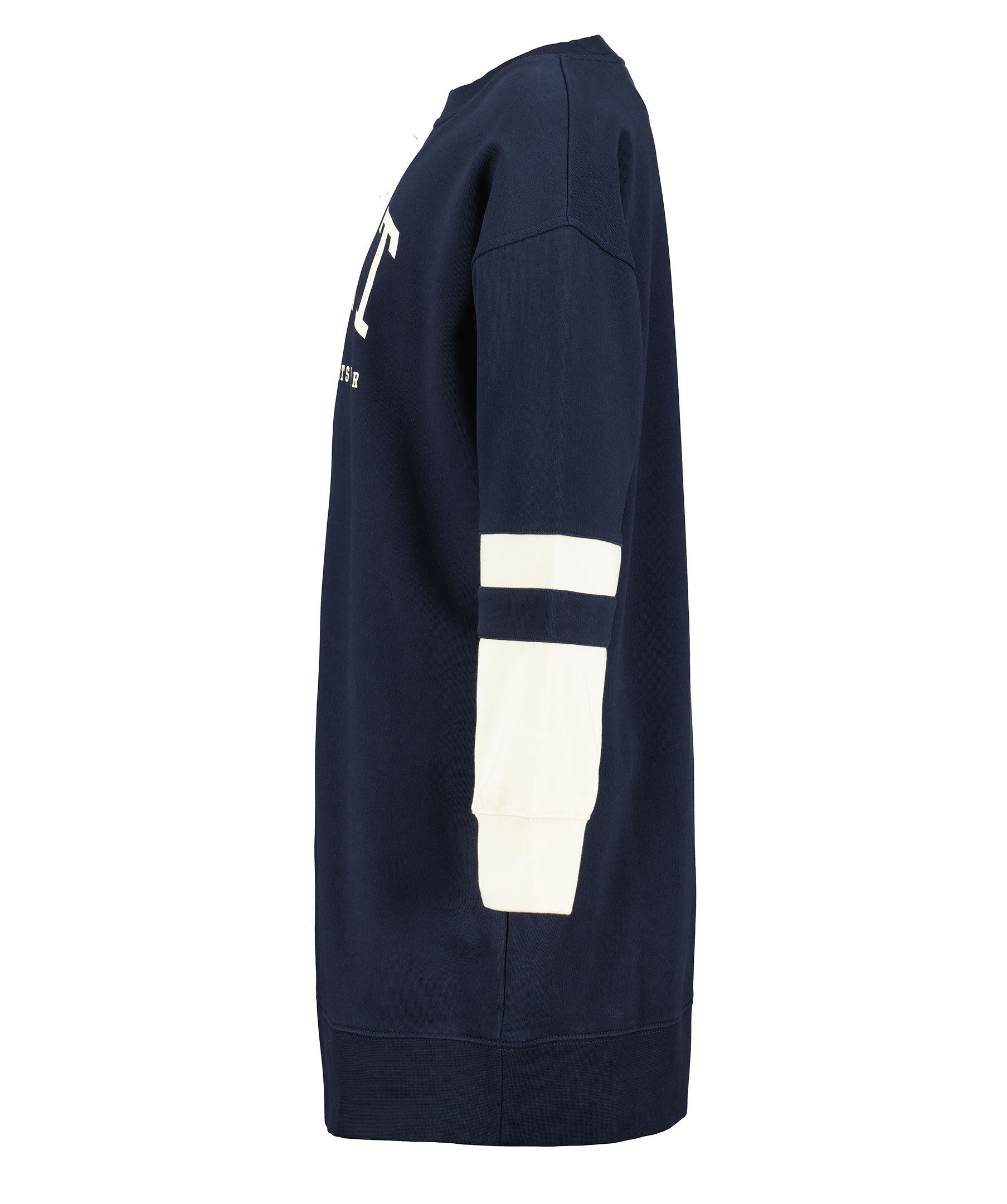 Marinblå sweatshirtklänning i oversizemodell från Gant med vita block. Rundad halsringning, mudd i ärmslut och plaggslut samt tryckt logotyp över bröstet. Block och rand i vitt på ärmslutet.