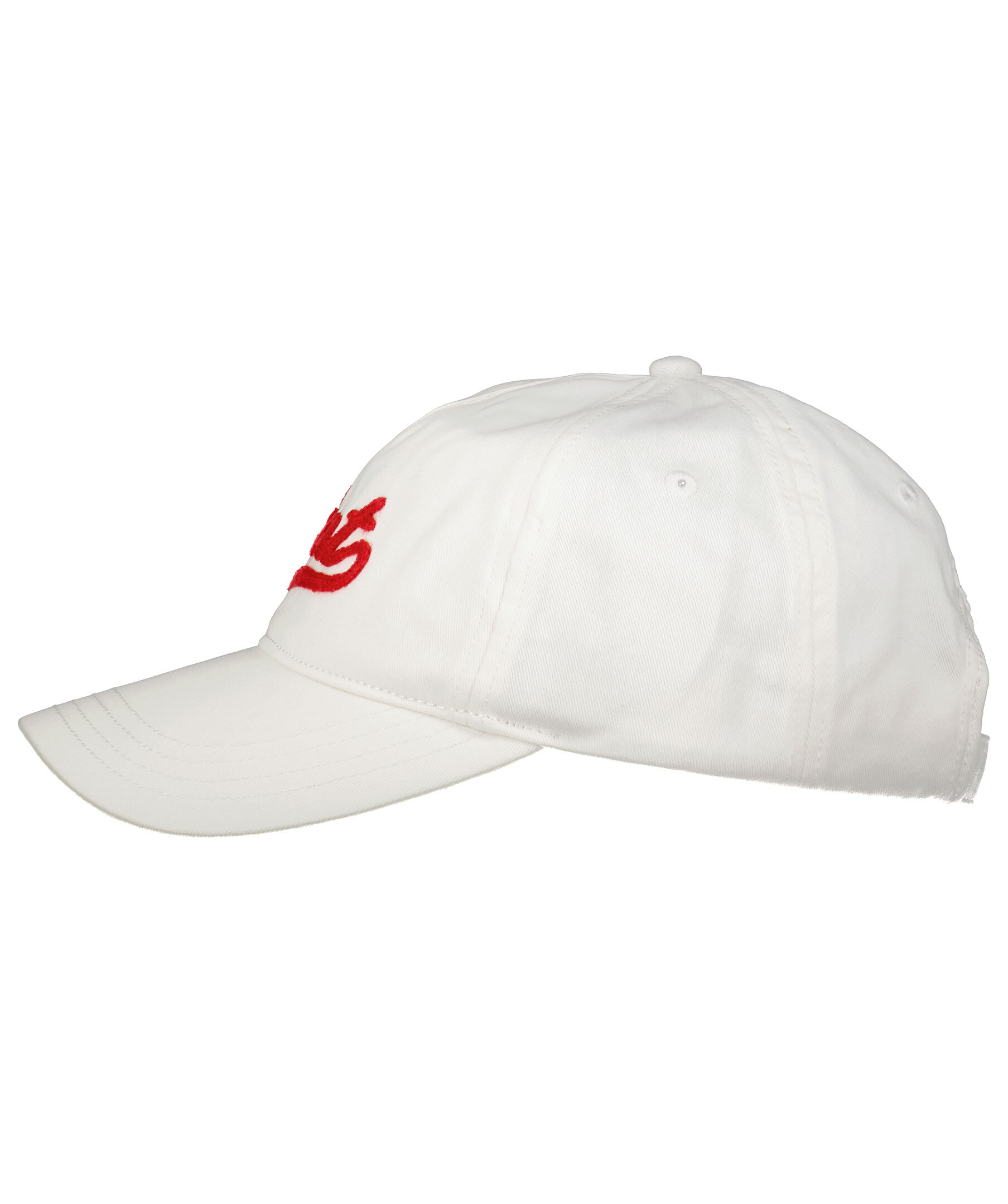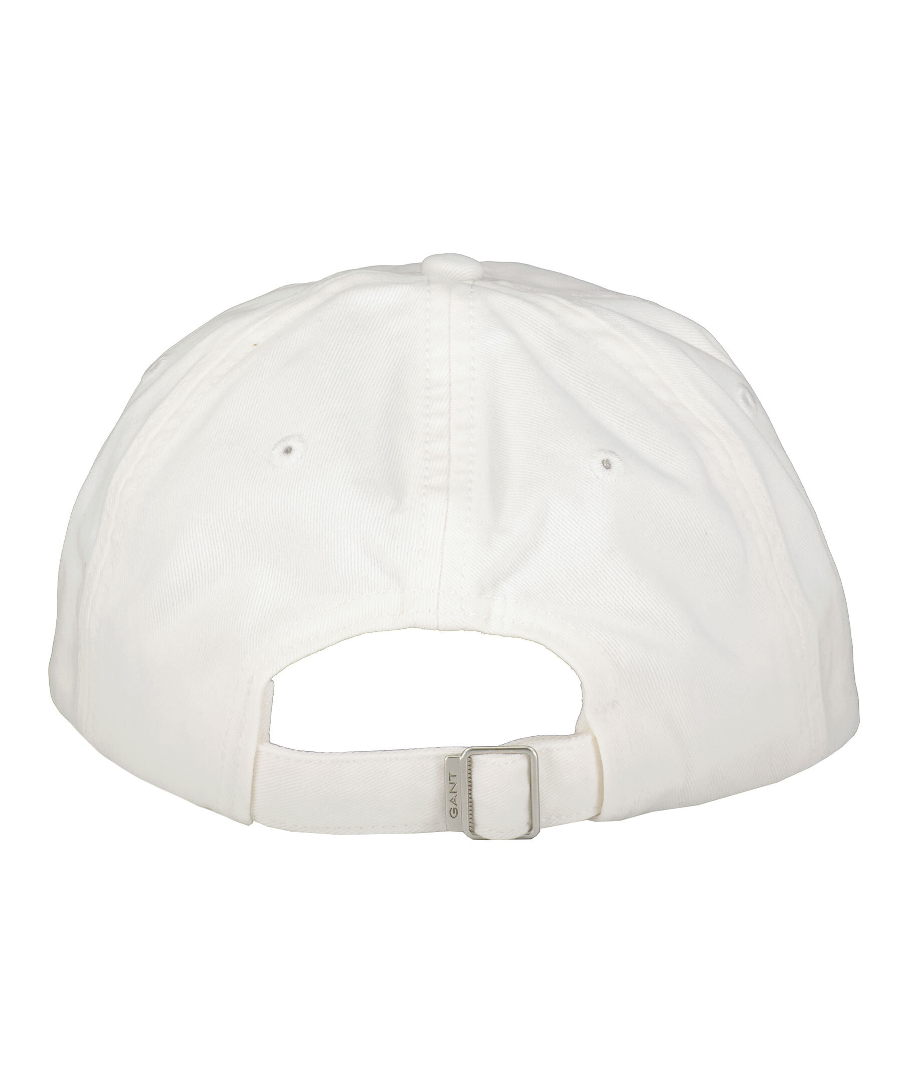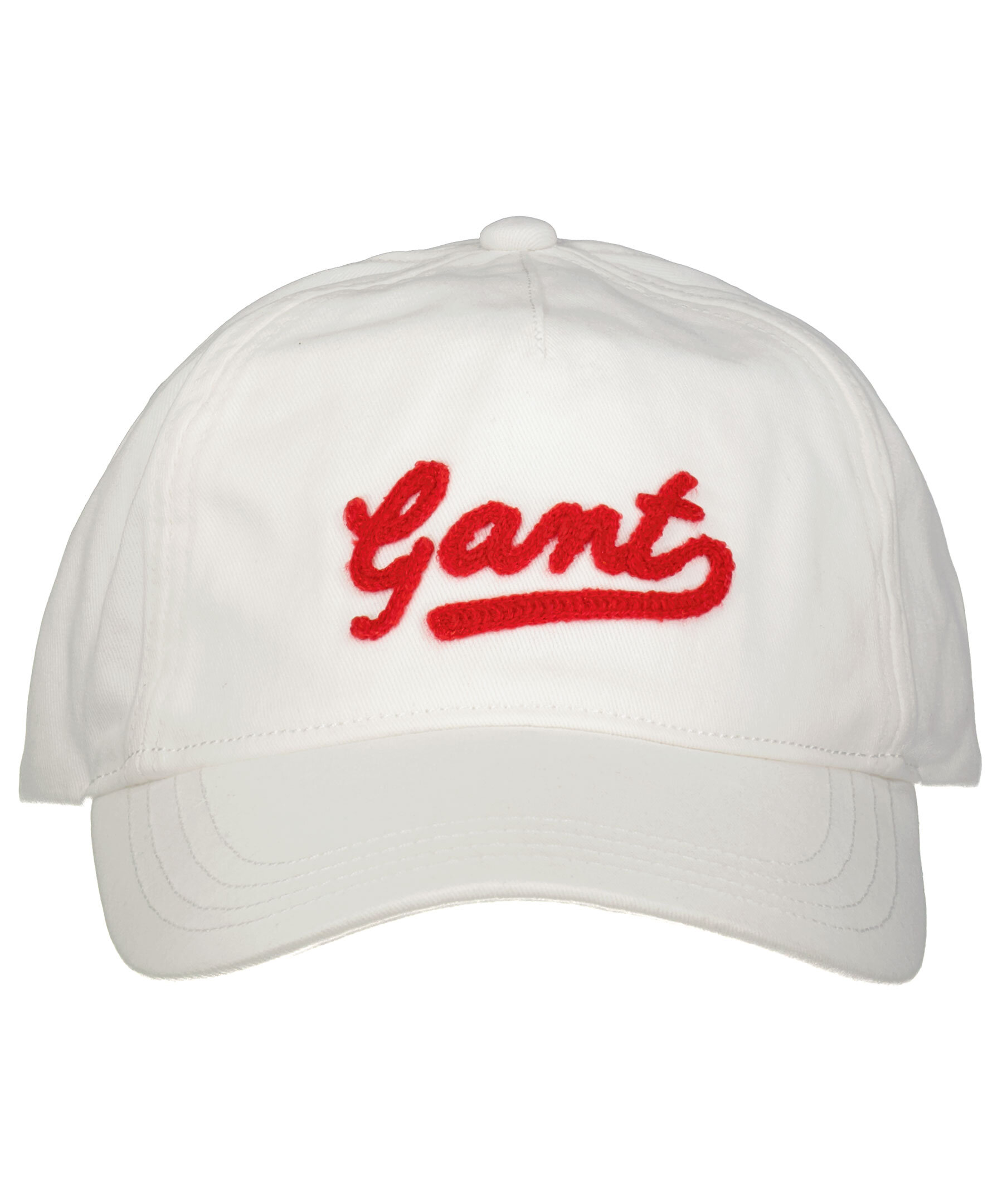 Vit keps från Gant. Röd broderad logotyp i skrivstil framtill och ett reglerbart spänne baktill.