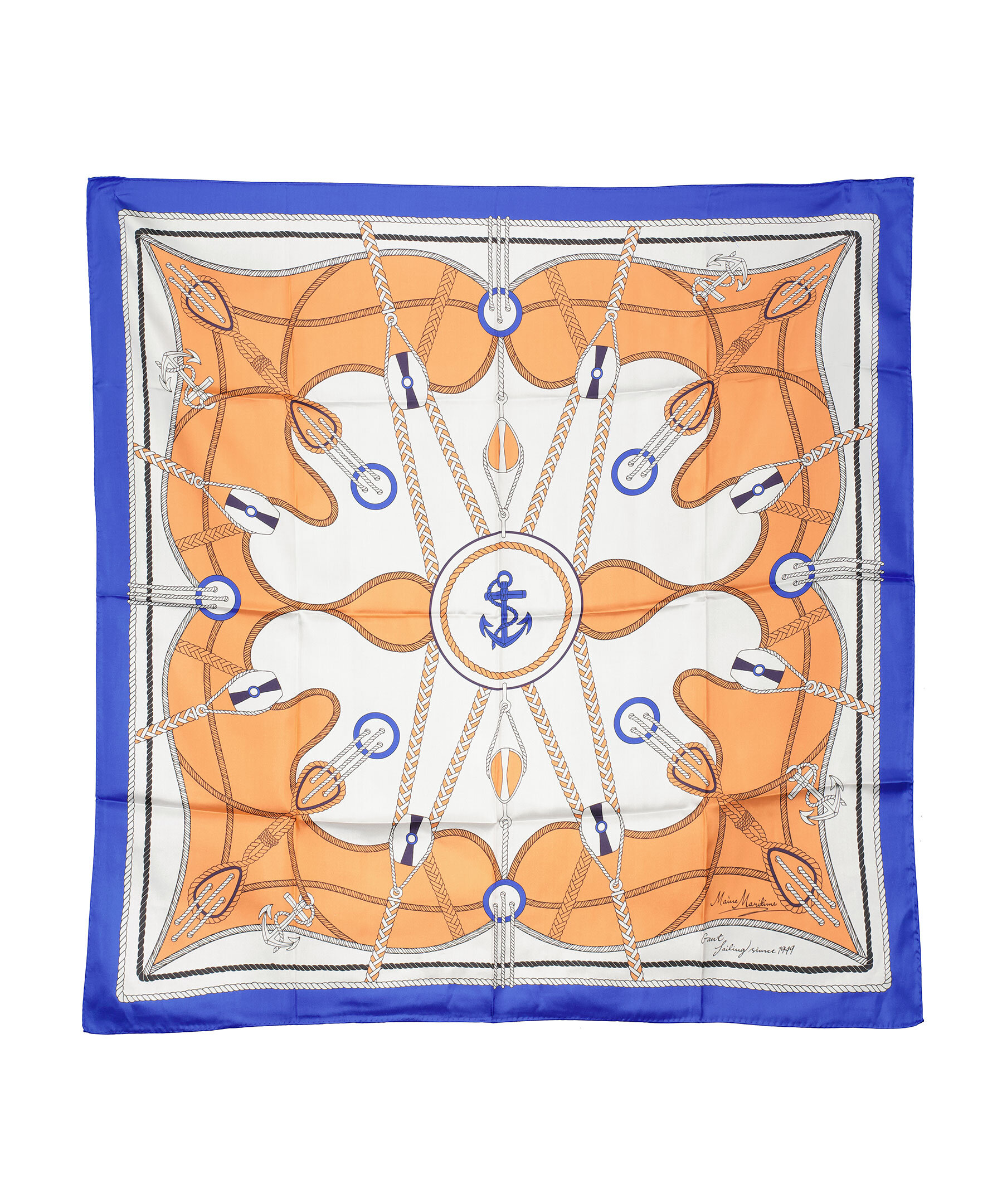 Mönstrad silkesscarf från Gant i blått, svart, vitt och aprikos. Mönstret har sjötema.