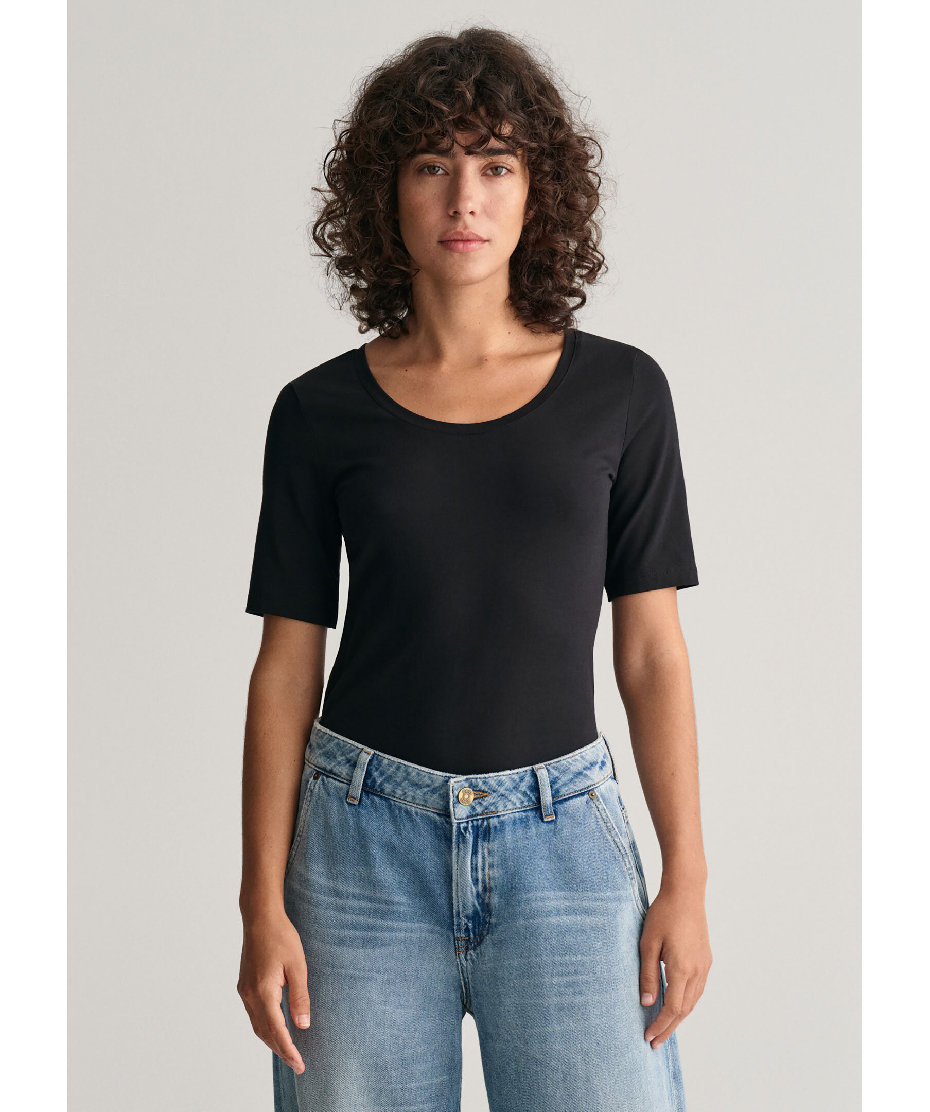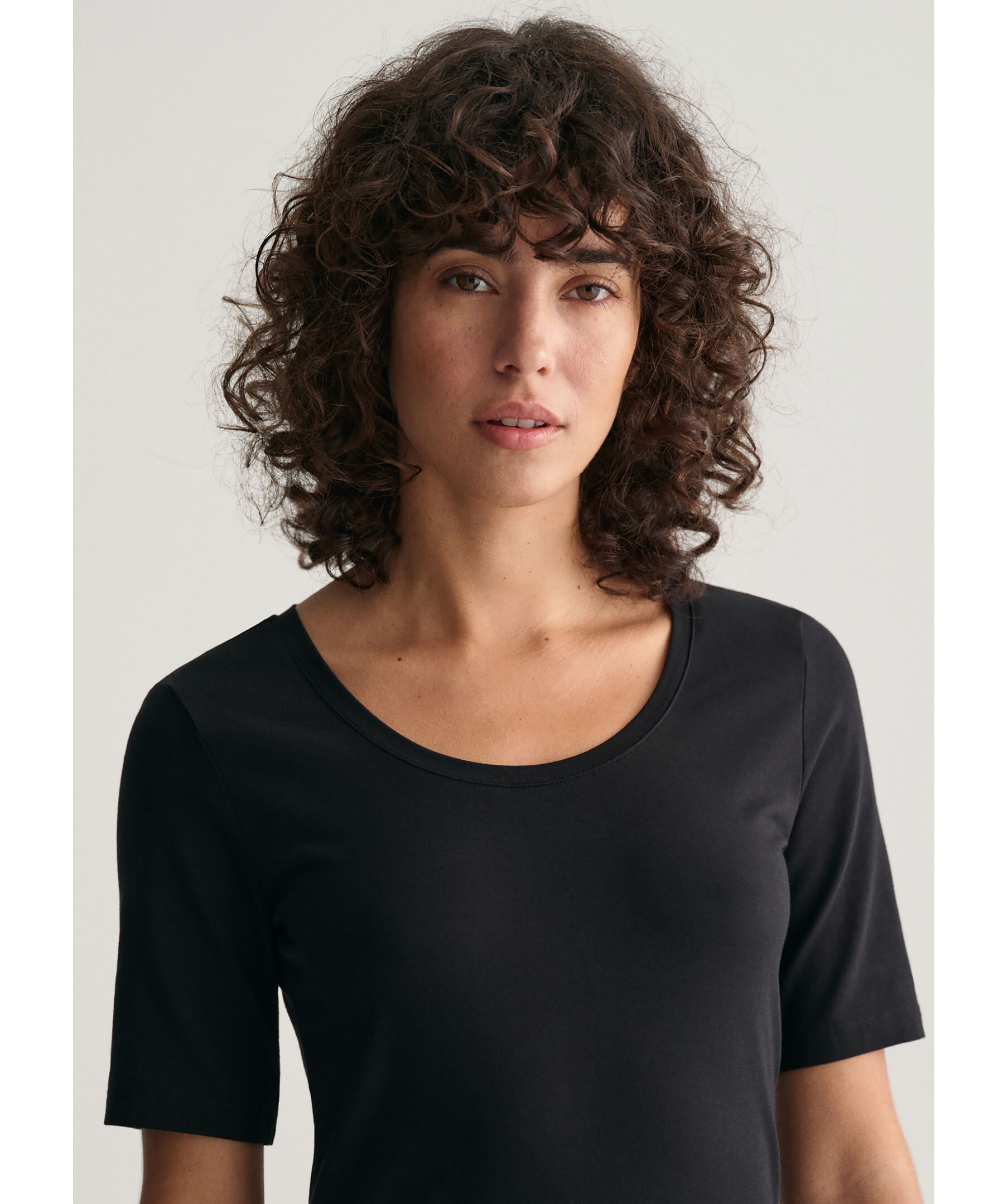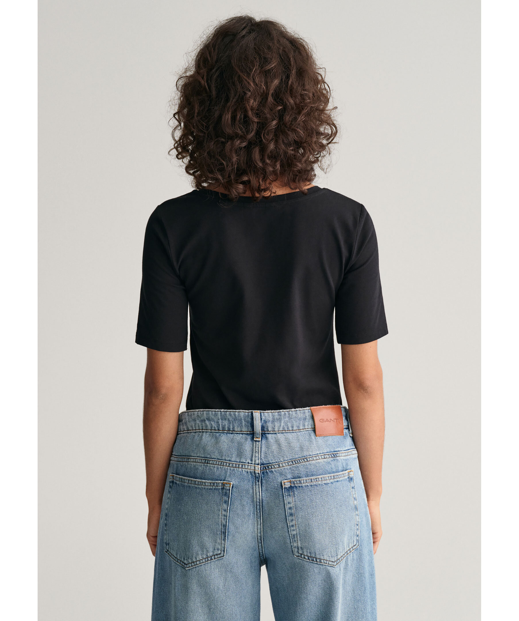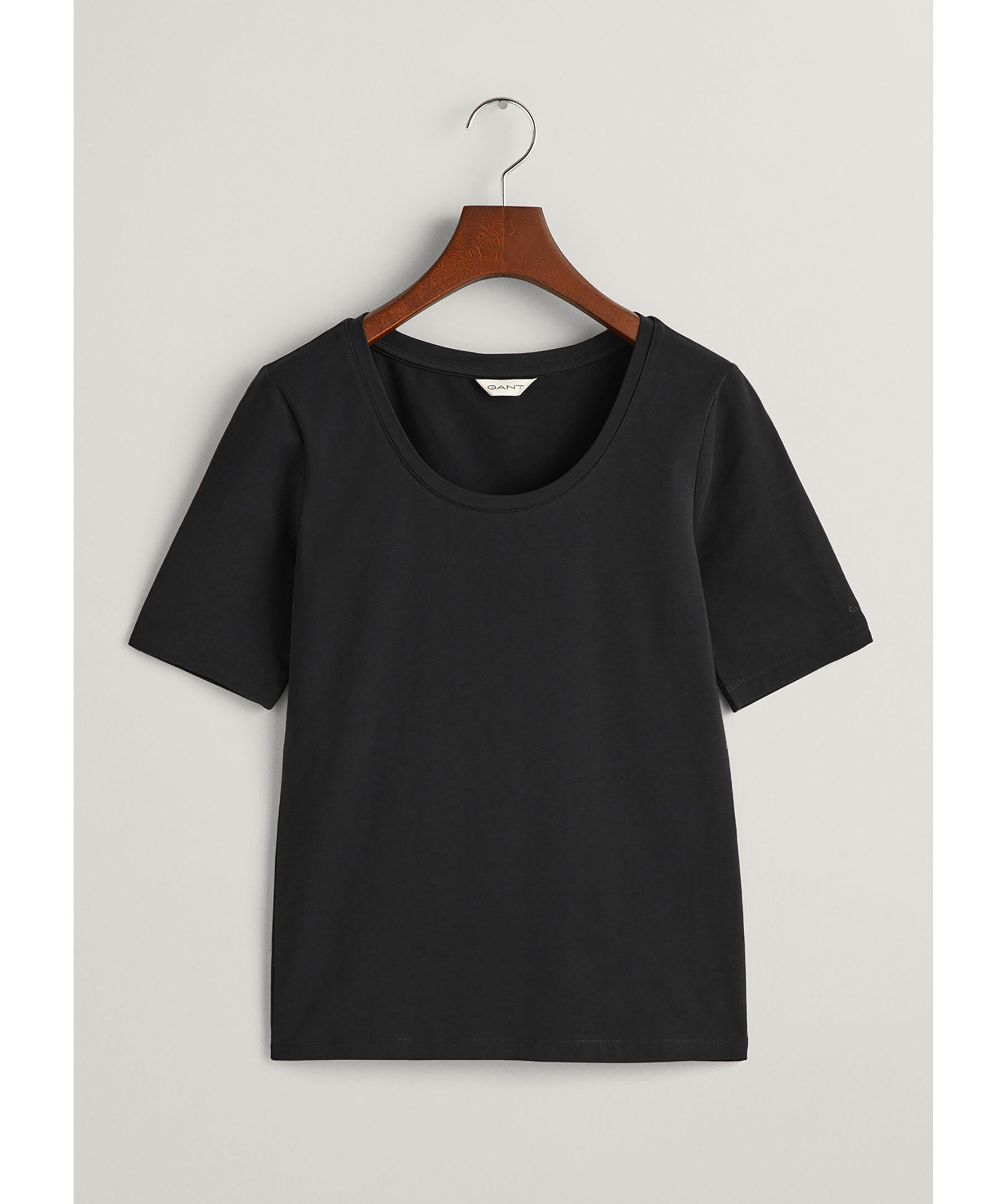 Svart topp med kort ärm från Gant. Toppen har en smickrande djup och rund halsringning samt en GANT-logotyp broderad ton i ton på ärmen. Tillverkad i en bomullsblandning.
