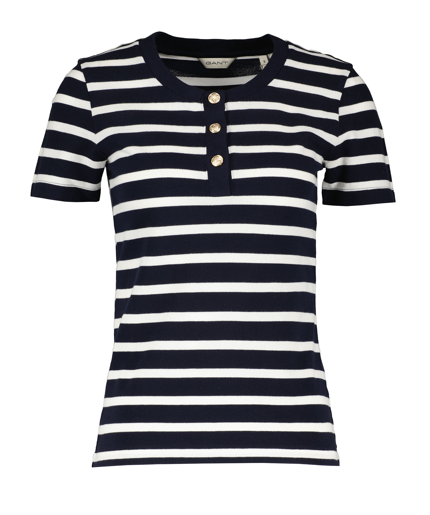 Marinblå och vitrandig, stickad piké t-shirt från Gant. Pikén har guldiga knappar framtill, rundad halsringning och korta ärmar. Tillverkad i bomull.