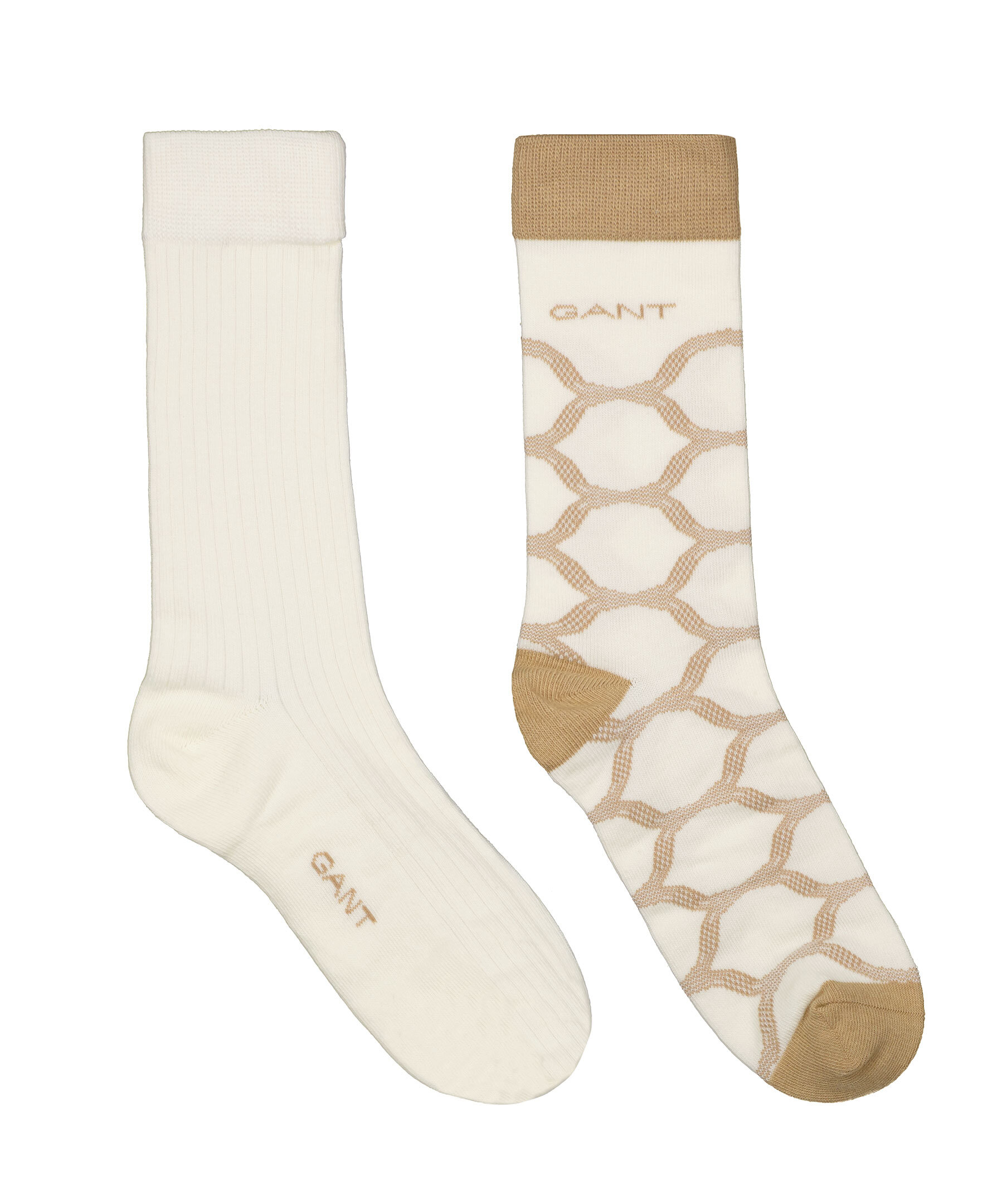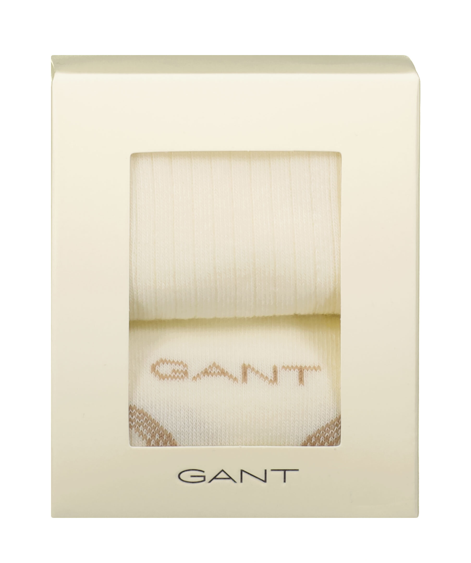 Krämvita strumpor från Gant. Tvåpack i presentförpackning. Ett ribbat par och ett mönstrat. Logotyp på skaftet respektive strumpans undersida. Skaftet slutar mitt på vaden. Tillverkade i bomullsblandning.