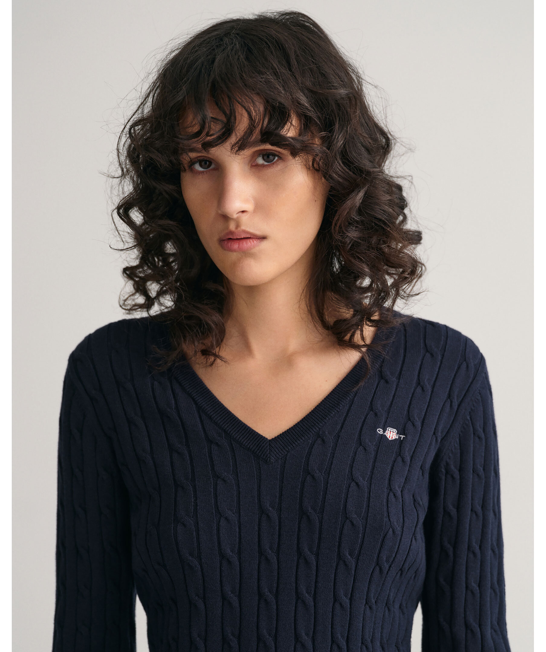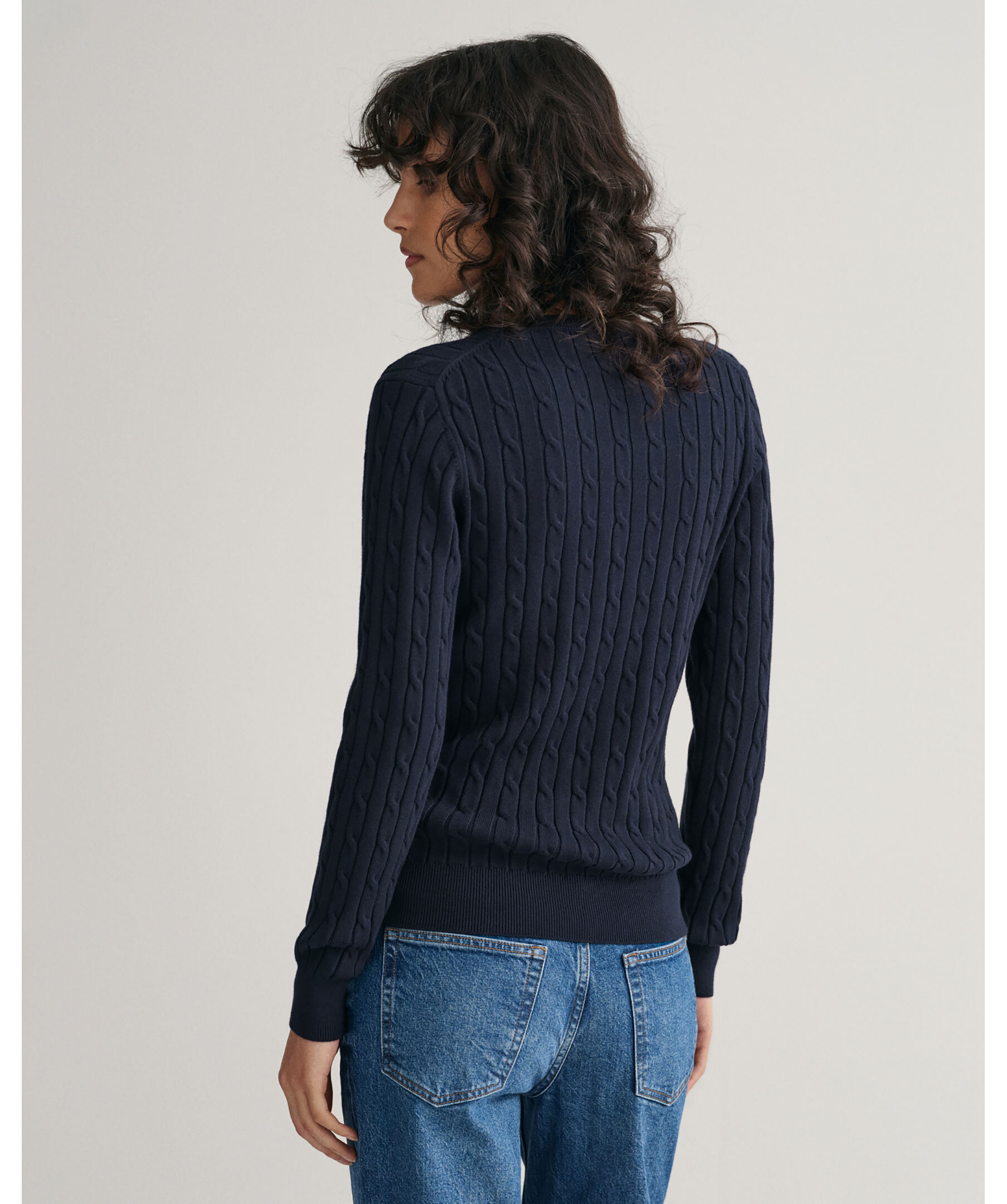 Marinblå, V-ringad kabelstickad tröja från Gant. Tillverkad i en mjuk bomullsblandning.