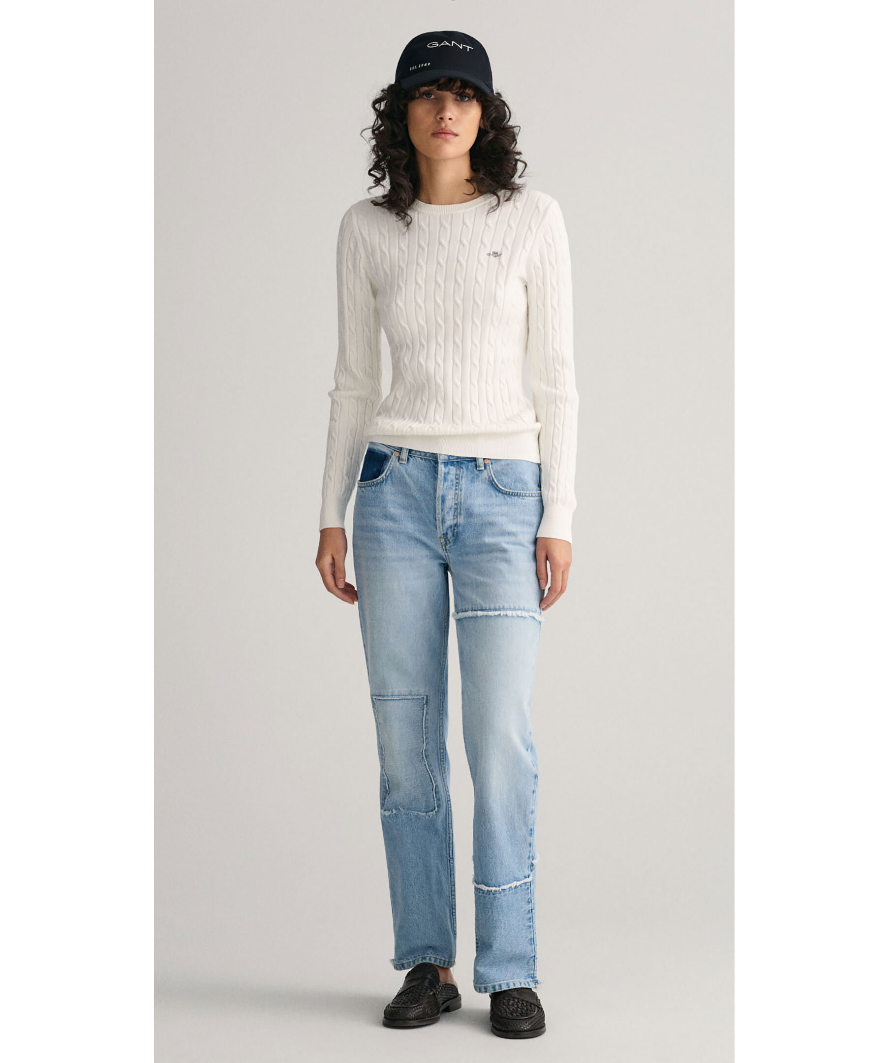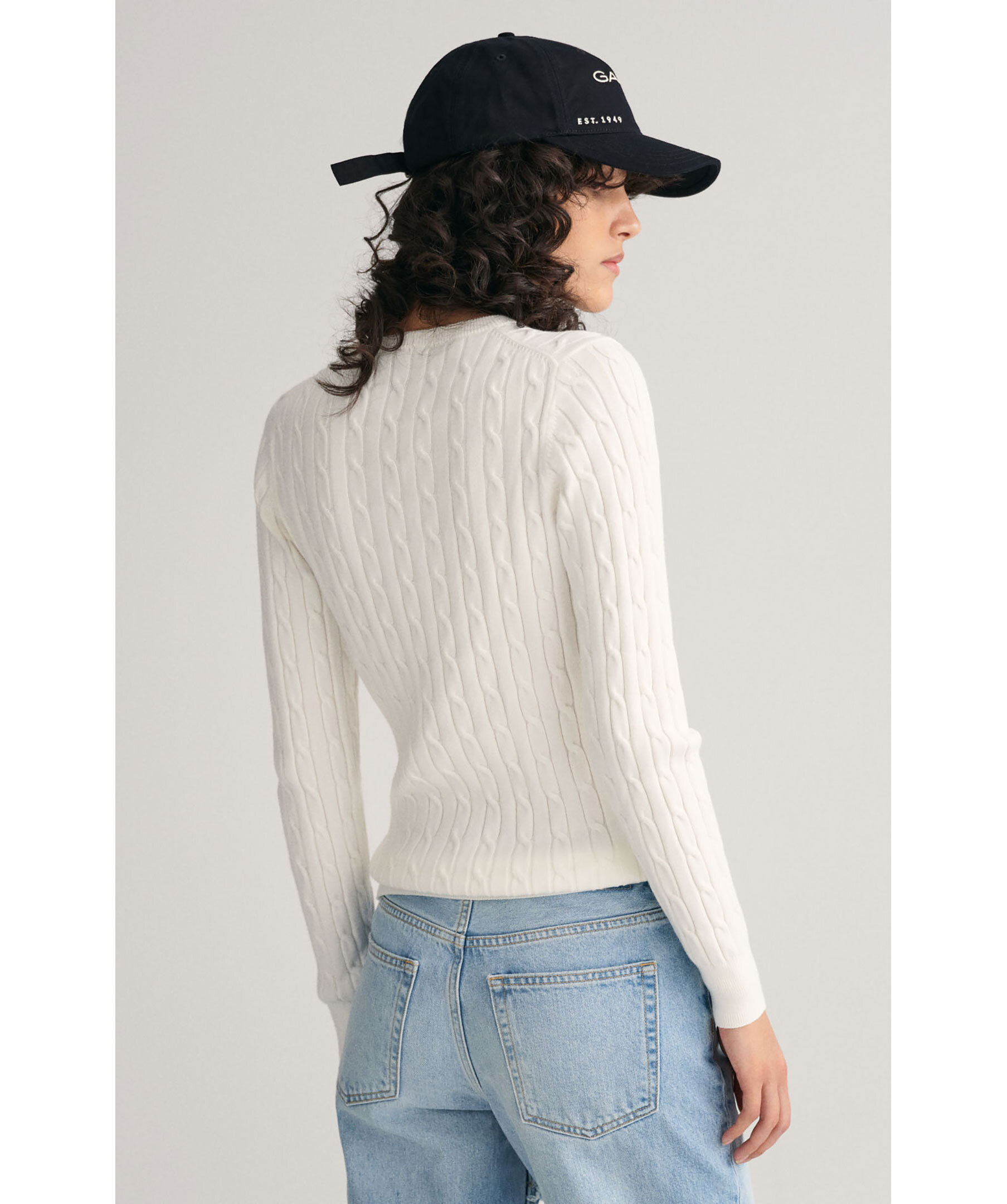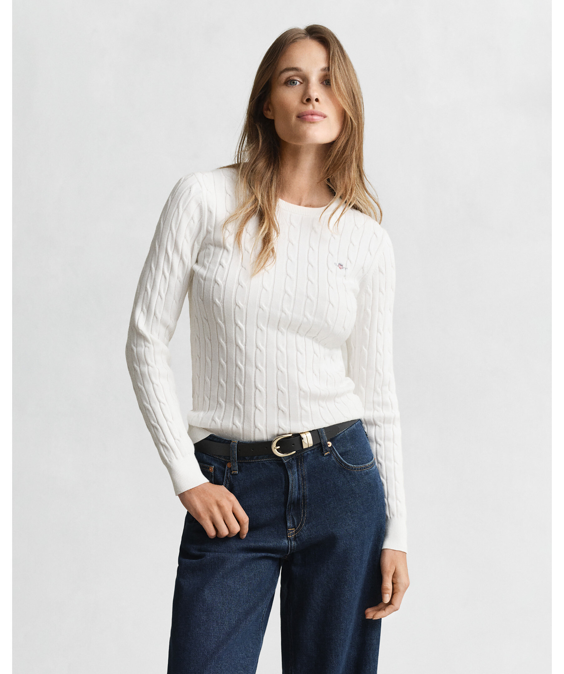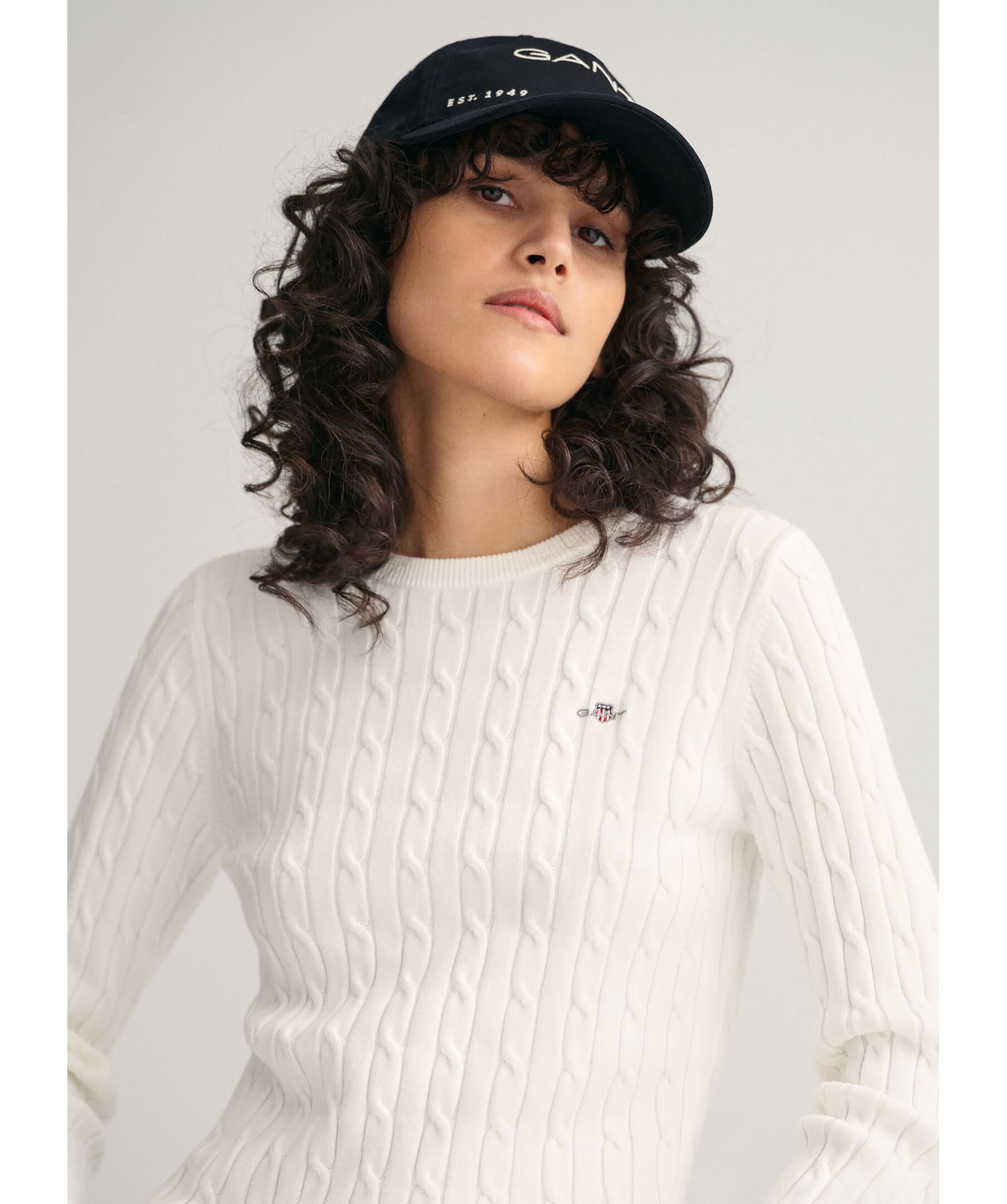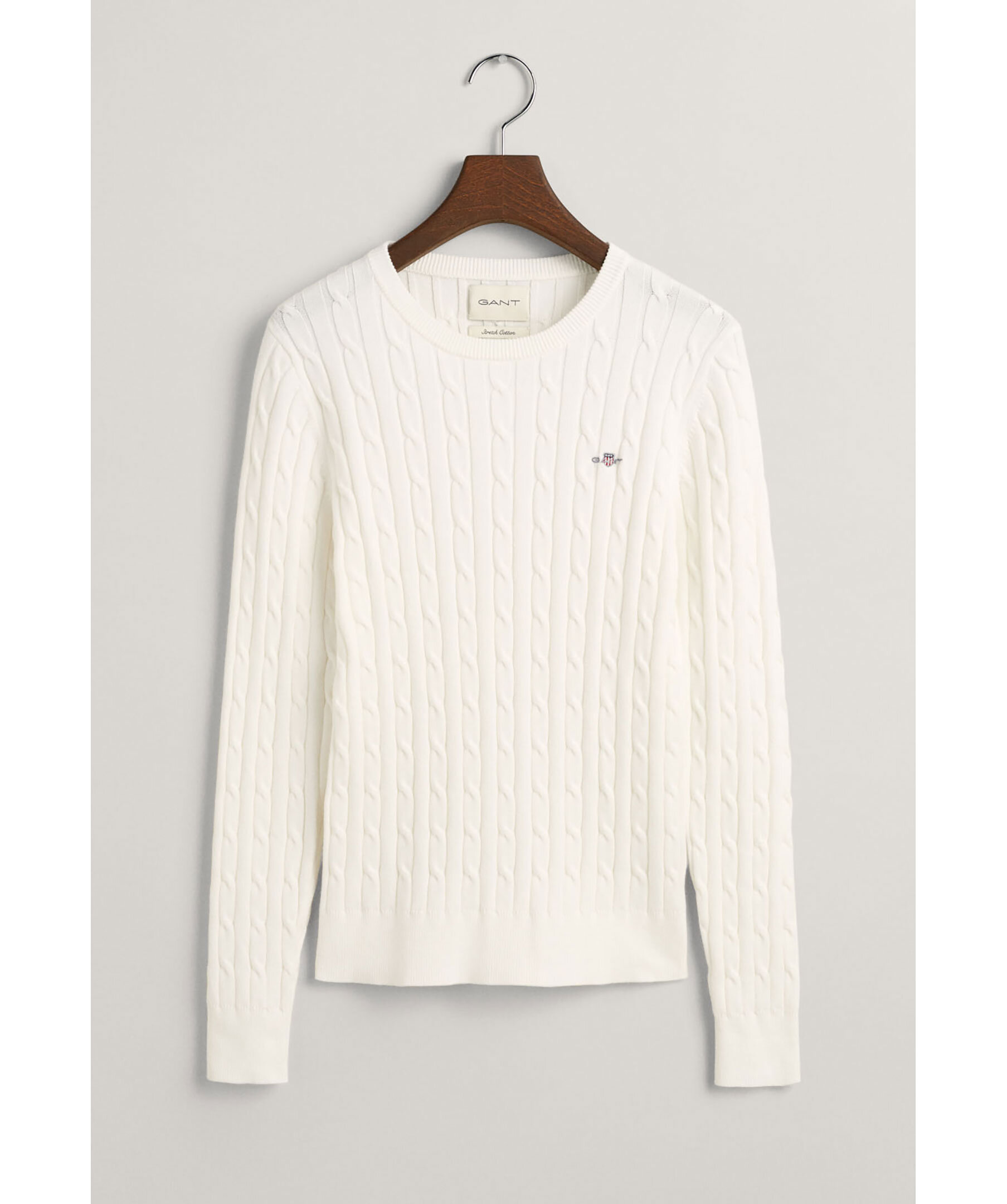 Klassisk vit kabelstickad tröja från Gant. Tillverkad i en mjuk bomulls- och elastanblandning. Tröjan har en smal och stretchig passform, klassisk rund halsringning, ribbstickade detaljer och deras klassisa sköld broderad på bröstet.