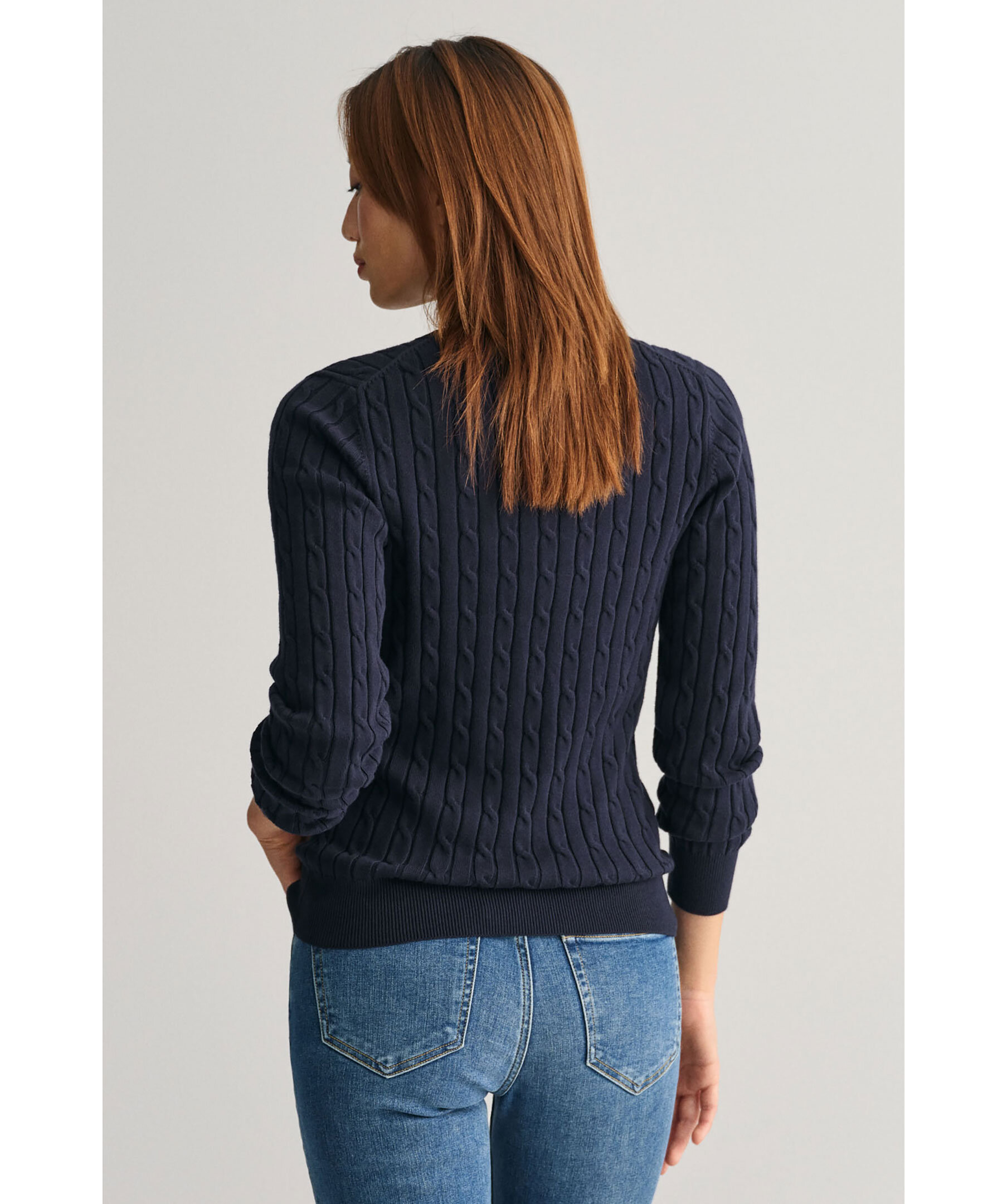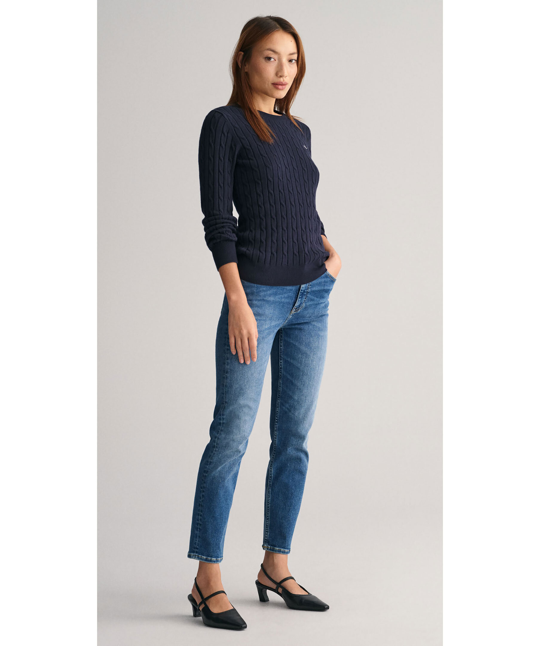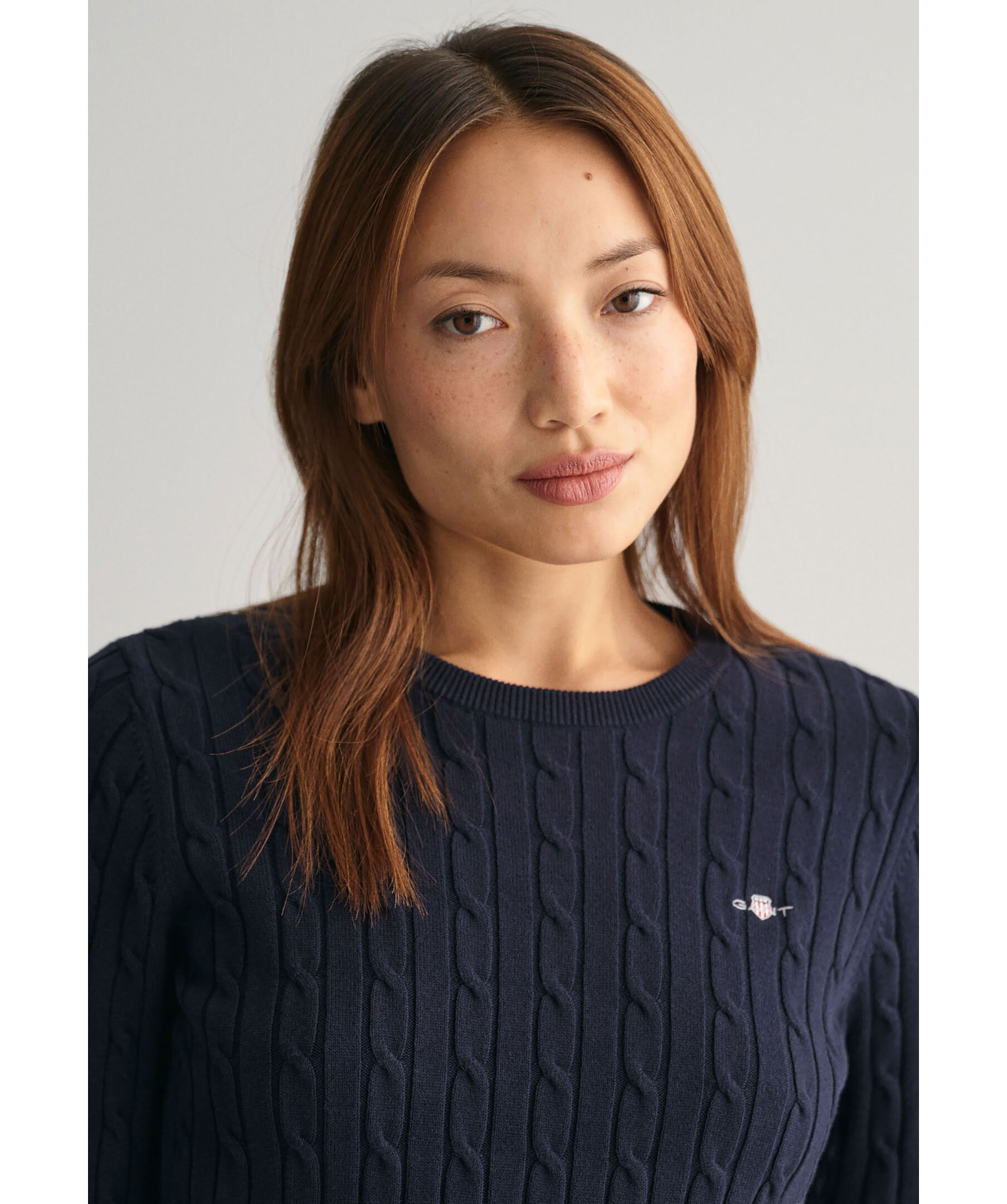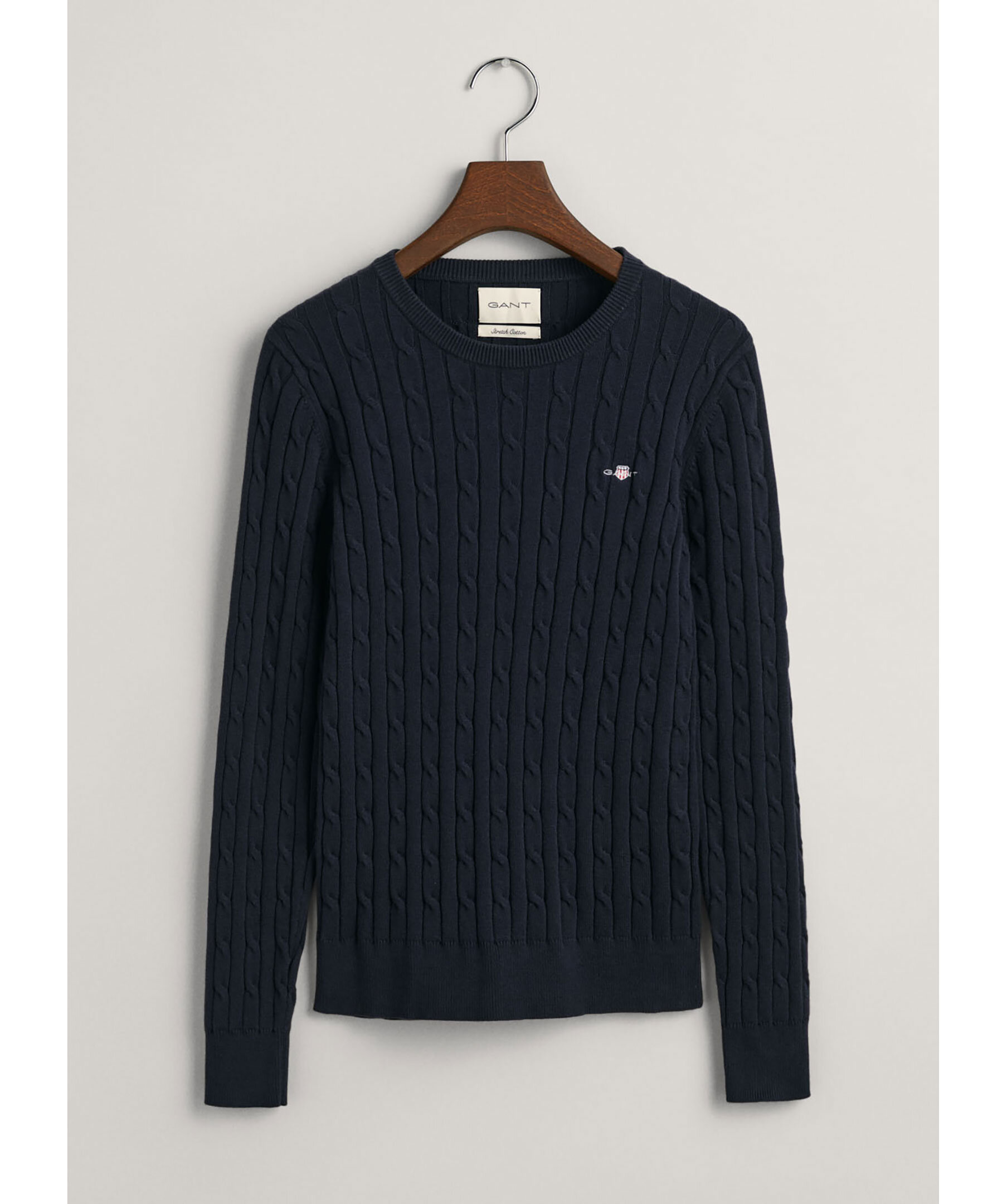 Klassisk mörkblå kabelstickad tröja från Gant. Tillverkad i en mjuk bomulls- och elastanblandning. Tröjan har en smal och stretchig passform, klassisk rund halsringning, ribbstickade detaljer och deras klassisa sköld broderad på bröstet.
