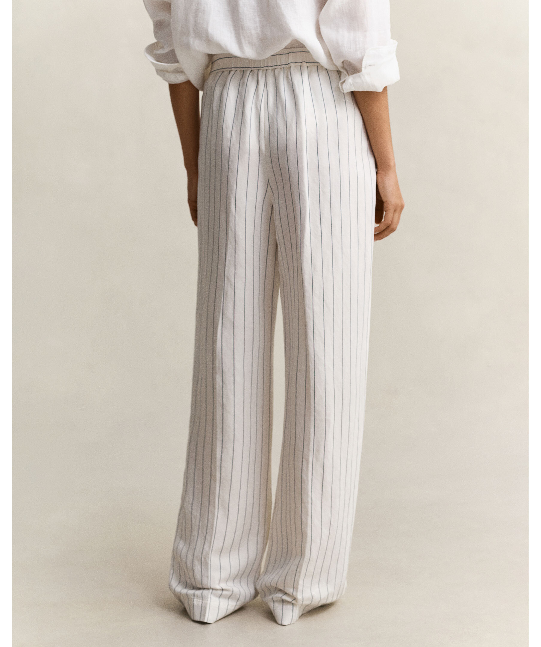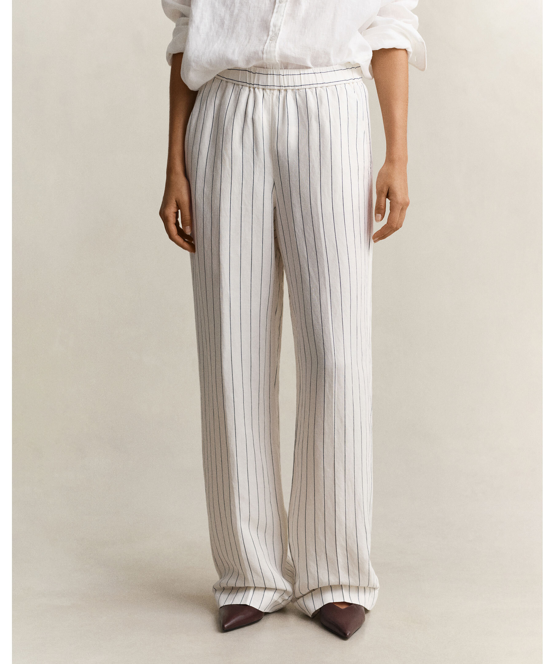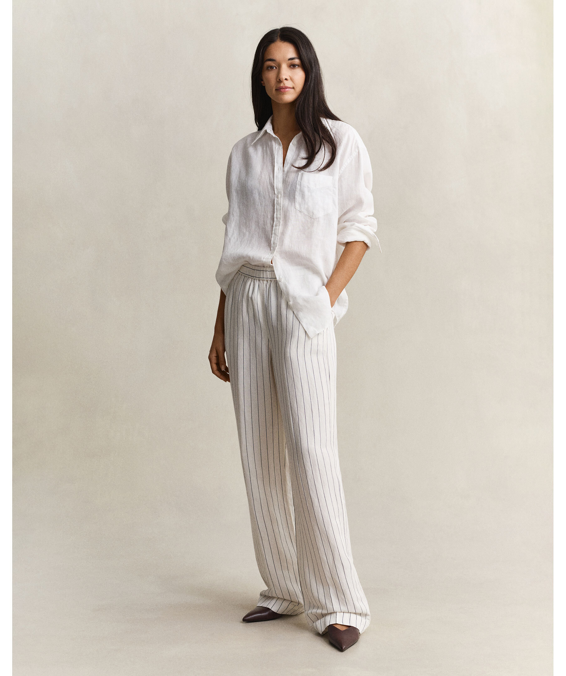 Randiga byxor från Gant. Tillverkade i en lin- och viskosblandning med mjukt fall och diskret lyster. De har en avslappnad, rak passform med medelhög midja samt elastisk midja med dragsko, snedställda framfickor, pressveck och uppvikt fåll med stickning.