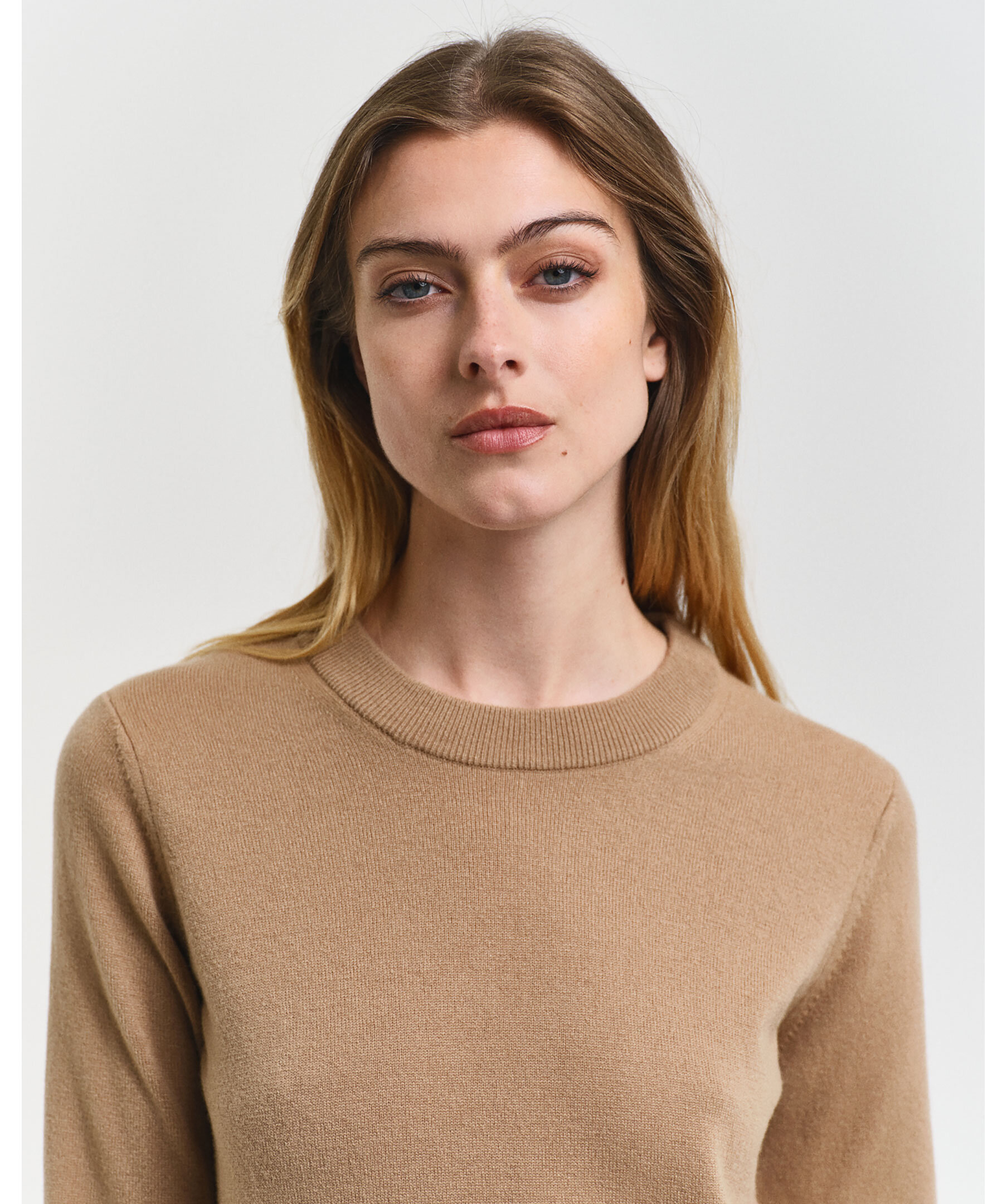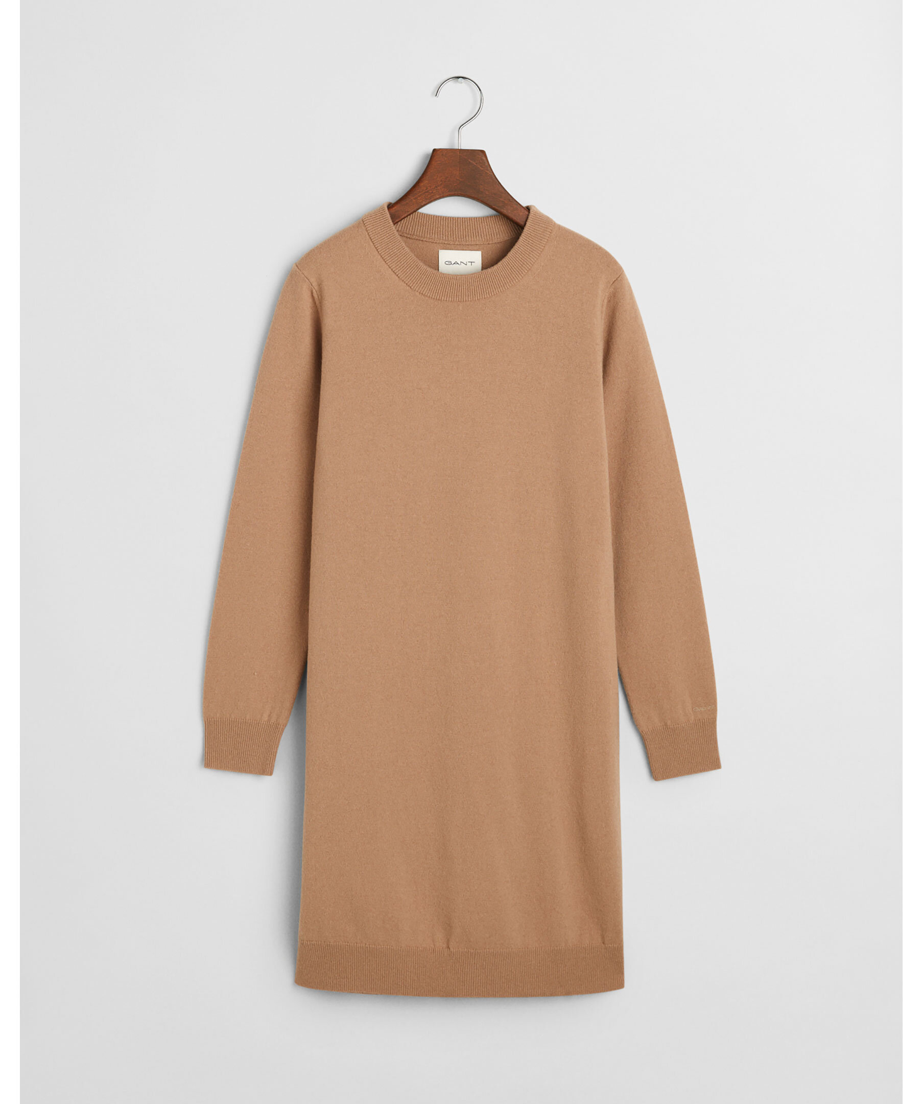 Beige stickadklänning från GANT. Klänningen är gjord i superfin italiensk lammull och har en normal passform. Knälång design med klassisk rund hals och detaljer som sidosprund, ribbstickade muddar i krage, fåll och ärmslut samt en GANT-logotyp broderad på ärmen.