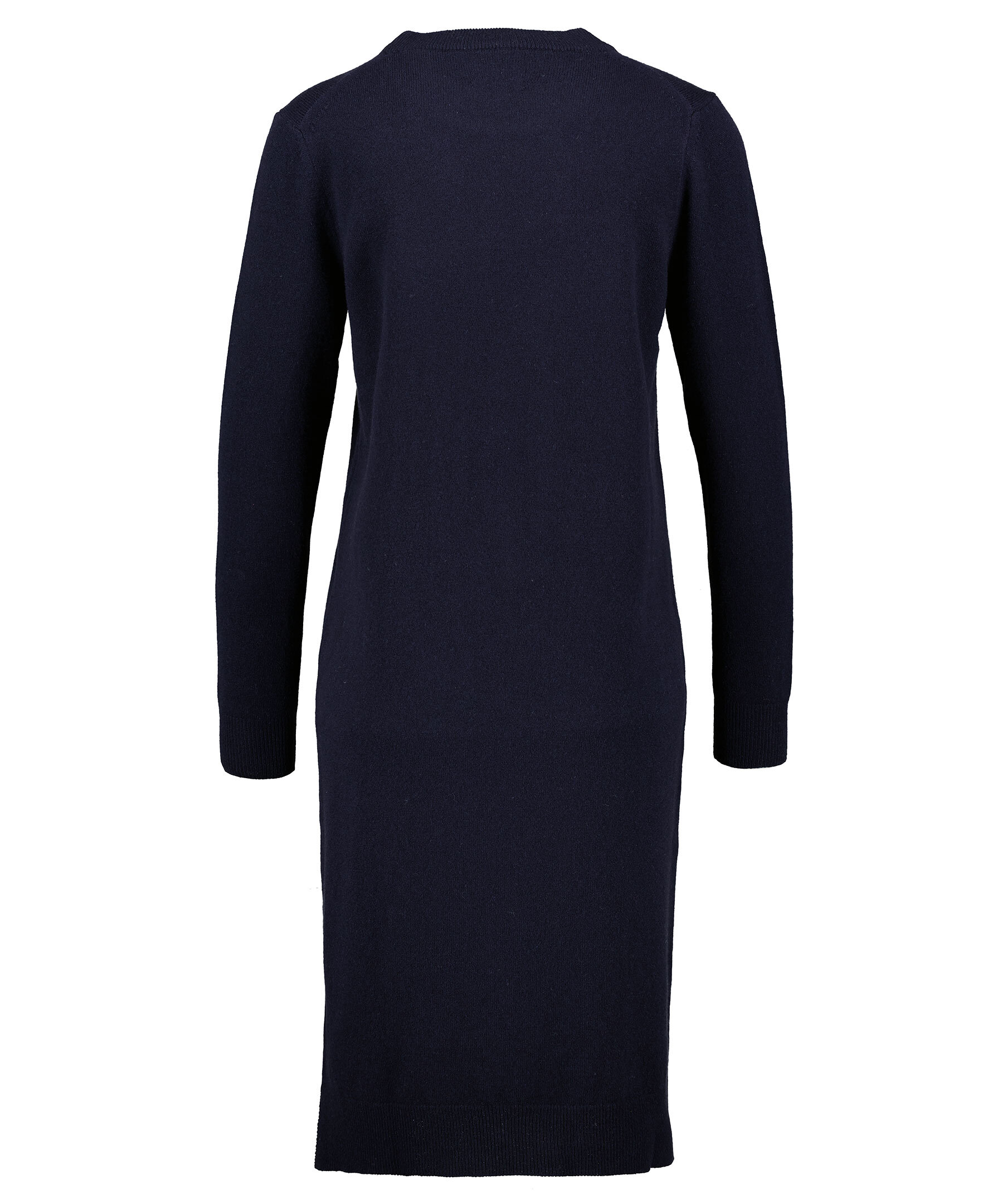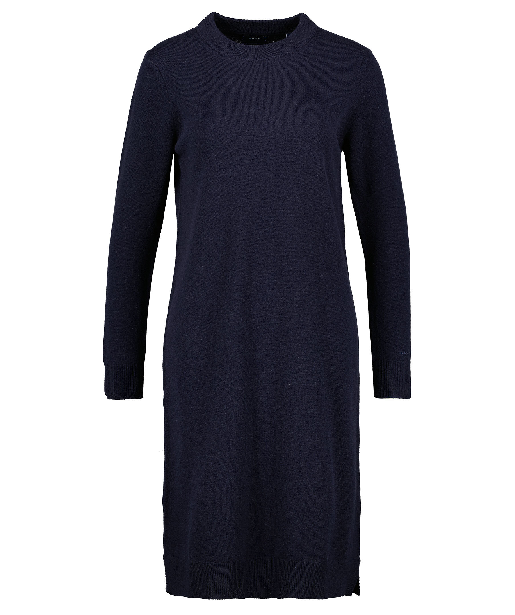 Marinblå finstickad klänning från Gant. Klänningen är gjord i ett fint ulltyg. Ribbstickade muddar vid halsringen, ärm- och plaggslut. Små sidoslitsar. Midilängd.