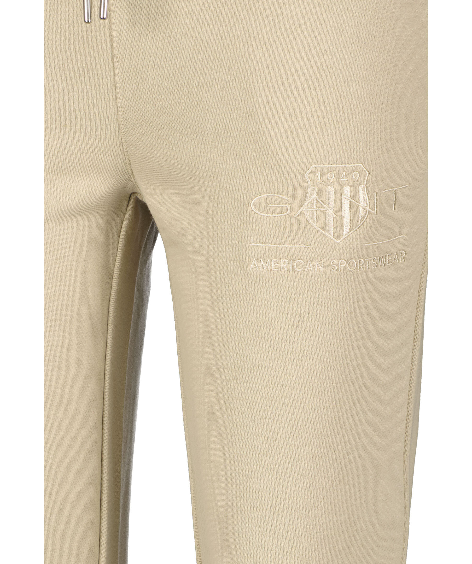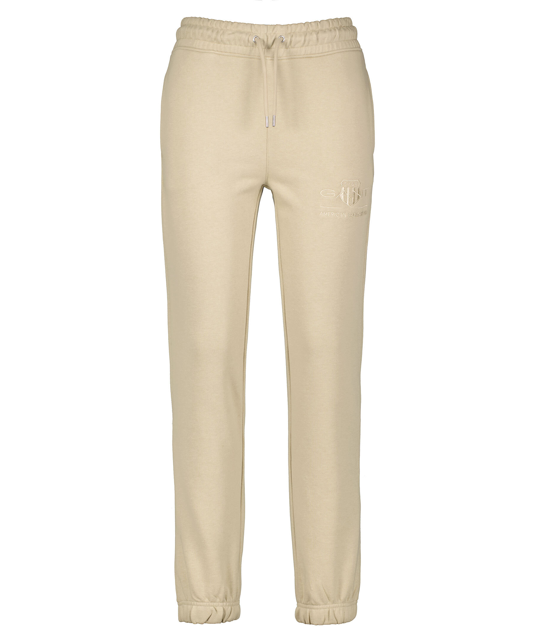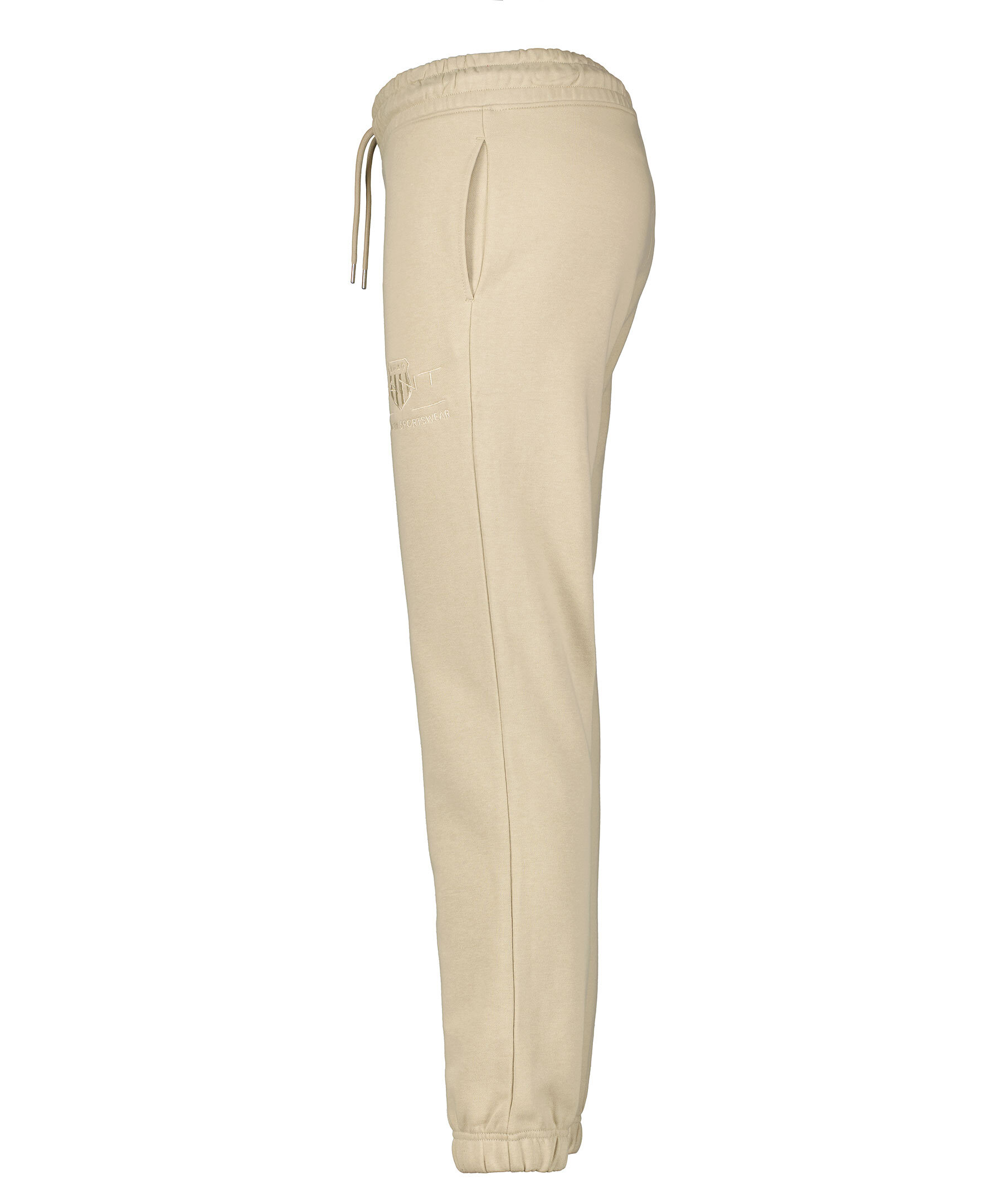ljust, beigefärgade mjukisbyxor från Gant. Mudd och snörning i midjan, muddar i benslut och två framfickor vid midjan. Brodyr med logga och sköld på vänster byxben. Tillverkade i bomullsblandning.