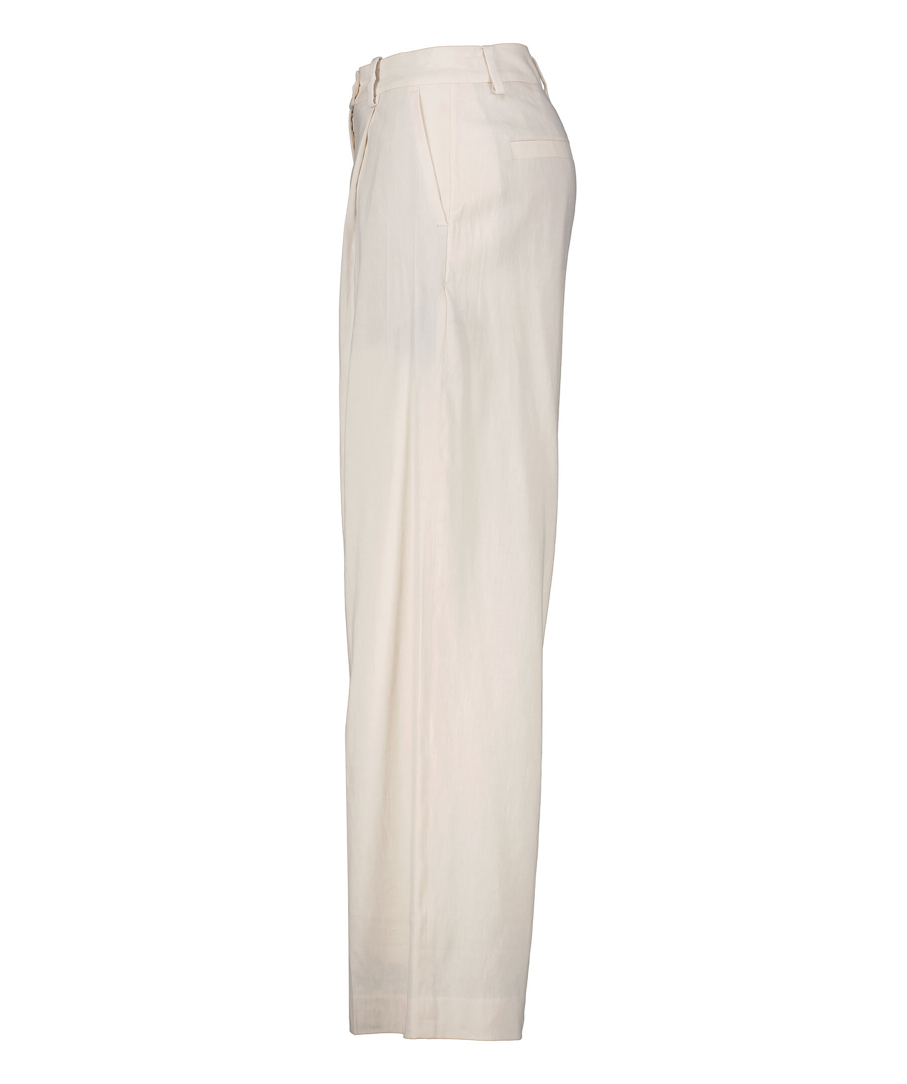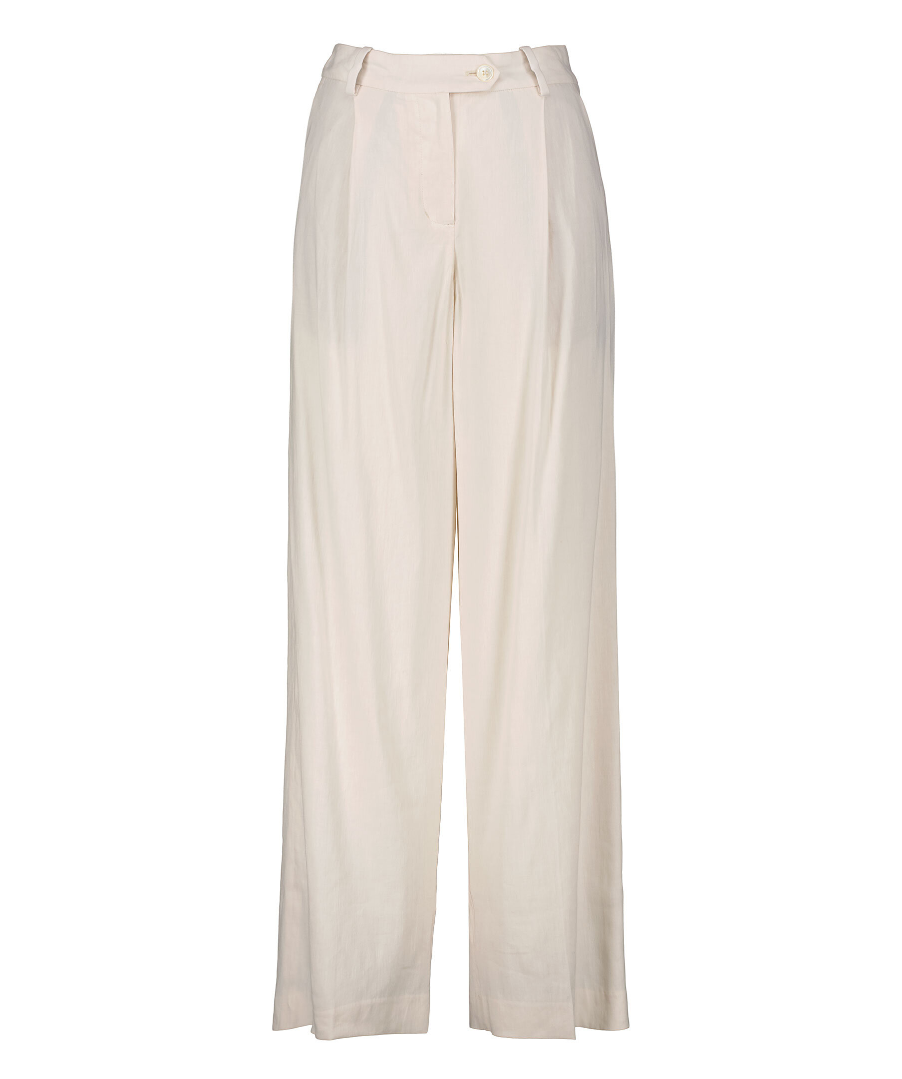 Krämvita byxor från Gant. Vida ben, mellanhög midja. Pressveck framtill. Två fickor framtill, två bakfickor. Hällor för bälte vid midjan. Tillverkad i linblandning.