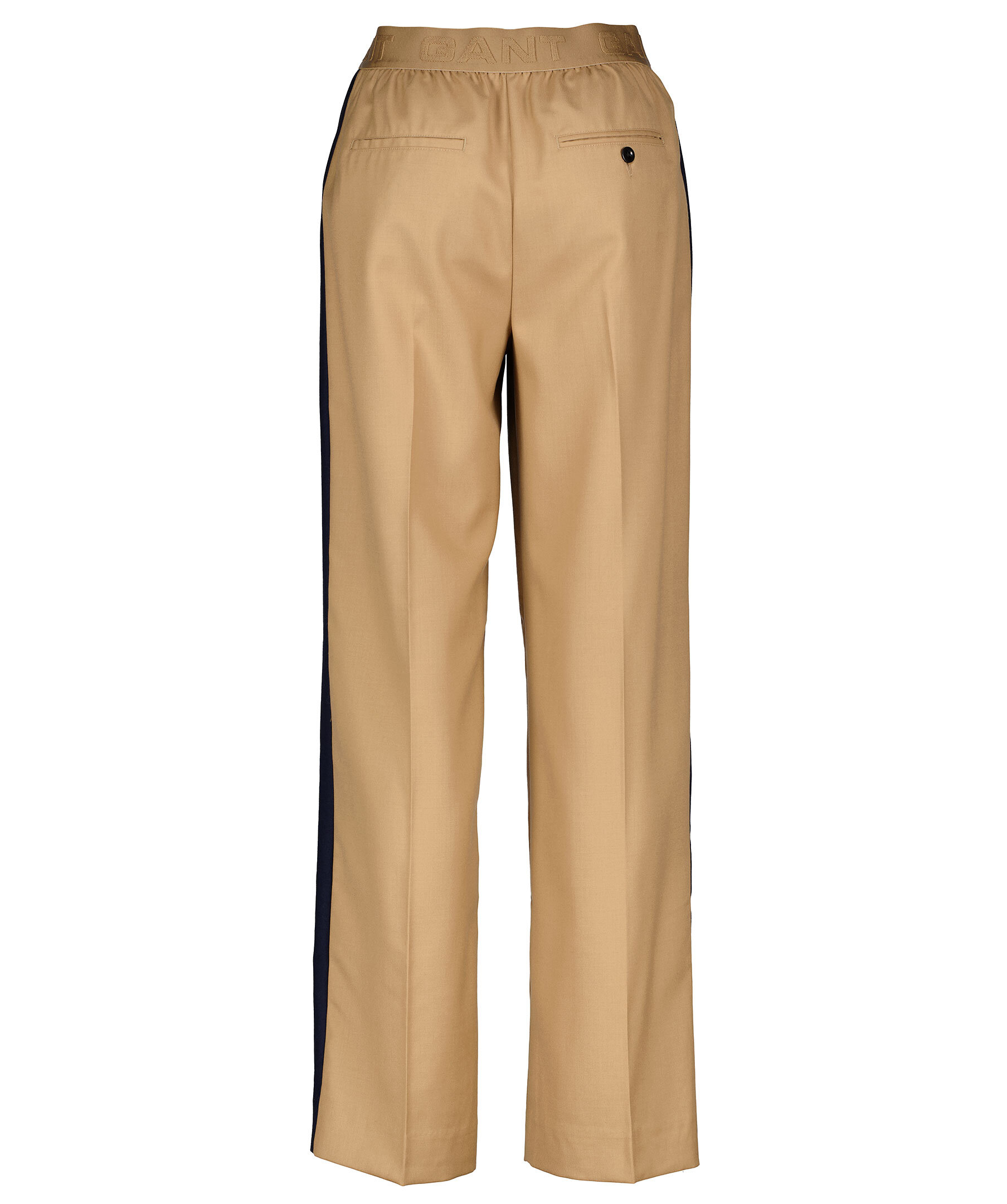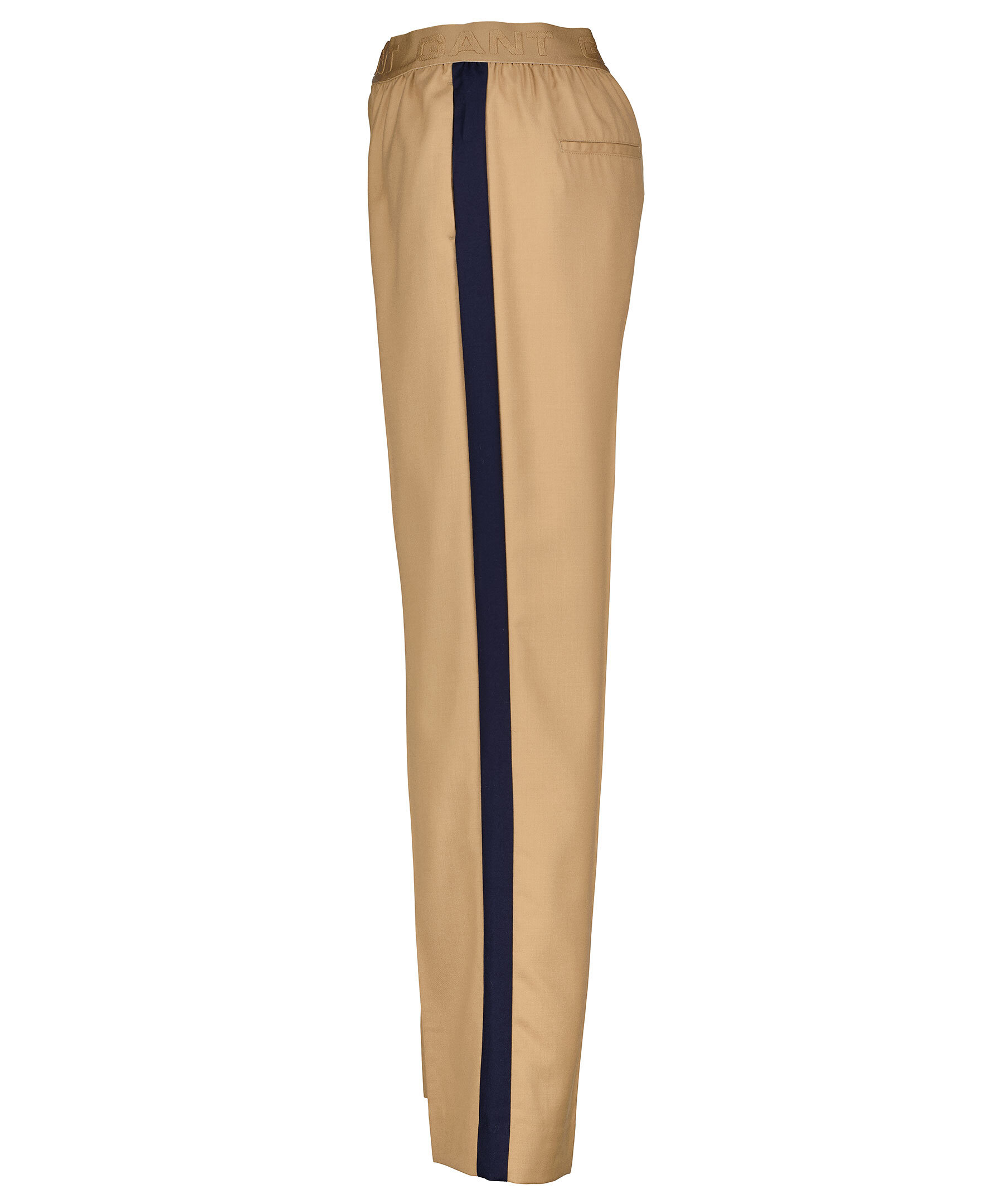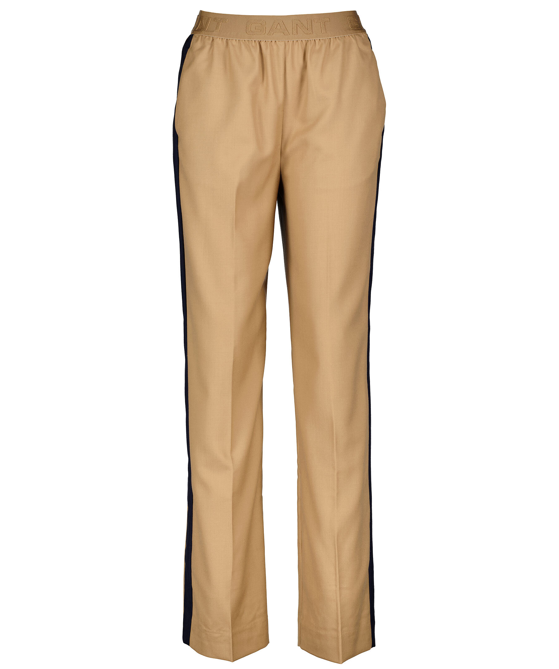 Kamelfärgade tunna byxor i en rak passform från Gant. Gjorda i en ullmix, mellanhög midja med resårband och ton-i-ton logotyper. Marinblå sidopaneler på båda byxbenen. En byxa som är perfekt till den sportiga eller den uppklädda.