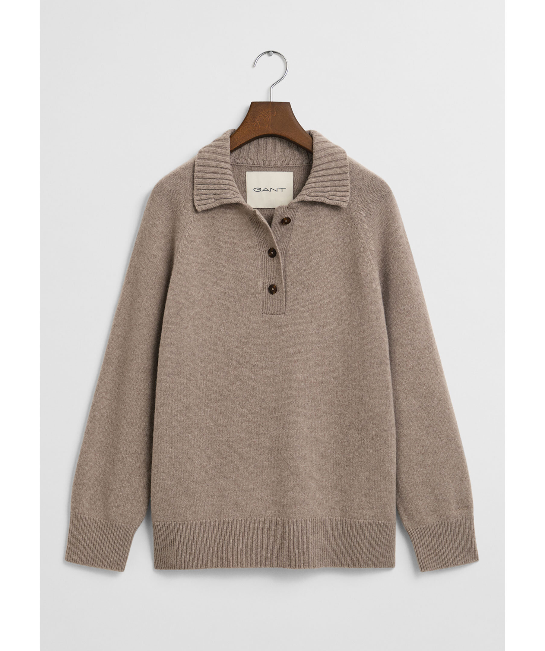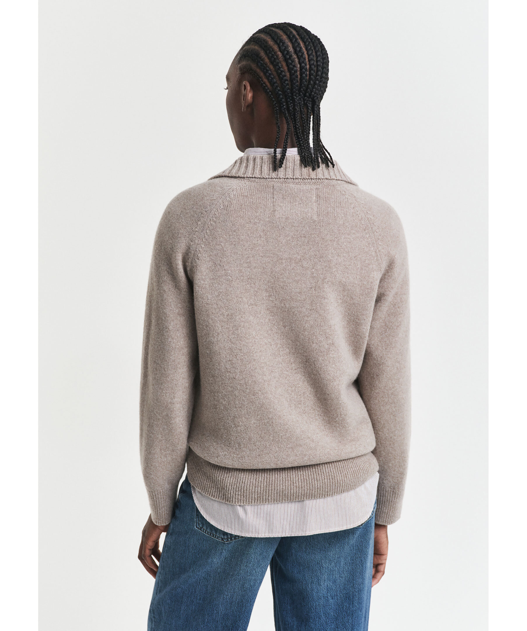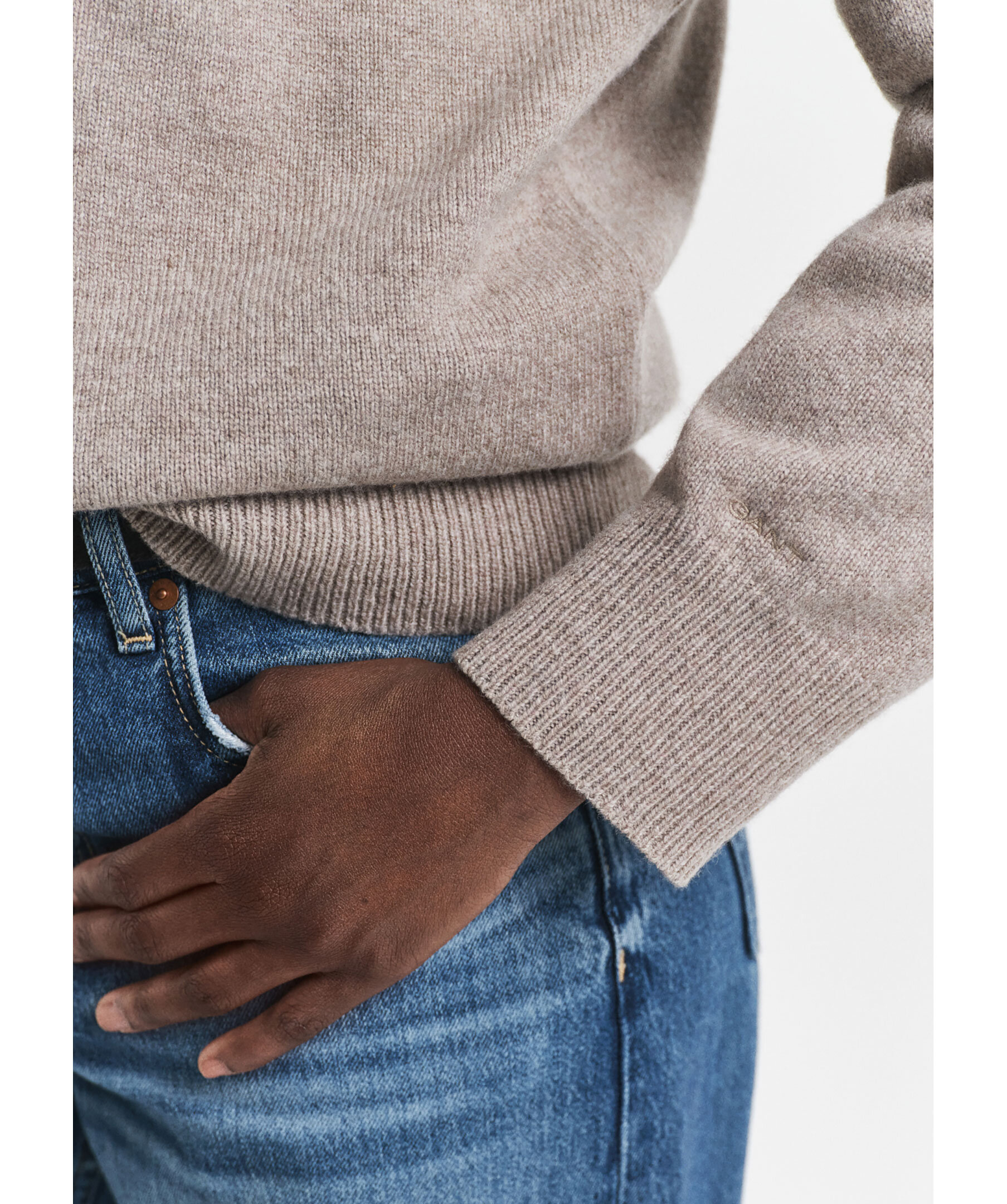Greige, långärmad, stickad tröja från Gant. Tröjan har knäppning vid halsöppningen samt ribbstickade muddar. Tillverkad i en blandning av mjuk italiensk ull och kashmir.