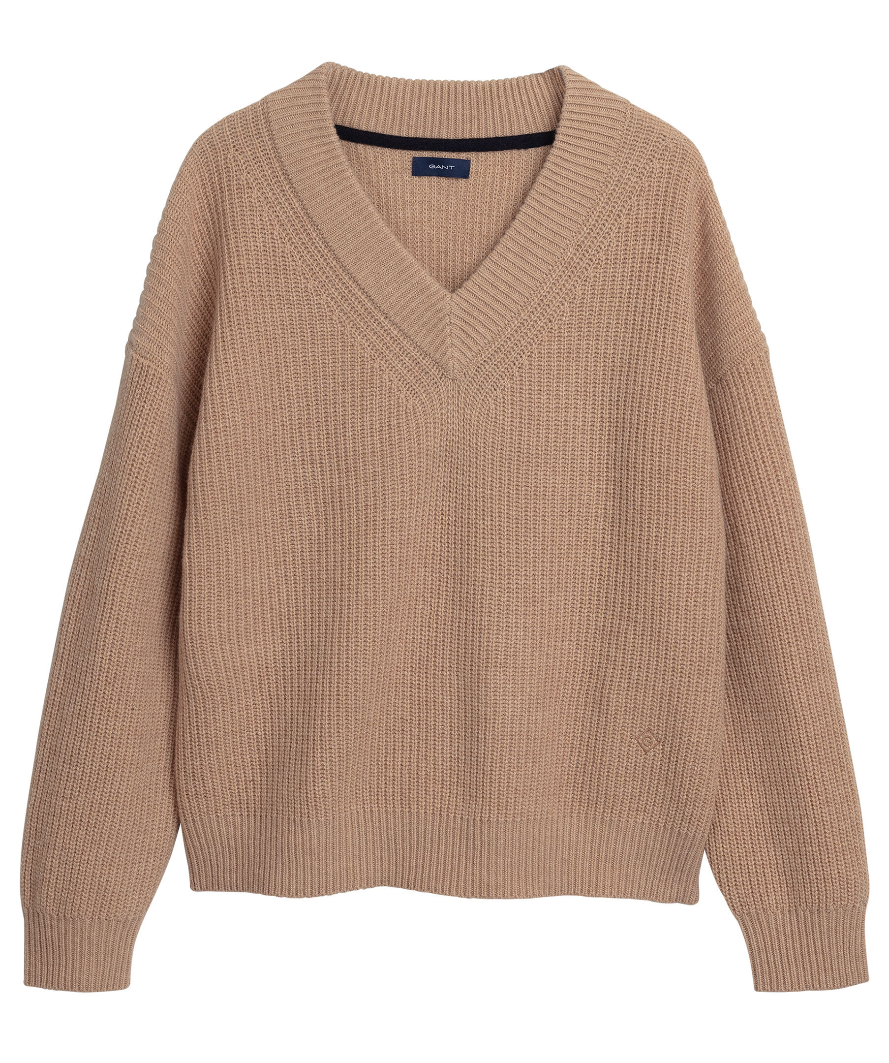 Beige ribbstickad tröja från Gant. Tillverkad i ullblandning. Rak modell med vid passform. V-ringad halsringning. Broderad logotyp ton i ton ovanför resåren.