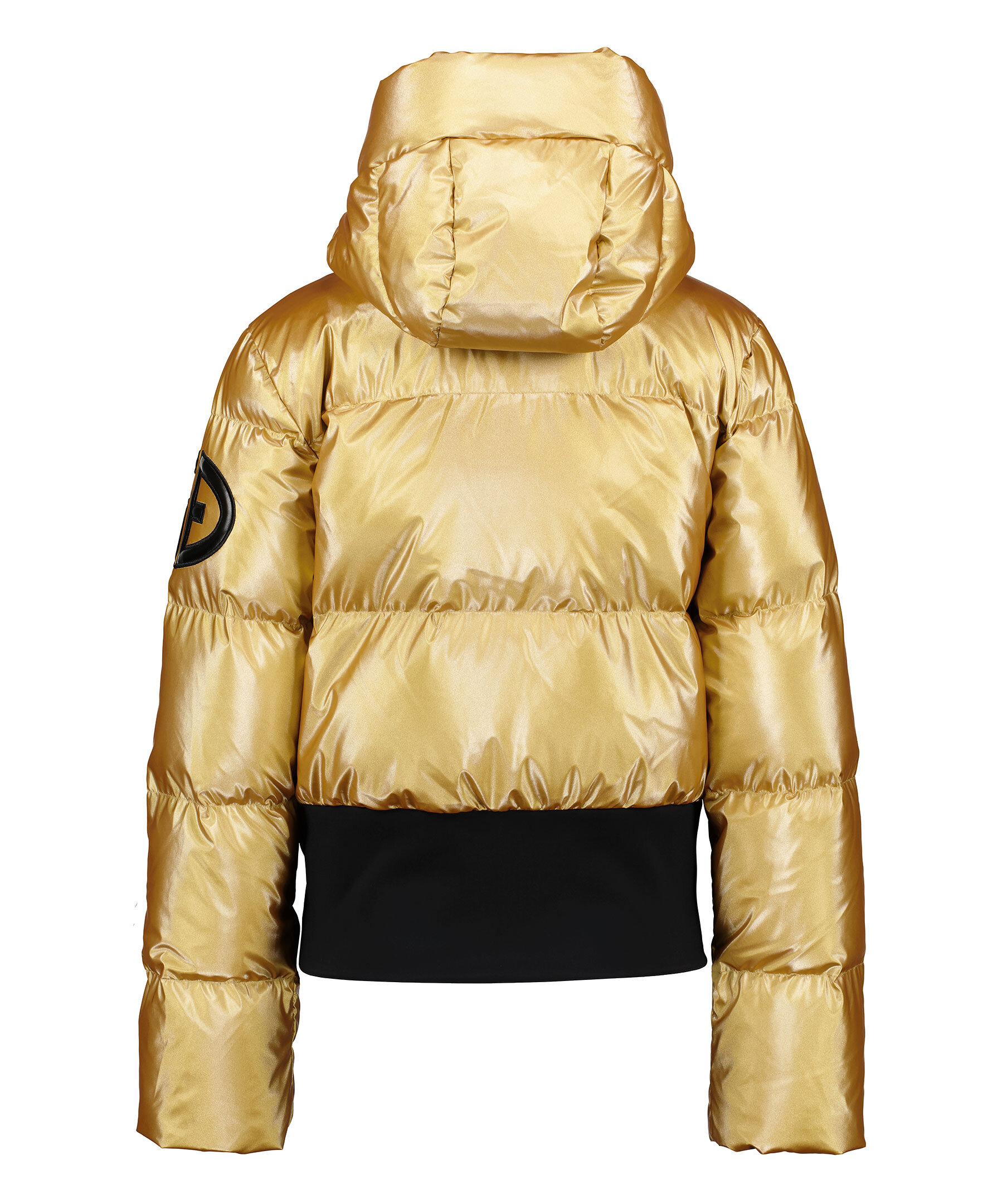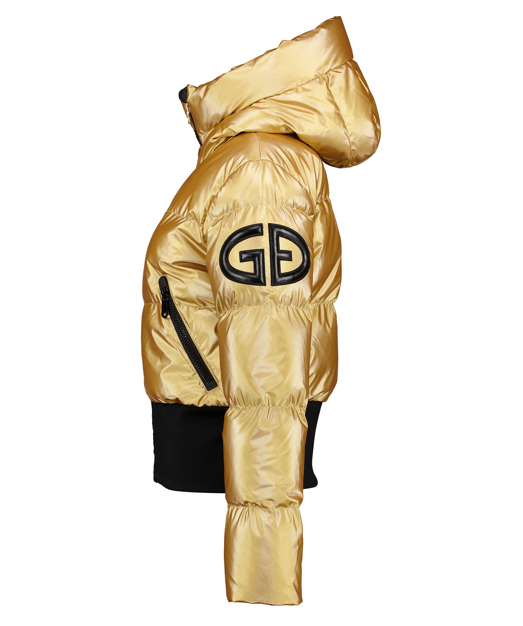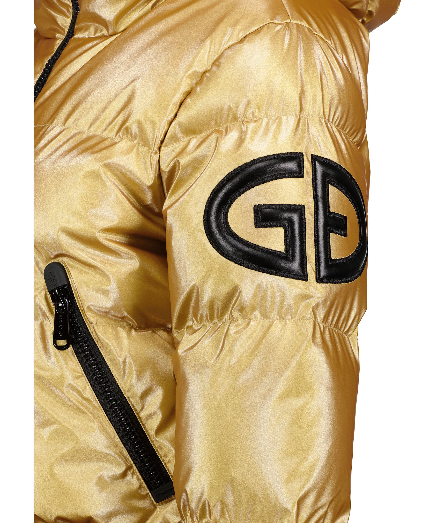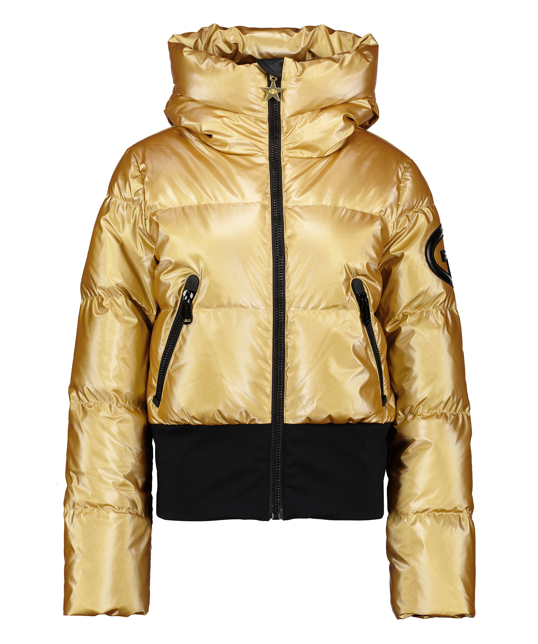Guldfärgad dunjacka från Goldbergh. Stängs framtill med dragkedja guldfärgad stjärna med logotyp på dragkedjan. Två snedställda fickor framtill som stängs med dragkedja. Bröstficka som stängs med dragkedja. Bred elastisk mudd vid plaggslut. Elastisk mudd vid ärmslut. Justerbar luva med dragsko. Stor logotyp i läder imitation på vänster ärm.